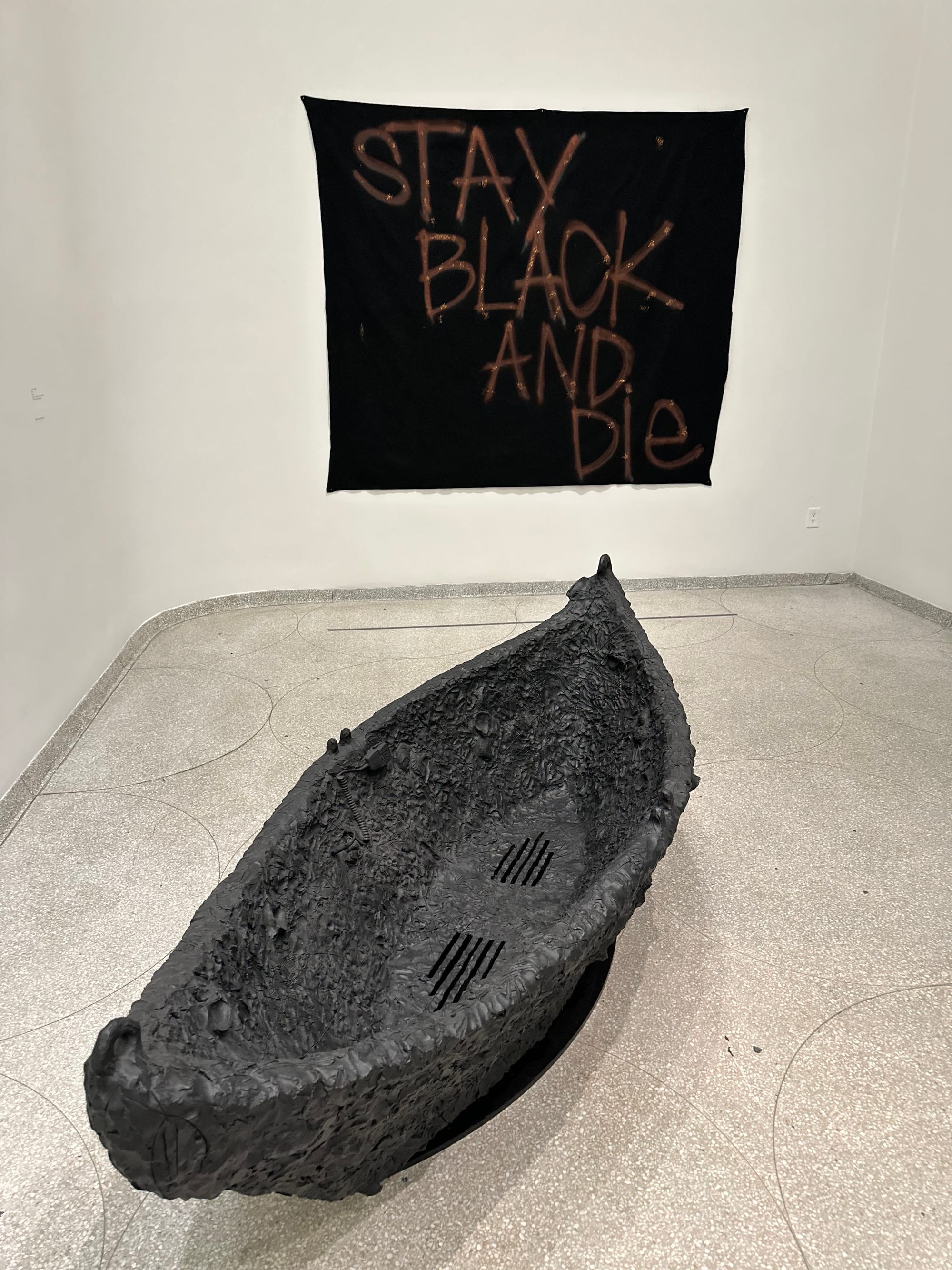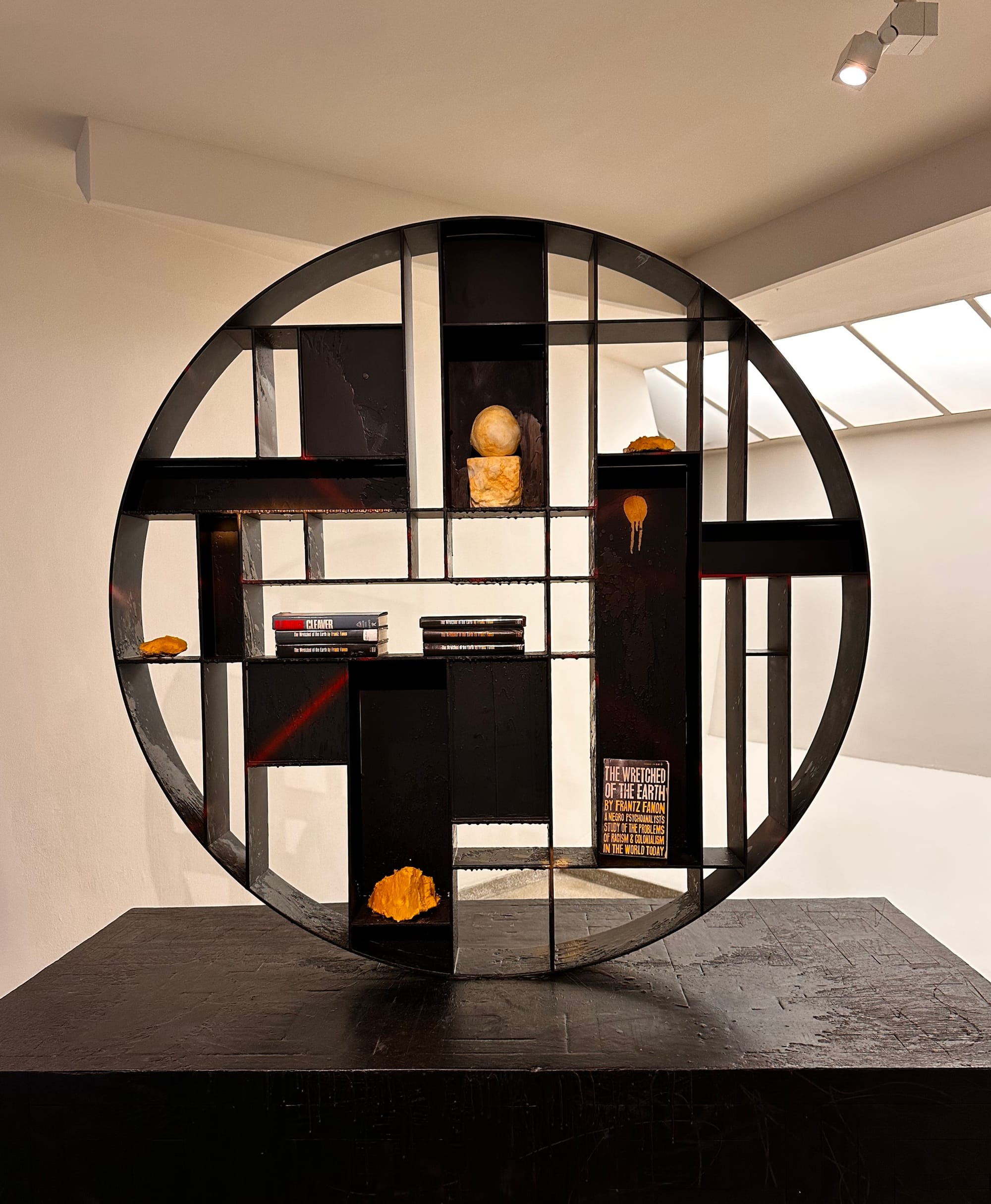 I am not sure how to square this idea with an exhibition that is deeply beholden to the idea of Blackness. It’s unclear whether these books are meant to signify meaning through their content, or whether their mere presence is meant to indicate serious thought.