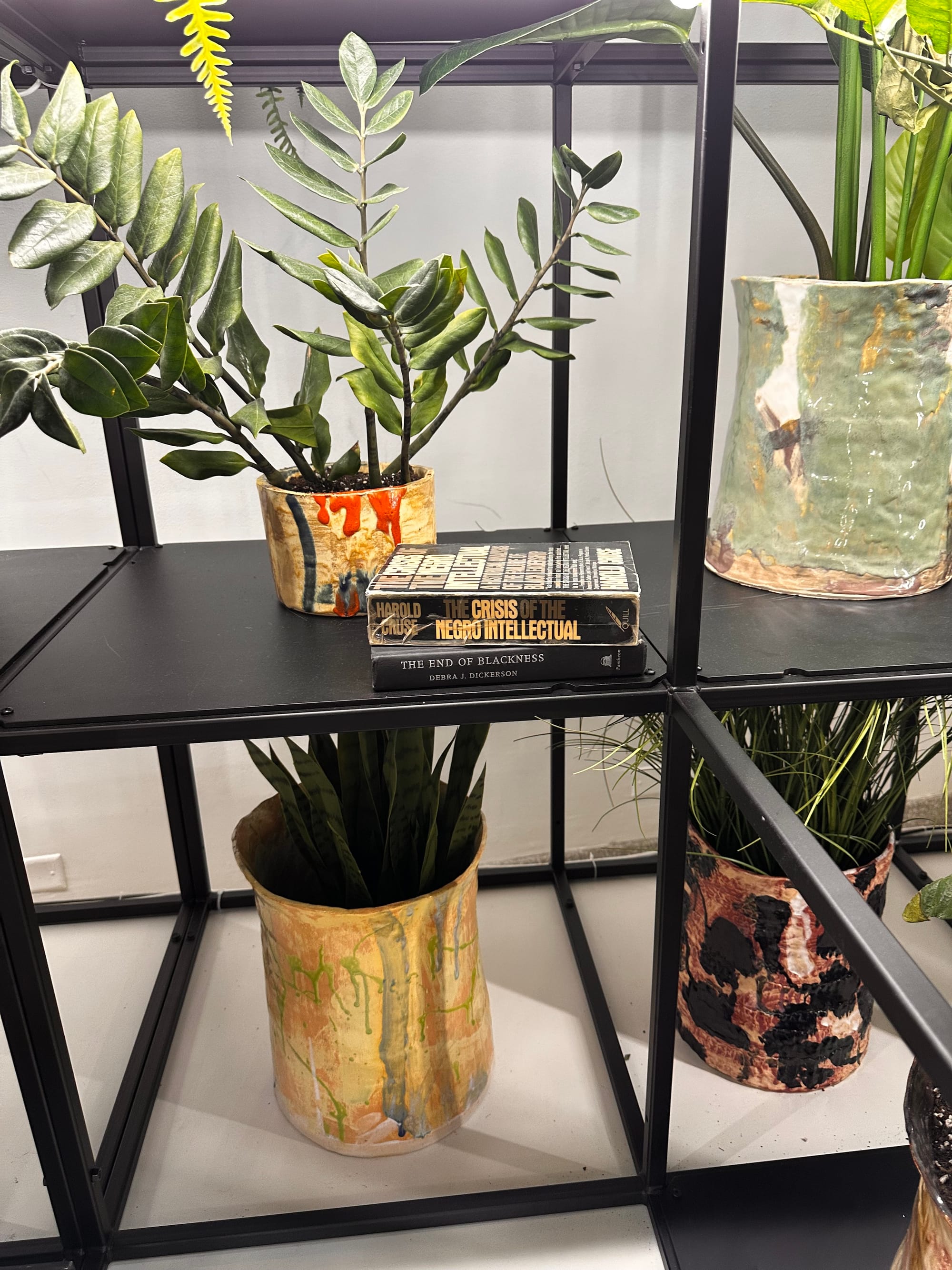 “Sanguine” consists of a steel armature in the nooks of which are nestled books, ceramics, video monitors, grow lights, plants, and shea butter. The piece operates at the intersection of a living space, a library, and a garden, an idea I adore, because it melds spaces that are typically seen as having nothing to do with each other. The wall label describes it as a “‘house’ of creativity and a dynamic container for ideas,” which I don’t understand since no particular house is ever creative. People are, and no structure holds ideas; people do, and sometimes so do books. Yet, this mashup of potent signs pointing to domestic life, studious attention, and some kind of growth doesn’t tell me what Johnson thinks about this life, what serious attention yields, or what specific directions this growth takes him in, aside from a general exploration of Blackness.