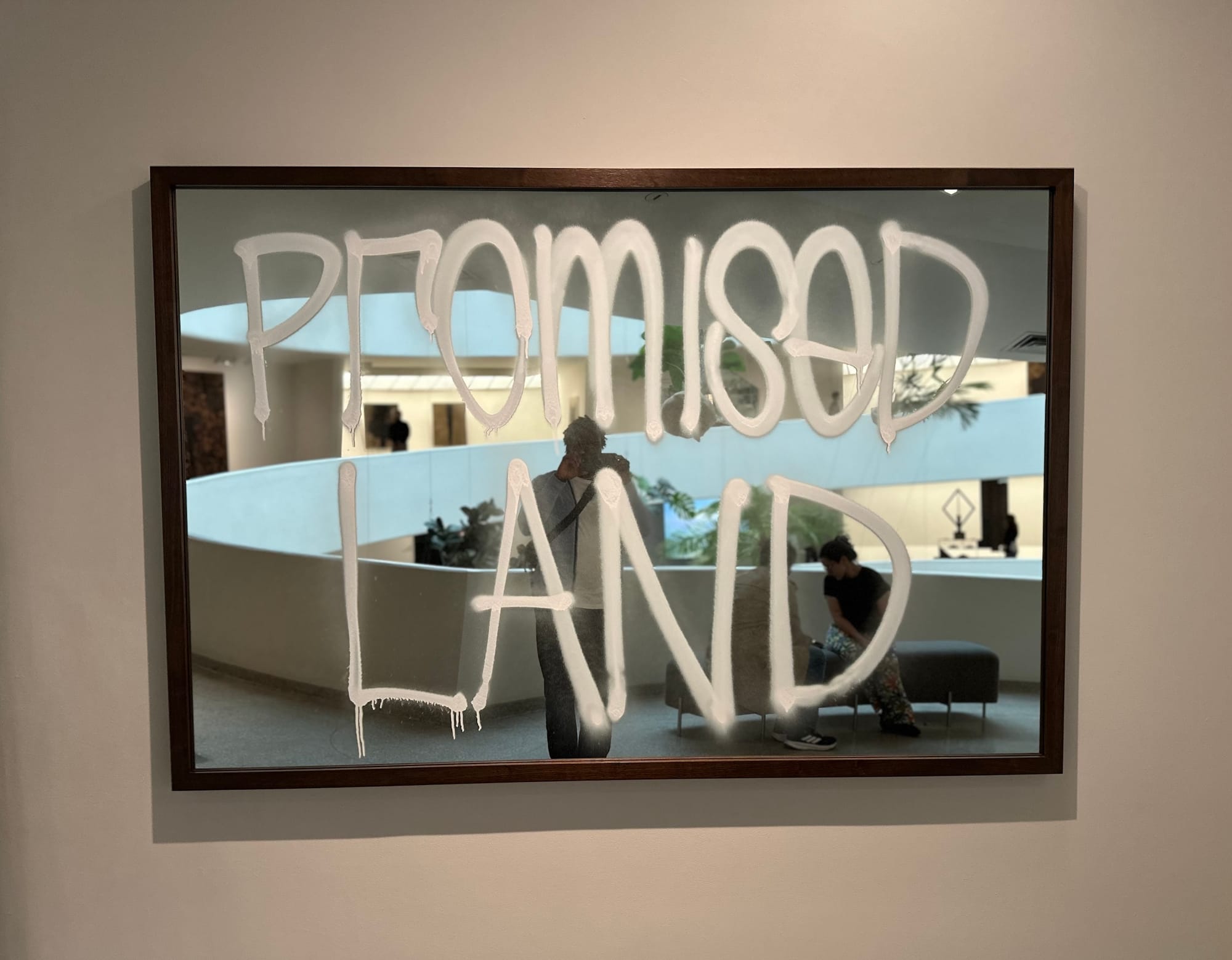 I don’t find it in the aphoristic phrases drawn by hand on mirrors, such as the 2008 spray enamel pieces “Promised Land” and “Run,” and the 2010 “Fly Away.” These are fairly simplistic imperatives and descriptives. The idea of a promised land is embedded in the Black Christian lexicon and fuels some of the resentment for the lack of reparations legitimately due to the Black community of the US. These are powerful words. They link to actions and ideas that shape the experience of the majority of Black people here, even if like me they are immigrants. We have done a lot of running — in athletic competitions, political contests, academic settings to prove our worth. Once, Black people ran from slave catchers for their survival. We have often wished to fly away from unjust circumstances. But it’s not clear how these terms apply to us right now. Johnson is not recontextualizing these forceful phrases enough to evoke a particular, unique meaning, but instead relying on their historical potency to do the work for him. What are we supposed to run from or toward? What does the promised land look like? How will we recognize it?