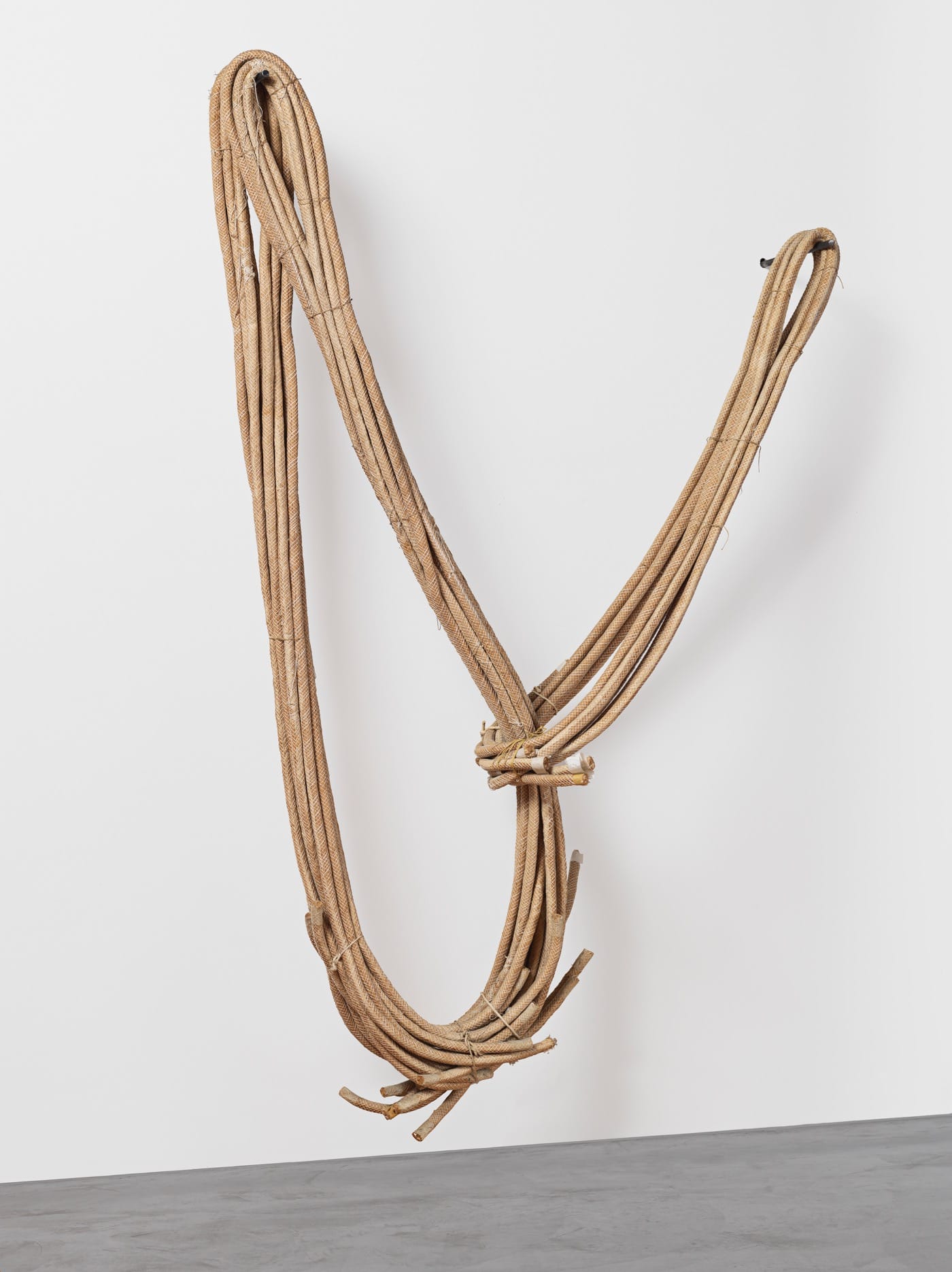 There is a poem by Robert Creeley, “The Mechanic,” which came to me as I looked at Françoise Grossen’s exhibition at Blum and Poe, New York. The essential lines of this brutally tight lyric are: “Were we now to fall / to our stubborn knees / and sink to rest, my / self sunk in yours, then / what would hold us / together but uninteresting / weight. Do you believe.” I think of what makes weight interesting, or better yet crucial, when I look at Grossen’s “Gamma (Signe II),” a work from 1993 that consists of just two metal pegs shoved into the wall, what the gallery describes as “natural paper piping cord,” and tape. There are two discrete cords, each is looped and hung from one of the metal pegs and each is hooked through the other’s loop. They are, like the putative lovers of Creeley’s poem, intimately connected, but not fallen. Each is still held off the floor and little away from the other by those unmoving stakes in the wall. They are at enough distance from each other to pull, to keep the other in a state of active suspension. In other words, they are keeping each other honest. In other words, the way their weights pitch against each other remains compelling, stays crucial.