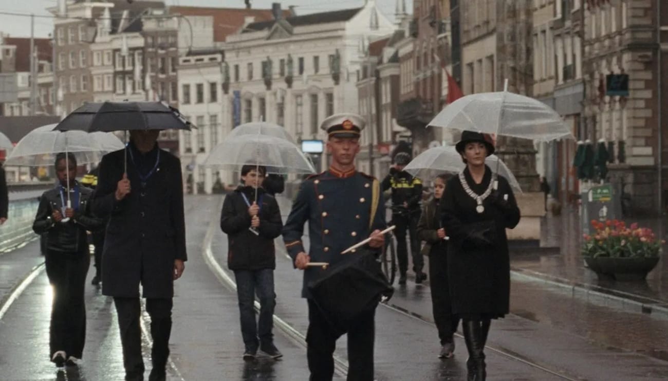 As in Shoah, there are no corpses in Occupied City. The primarily residential addresses — or occasional mentions of demolitions and the images of urban structures replacing them — speak to the lives eradicated. Yet McQueen takes Lanzmann’s idea of metonymic substitution further, not only by using the present city to speak of the past, but also by depicting Amsterdam’s streets and public gatherings during the COVID-19 lockdown. The latter bid is particularly effective. Amsterdam during COVID is a ghost town. So while McQueen’s gesture seems incongruous — conflating one historical context with another — the dual temporal frame allows him to delve into the emotive aspect of urban space. What is it like to experience a city that’s emptying out? To not only imply absence, but actually feel losses as they accrue?