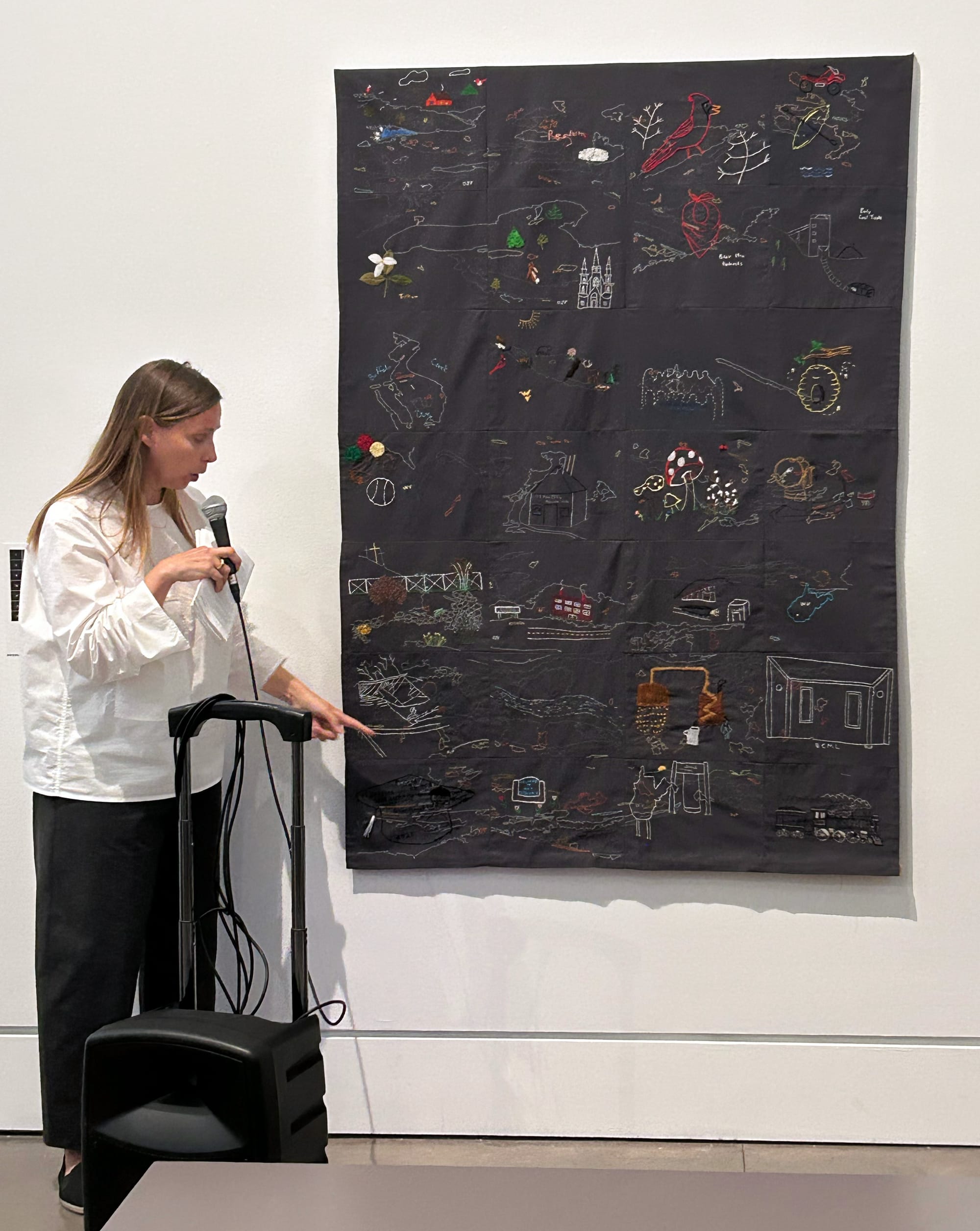 The textiles offer one way forward. “Buffalo Creek Therapy Quilt 2025” (2023–25), for example, was created with West Virginia residents Karen Arms, Doris Frazier, Crystal Hicks, Presleigh Mounts, Vicki Padgett, Joyce Perry, Barbara Smith, Liz Tackett, and Priscilla Thomas at the local library, where the artist offered embroidery workshops. It’s inspired by a quilt held in the West Virginia State Museum, which another group of women made shortly after the 1972 disaster. In it, each block portrays one of the 16 towns that were destroyed that year. The newer version references schools, landmarks, miners’ helmets, and aerial views of mines, among other images. While there is, of course, a long history of quilts that merge therapy and art and engage with craftivism, such as the AIDS Memorial Quilt, this piece functions slightly differently. As an echo of a previous community-led endeavor, it refuses historical amnesia by underscoring how the past repeats. A standout work in this judicious show, it becomes an emblem of West Virginia as well as a symbol of love, heartbreak, and, ultimately, survival.