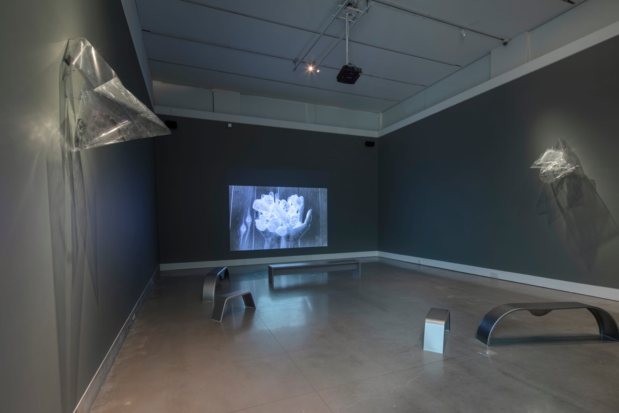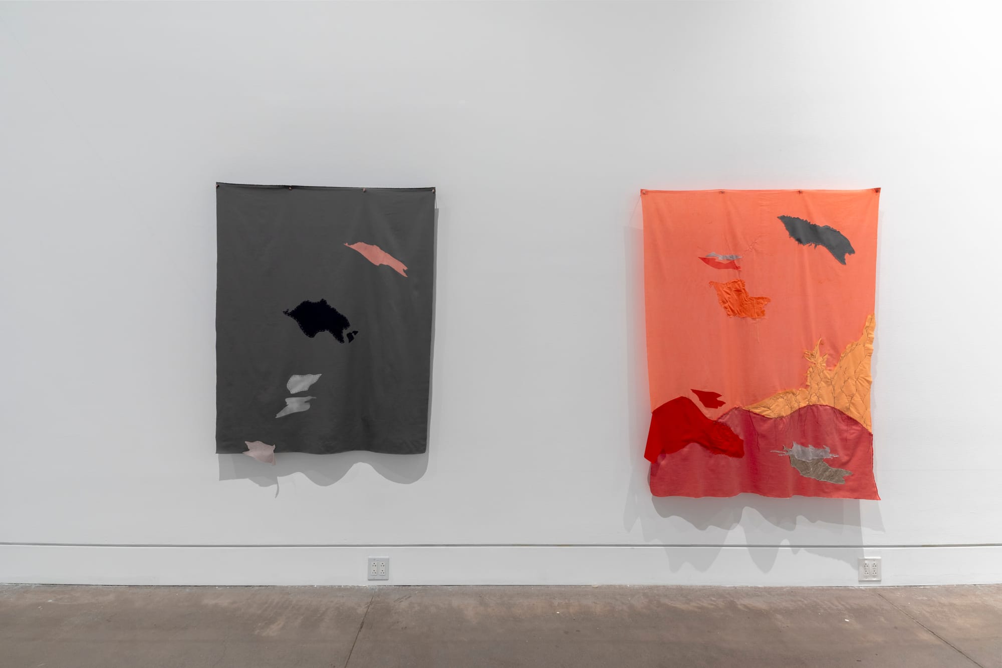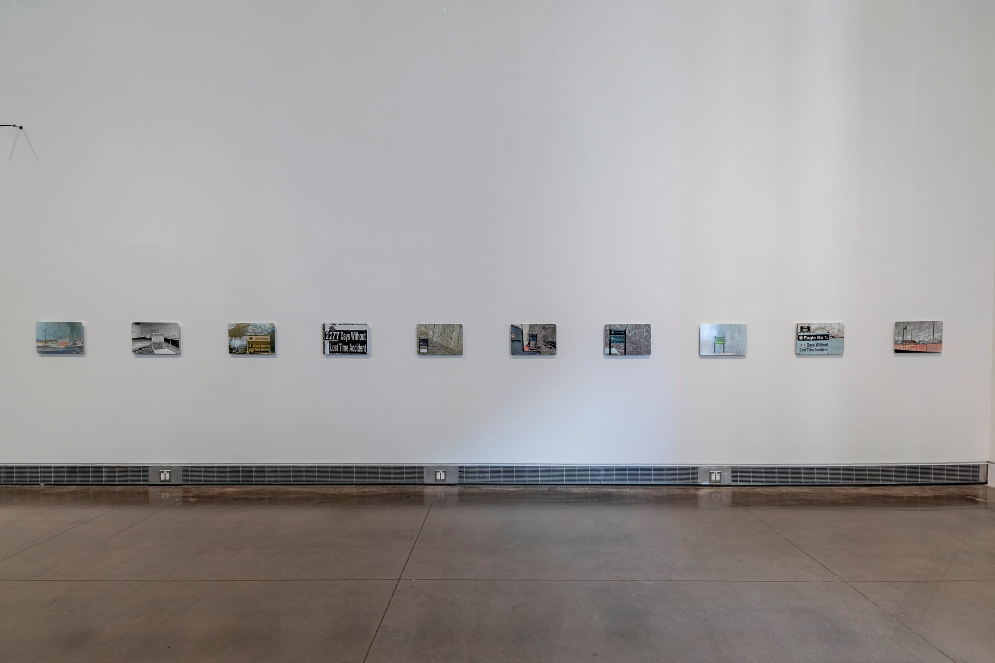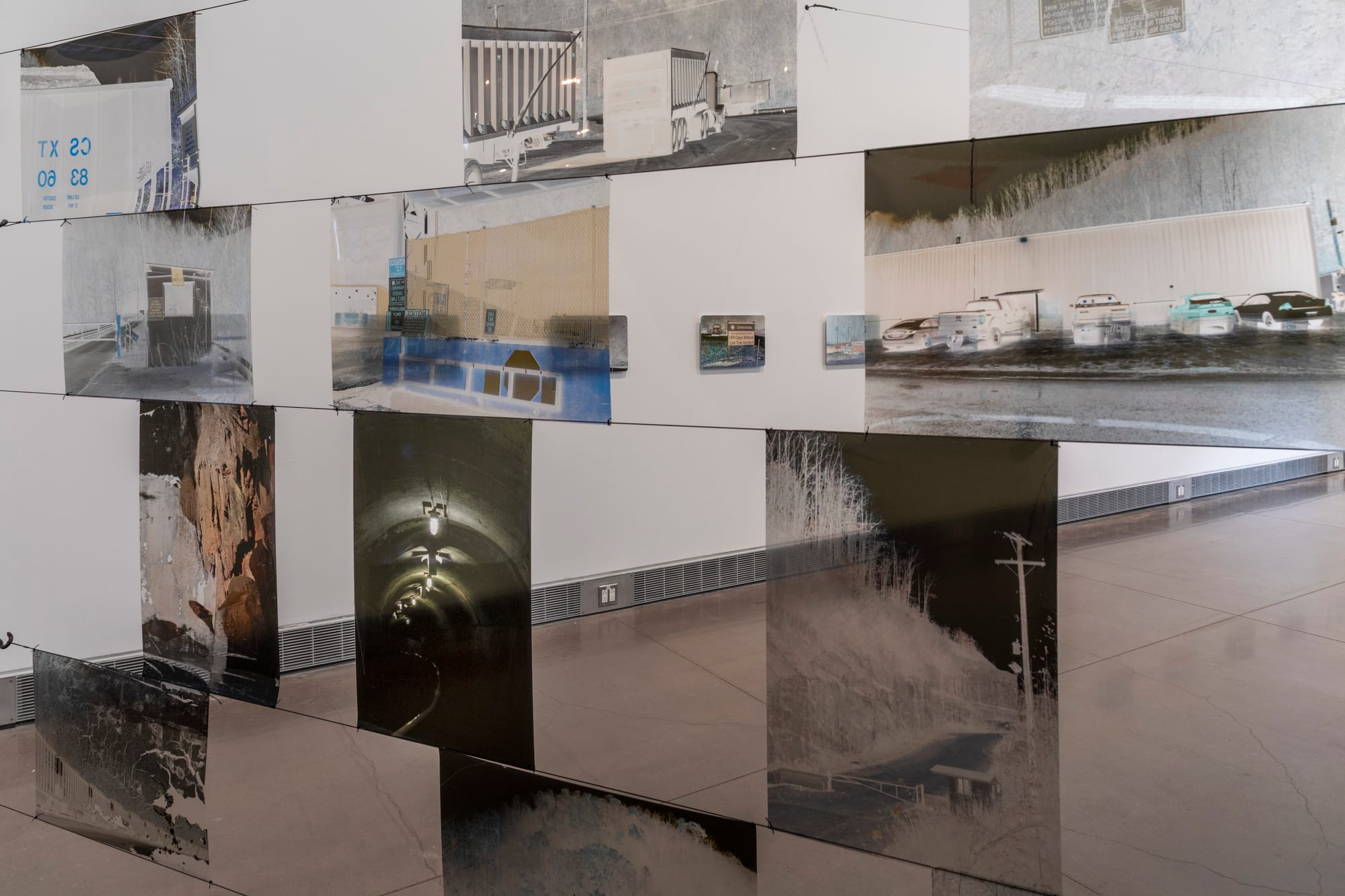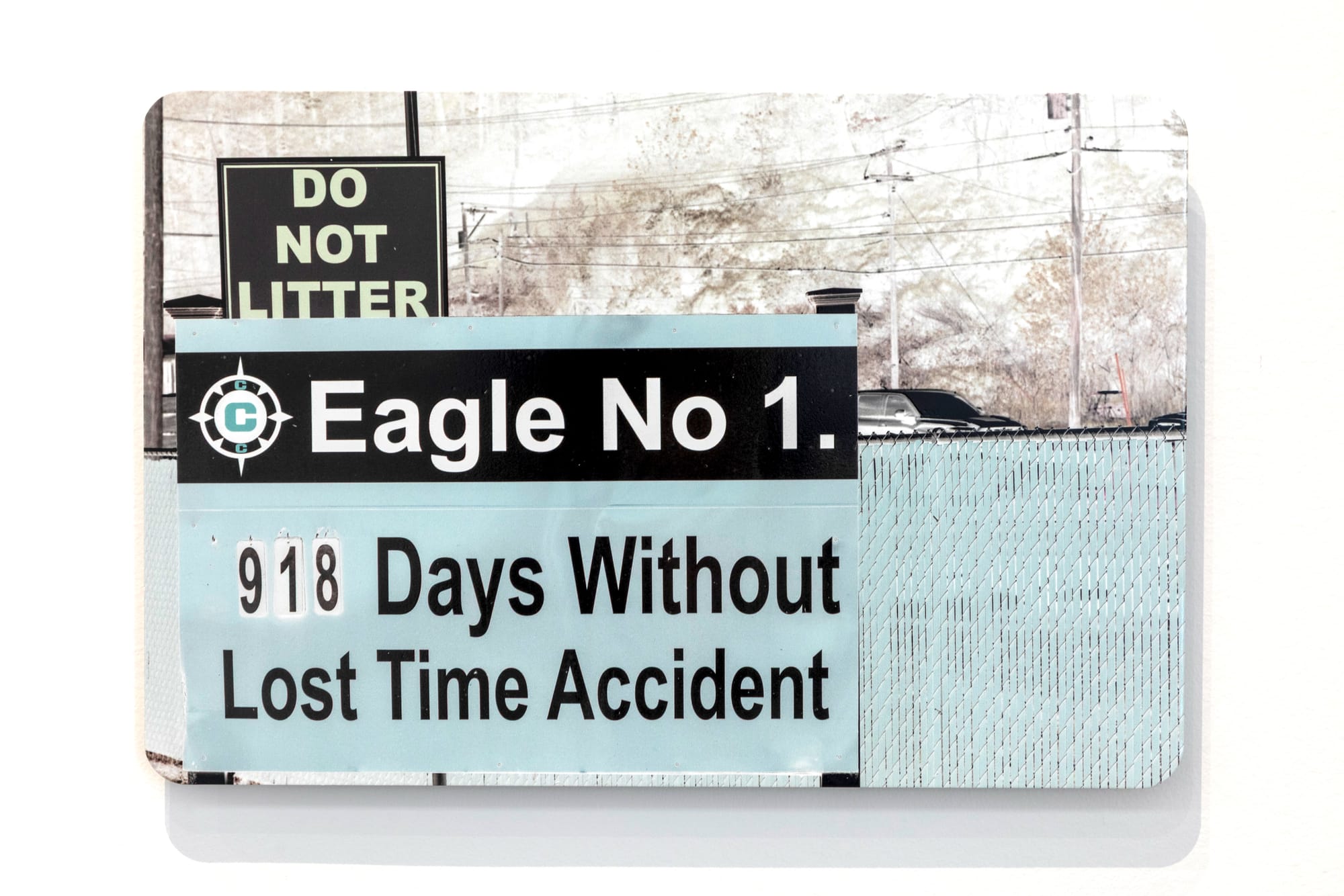 On a wall across from these first works, the artist installed Days Without Lost Time Accident (2024–25), a somber series that gathers images of the omnipresent signage found at mining sites that show how long it’s been since a worker has been injured while on the job. These photo-sculptures are printed, appropriately, on powder-coated steel, replicating the signs themselves at a smaller scale. The colors of each image have been inverted (an approach often used in scientific research), so that the language appears clear while everything else rests on the threshold of visibility. Alternate realities soon become a theme as the artist continues to blur lines between reality and surreality, testimony and docupoetry, and representation and abstraction.