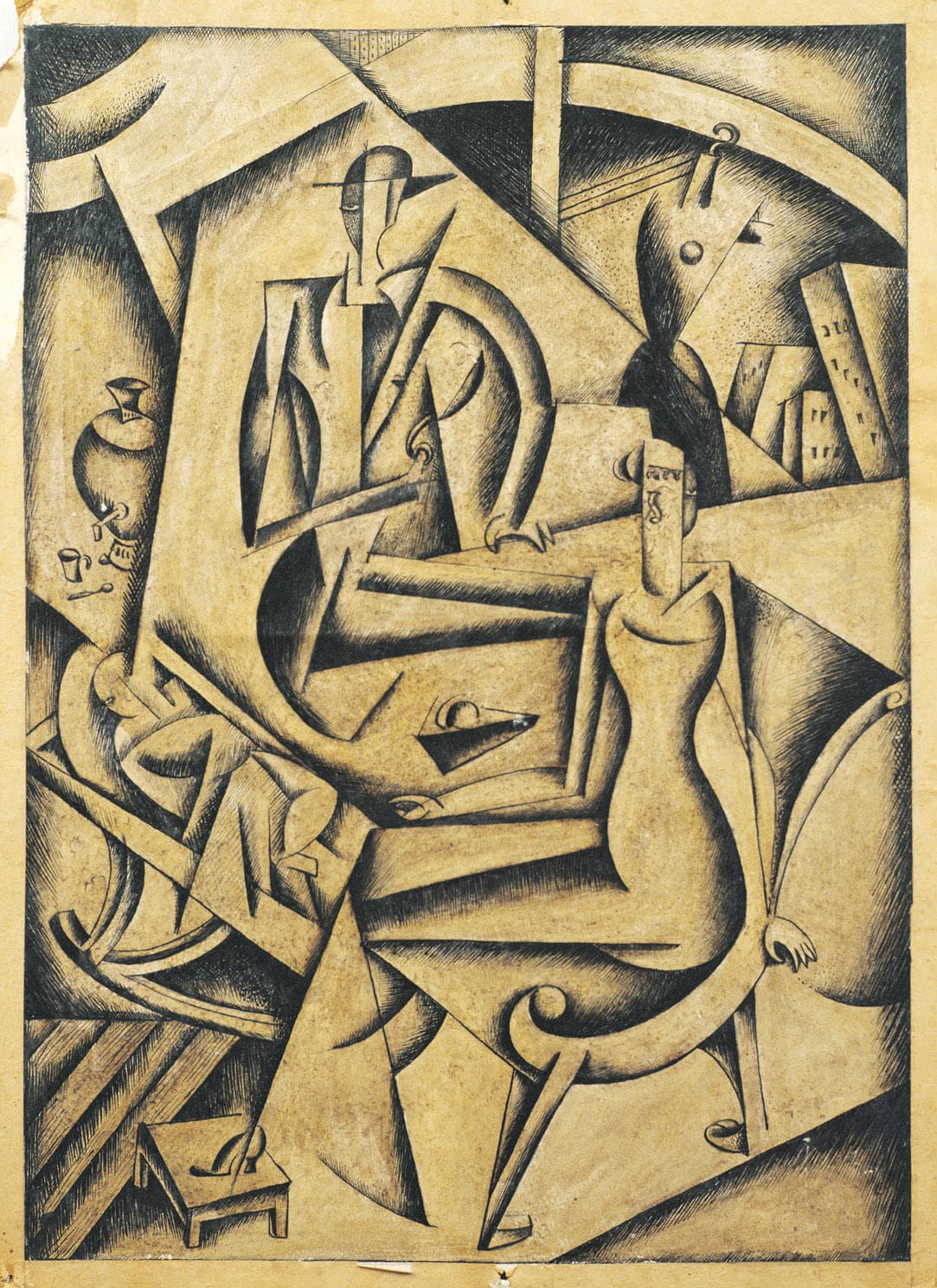 But many lesser known artists are in the exhibition as well, whose names do not deserve to be forgotten — Alexandra Exter, for example, whose career as an artist saw her shuttle from Kyiv to Paris and then back again; “Bridge (Sevres)” (c. 1912), a painting of restrained palette, is squarely camped out in Cubist terrain. Or Oleksander Bohomazov, who taught at the Kyiv Art Institute from 1922 to 1930. His 1927 painting “Sharpening the Saws” is one of the show’s most remarkable works because it aligns itself with many other Socialist Realism paintings of the ennobled worker, but its sense of geometry and brilliant use of color refresh that tired genre — see how the three saws fan out? The work is a nod, surely, to more local folkloric traditions.