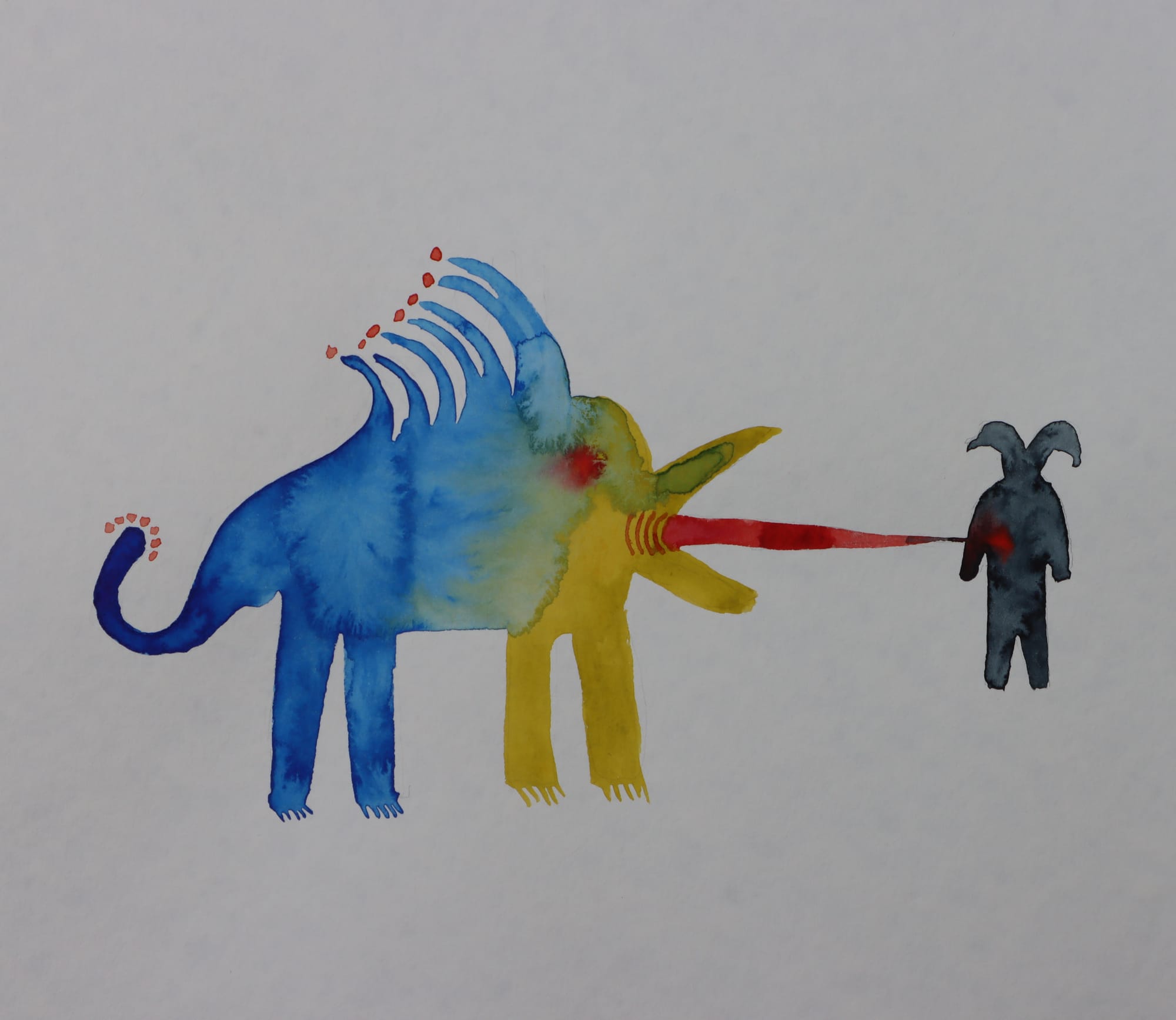 Danylo Movchan, a contemporary painter from Kyiv, created “Struggle” (2022) in response to news that 25 paintings by Maria Pryimachenko, Ukraine’s most loved folk artist, had been destroyed. In this work, Movchan painted a Pryimachenko-inspired creature in yellow and blue, with a tongue that attacks a dark figure to the right of the composition. Movchan uses the recognizable Pryimachenko figure to represent Ukraine and its strength and fighting spirit against Russia.