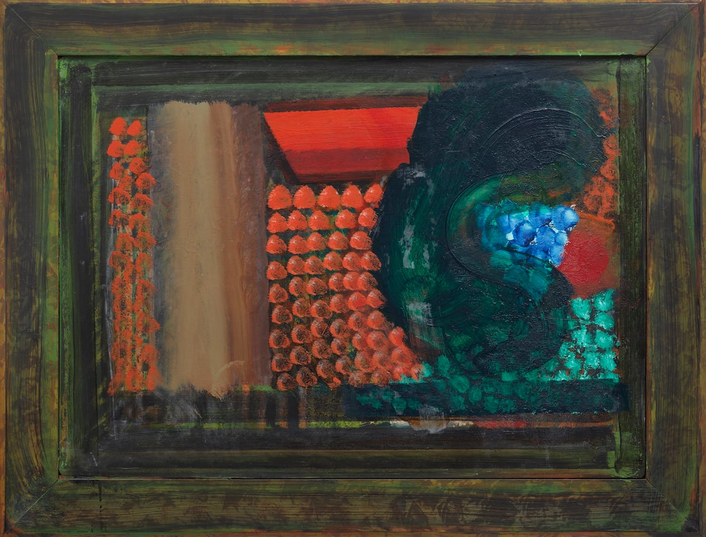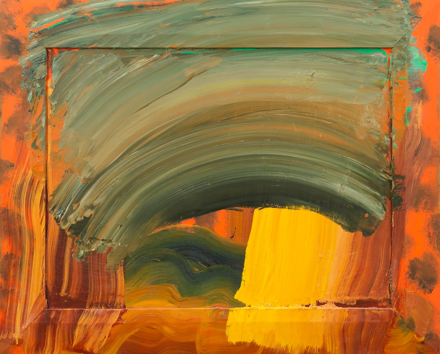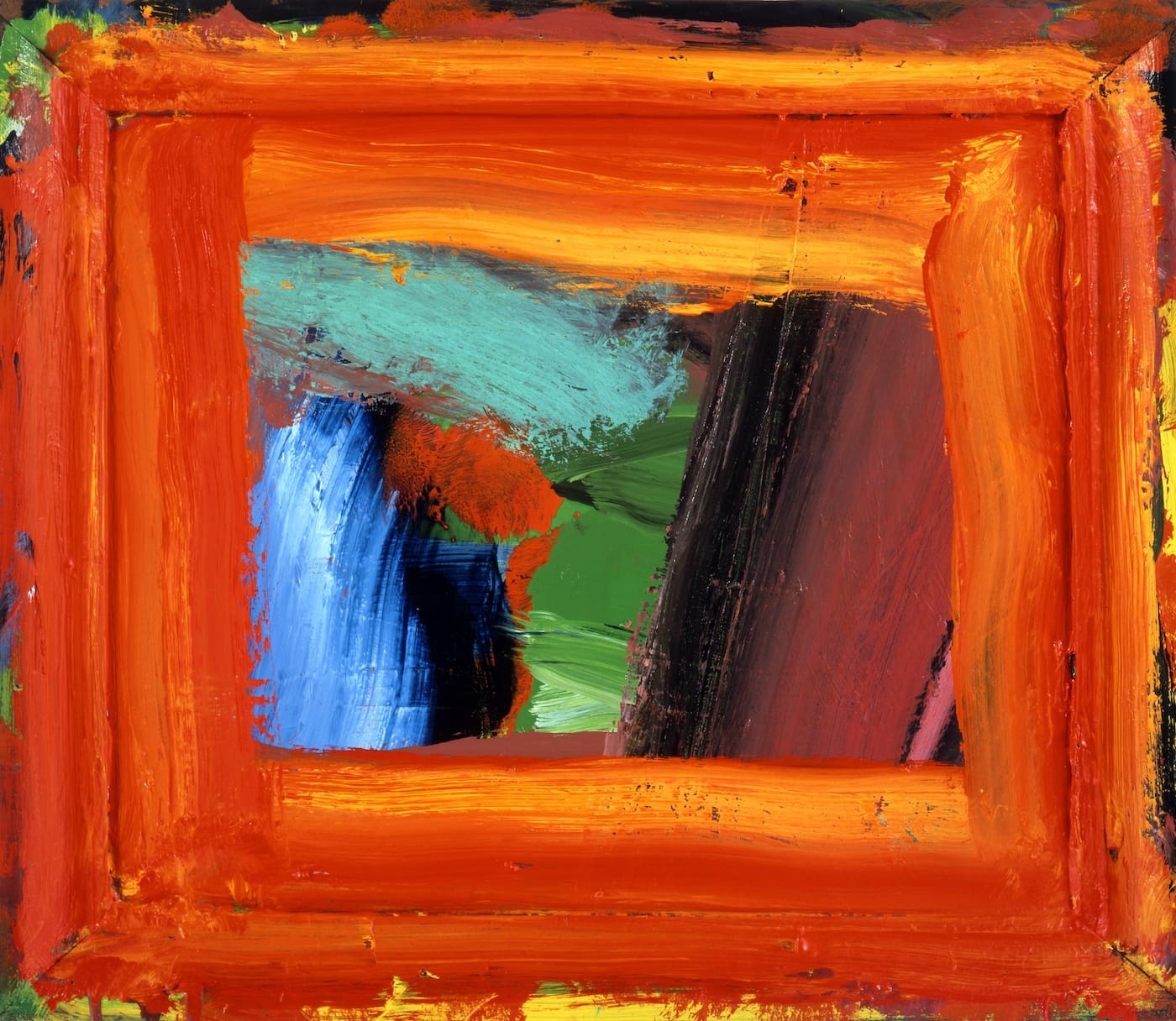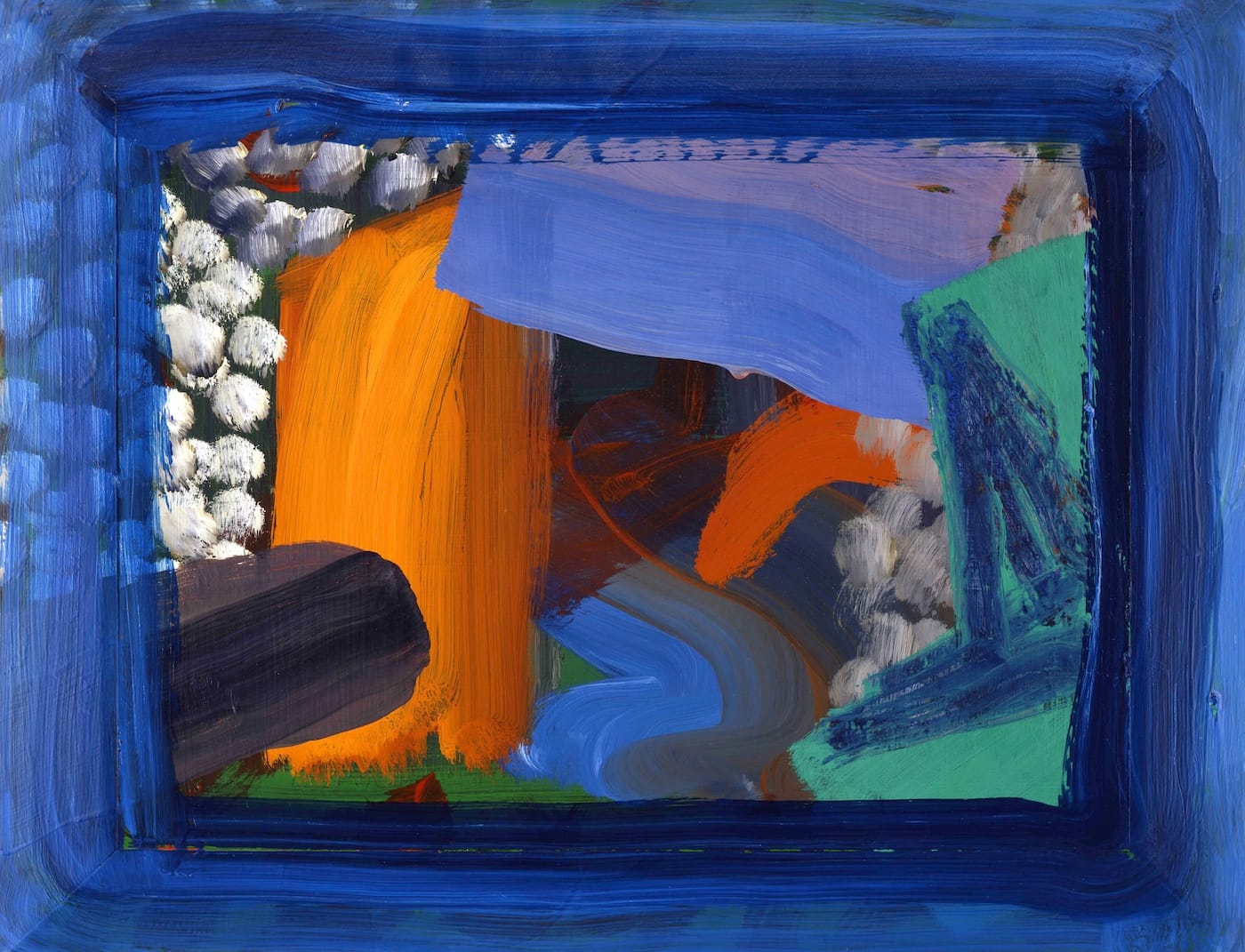 In fact, in his paintings Hodgkin positively gushes with emotion. This new show pulls him out of the shadows in all his roaring weepiness as never before. How he lets the paint spill forth in these long, curvaceous sweepings over! How he steadfastly refuses to be fenced in by the frames, whose limitations he seems at first glance to be respecting by the act of employing such boundary markers at all.