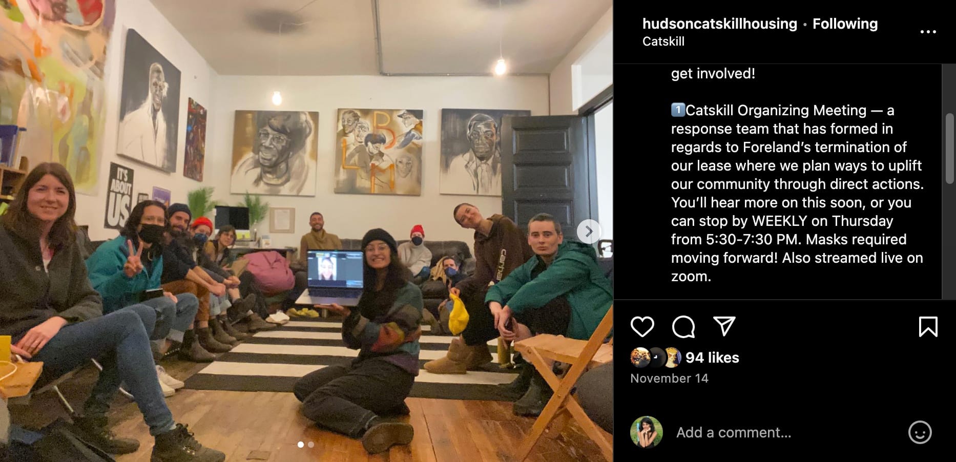 On September 21, HCHC posted screenshots of Matos’s email exchange with Halmos on its Instagram account, stating that it had “been displaced” from its Catskill office and mobilizing some of Foreland’s creative tenants, including Nicholas Weist, who works for an art nonprofit. Weist and others have formed the group Catskill Artists and Creatives for Housing Equity (CACHE) in response to HCHC's lease termination as well as what they perceive as wealthy art organizations' role in gentrifying Catskill and the greater Hudson Valley. Noting that “Foreland itself is creating the market rate," Weist shared CACHE’s petition calling on the arts complex to "directly address its contributions to gentrification in Catskill."