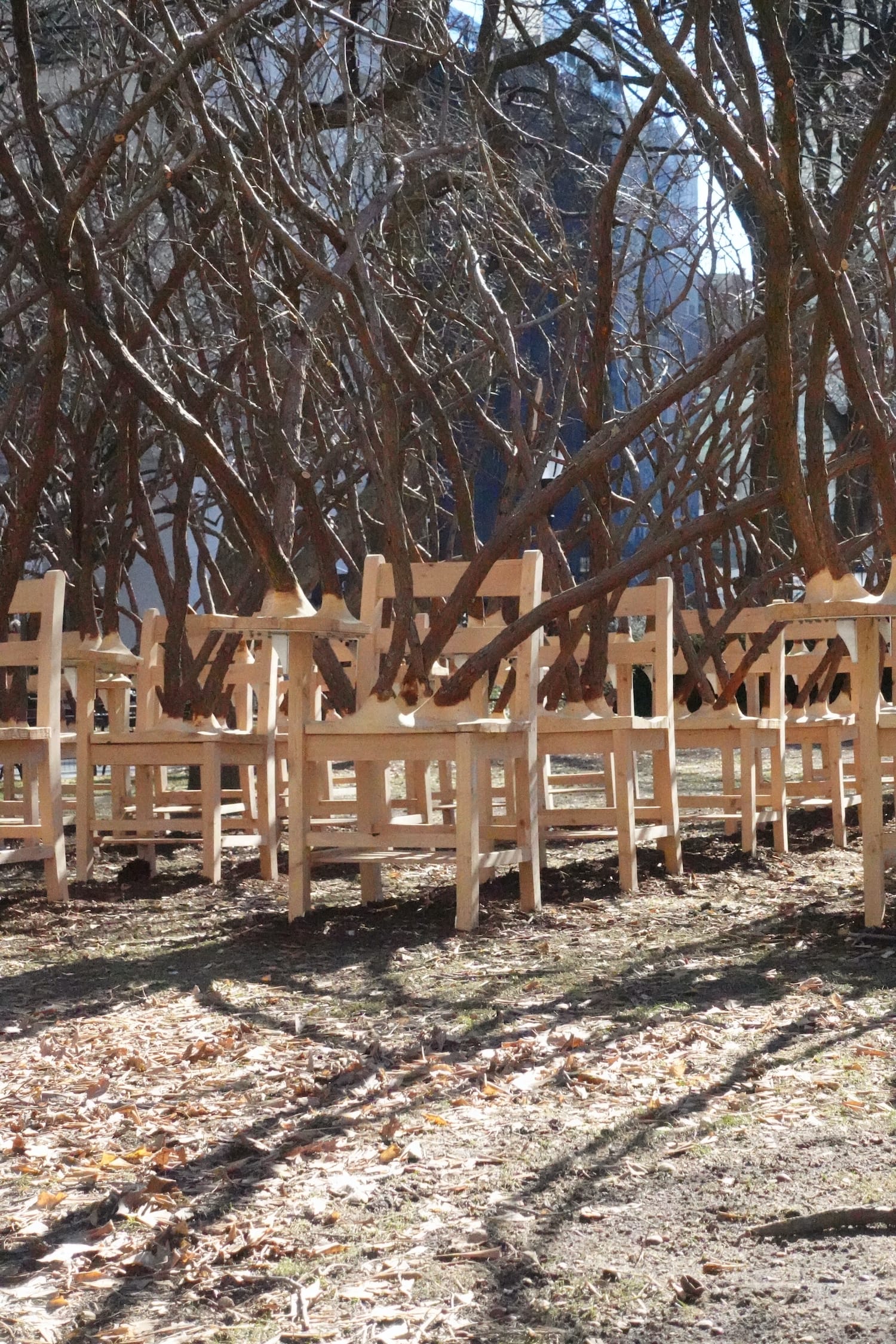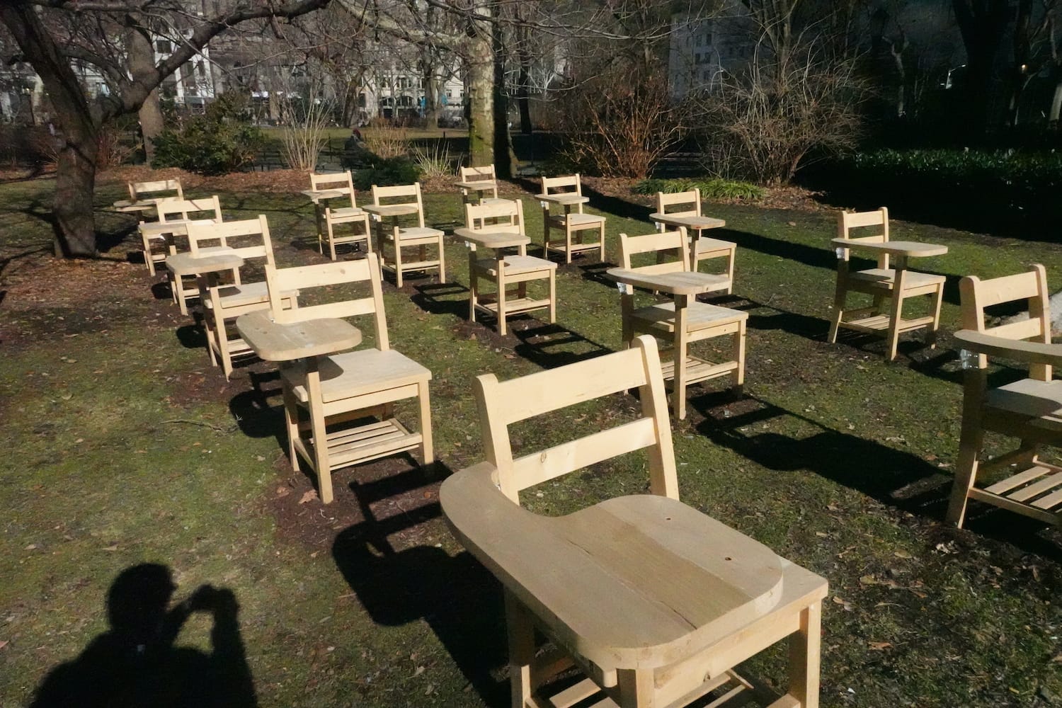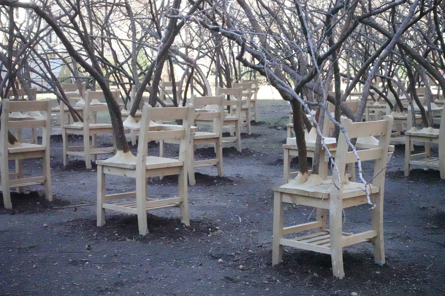 One of the four groups of desks is branch-free. In the middle of the dense text on the park’s signage about the piece, a sentence notes that Hayden “offers” these desks to “individuals and groups to interact with the piece for contemplation or convening.” I haven’t yet seen anyone take up this offer, perhaps because these desks are surrounded by a fence — a low one, to be sure, but still a barrier. The soft, bright cedar desktops, ripe for doodling or carving, or even staining with Shake Shack ketchup, remain unscathed, more than a month into the installation’s January to May run.