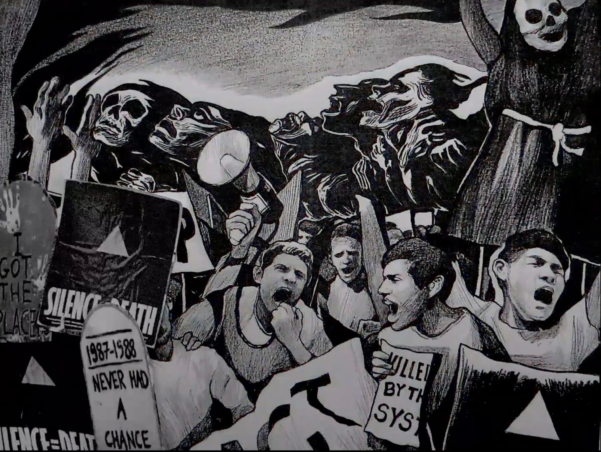 The five-minute stop motion animation, "A Portrait of Dr. Anthony Fauci" (2022), begins by portraying him as a young scientist in a lab. Later, a man infected by an unnamed virus becomes emaciated until he disappears into a black hole that morphs into a scene from ACT UP protests. Men carry signs that read "Silence = Death" and "Killed by the System." Behind them, skeletons look to the sky.