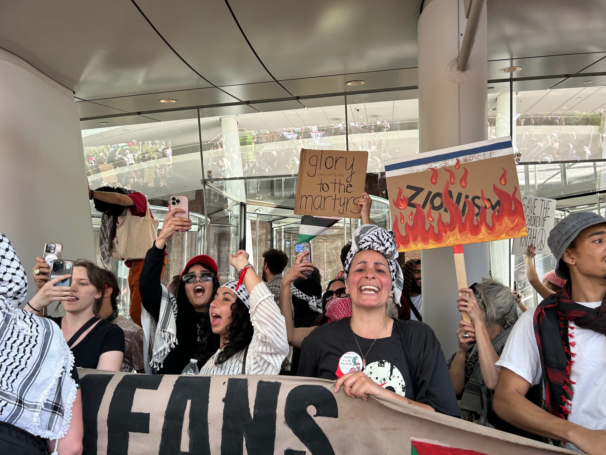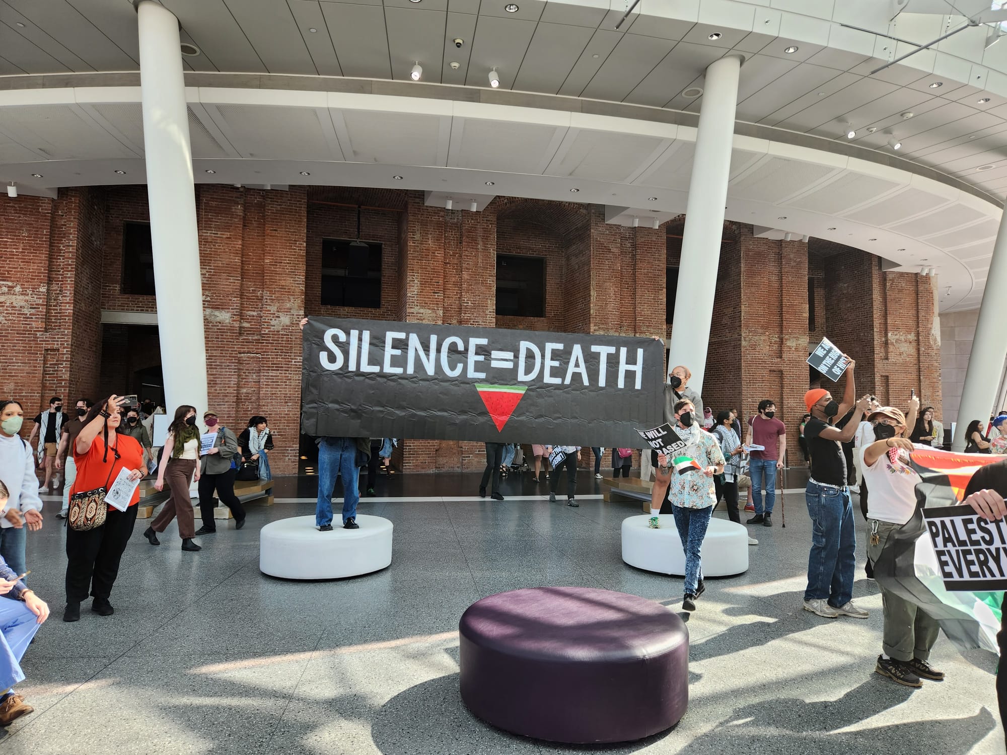 Approximately 1,000 activists overtook the New York museum, staging a protest in its lobby, waving Palestine flags above its glass pavilion, and unfurling a large banner from its rooftop that read "Free Palestine, Divest From Genocide."