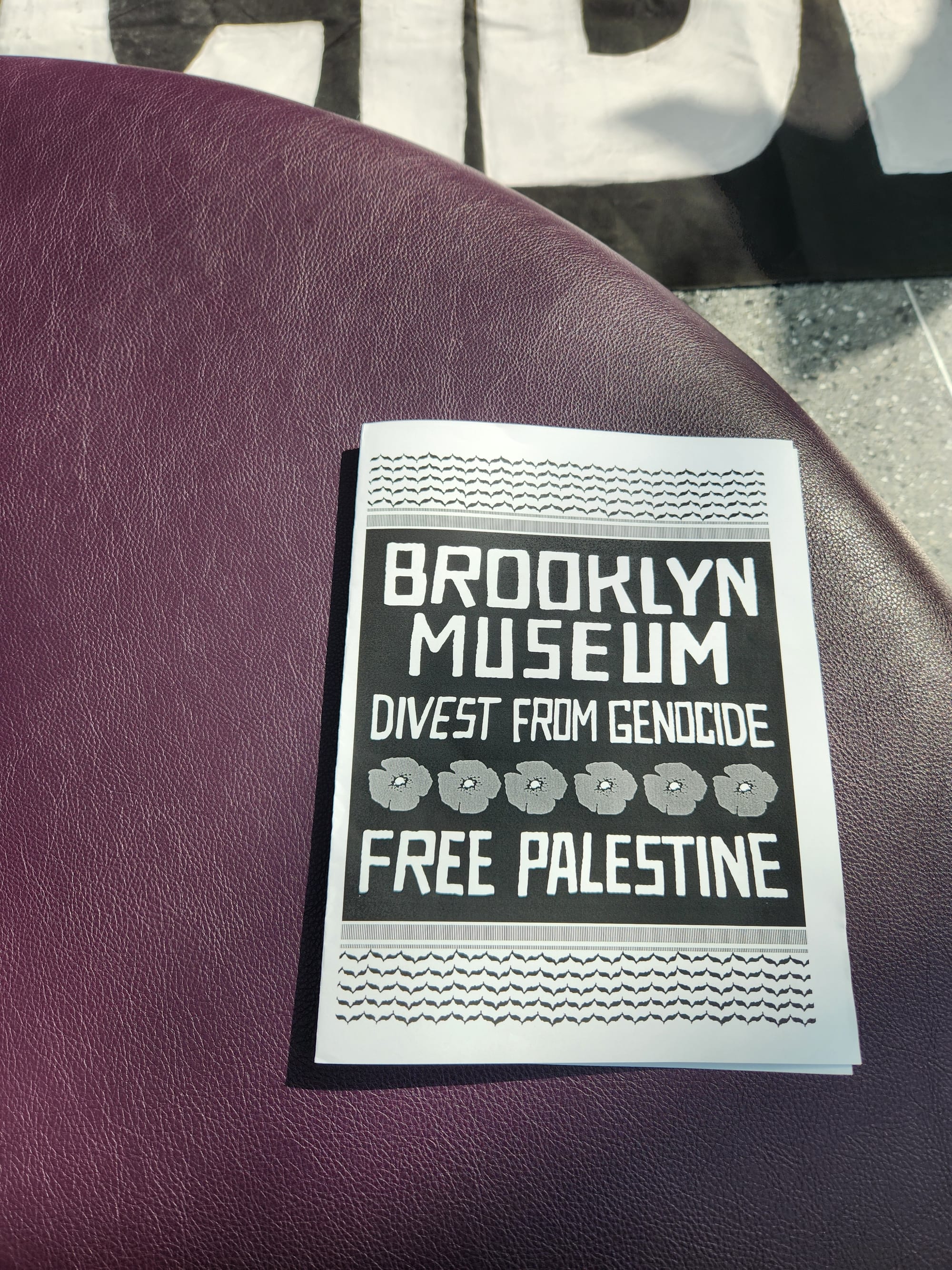 The protesters handed out copies of a brochure calling on the Brooklyn Museum to publicly recognize Israel’s actions in Gaza as genocide and divest from companies and donors with ties to the Israeli military.