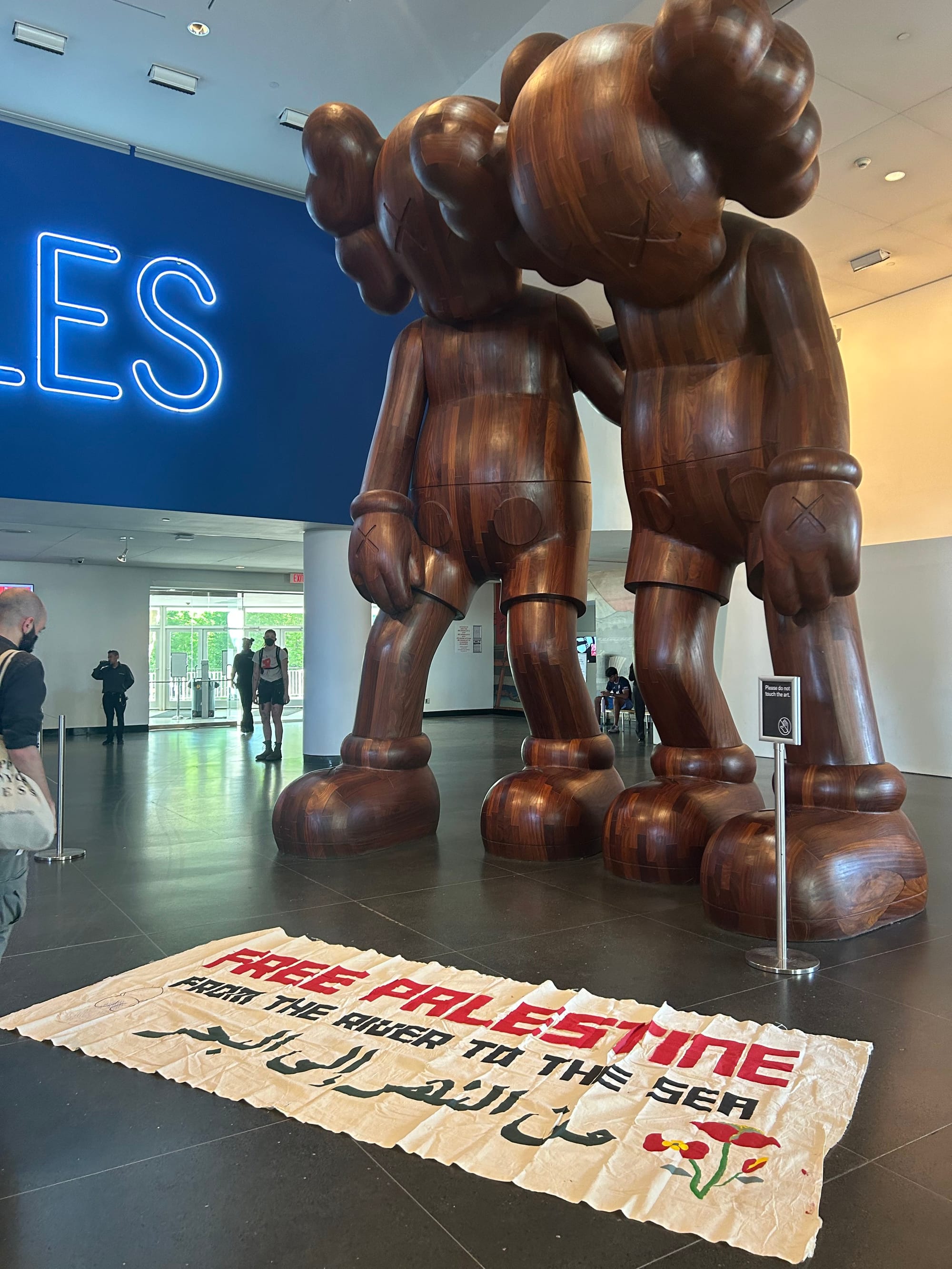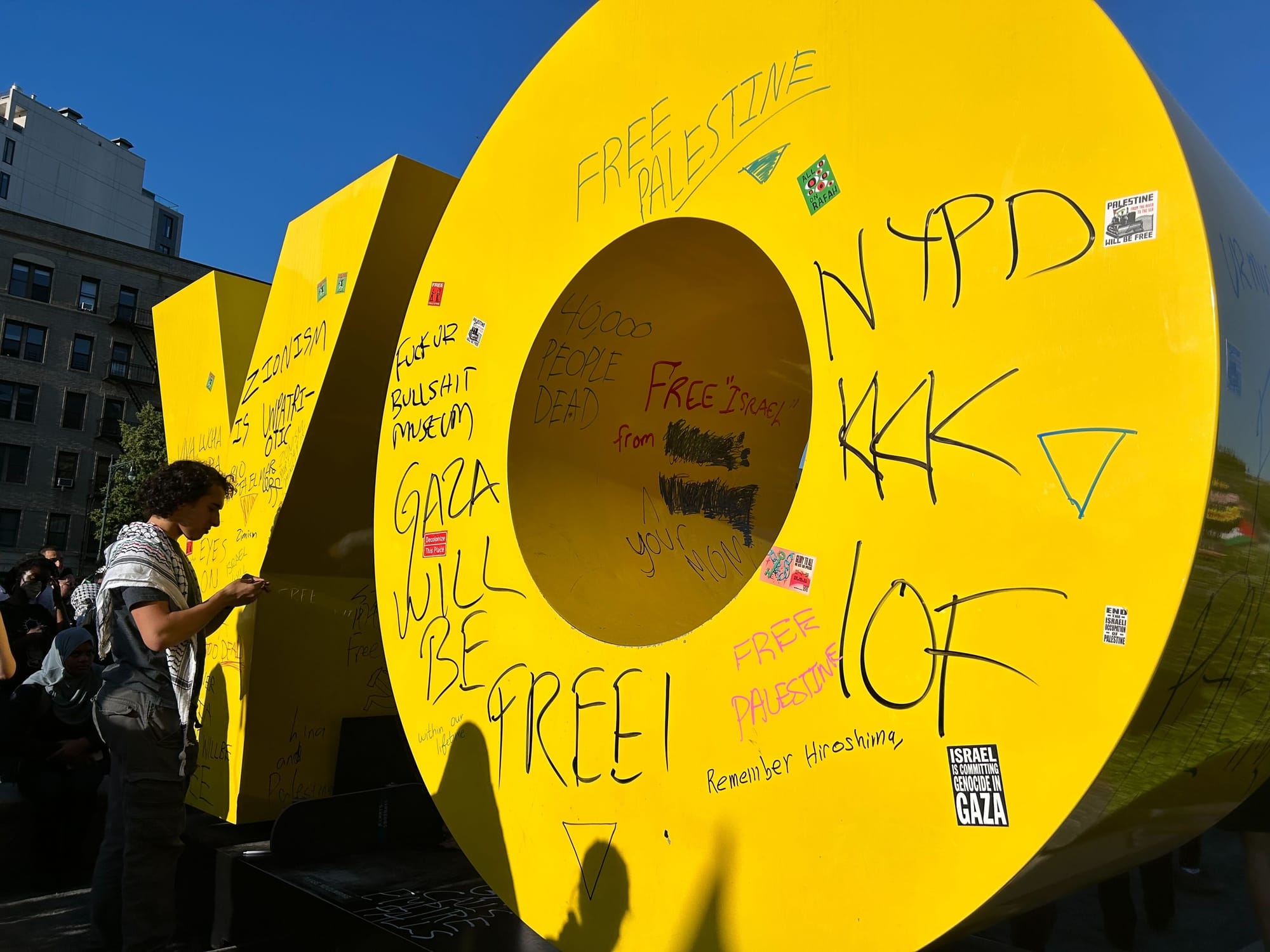 Some protesters also tagged artist Deborah Kass’s yellow “OY/YO” (2015) sculpture outside the museum’s entrance with slogans including “Gaza Will Be Free,” “40,000 people dead,” and “Ur Museum Kills Kids in Palestine.”