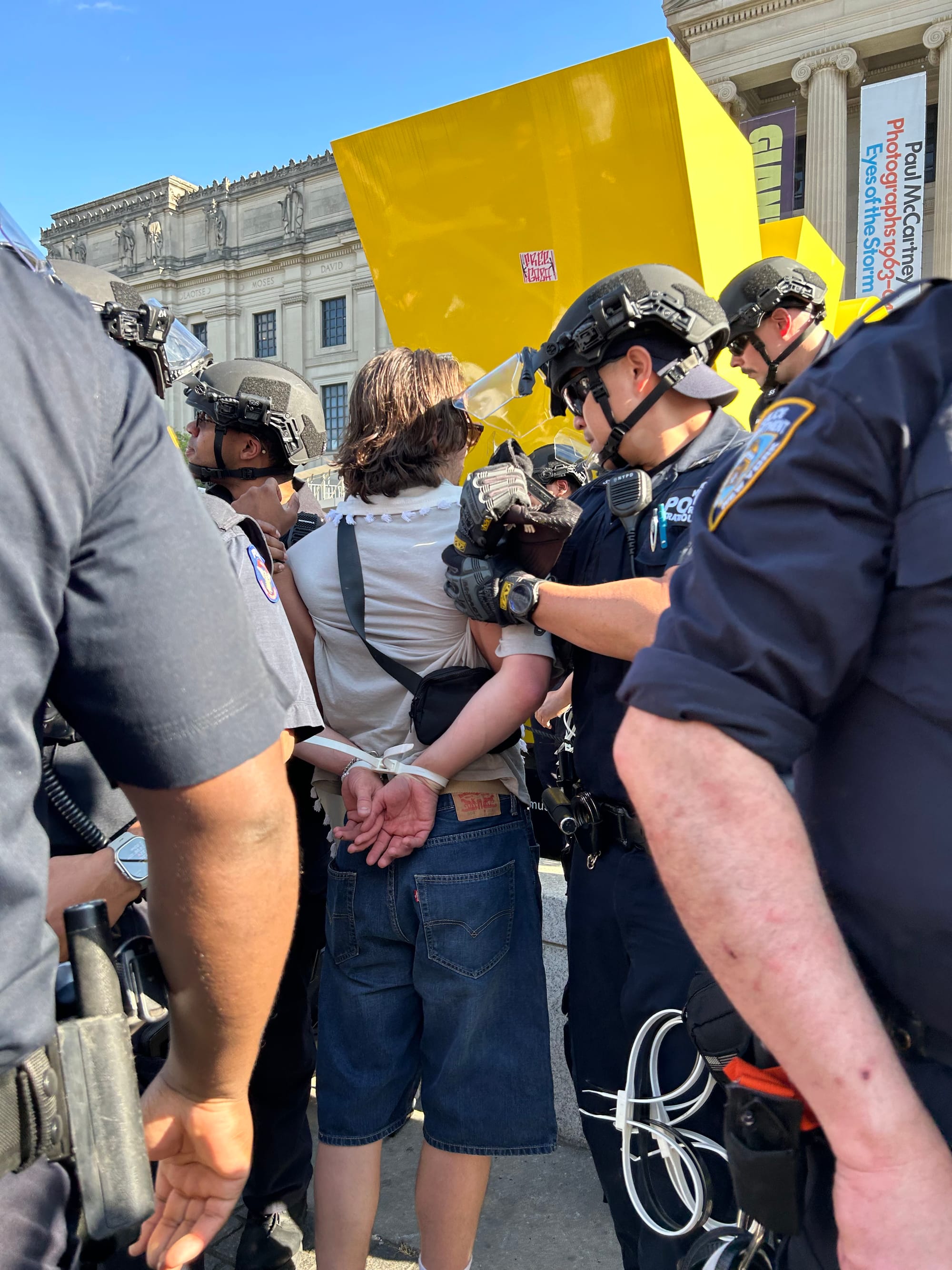 A massive and heavily policed protest against Israel’s war on Gaza at the Brooklyn Museum on Friday, May 31 saw the arrest of 34 demonstrators, according to Democracy Now. Hyperallergic witnessed at least 20 arrests at the action; the New York Police Department (NYPD) has not yet confirmed the numbers.