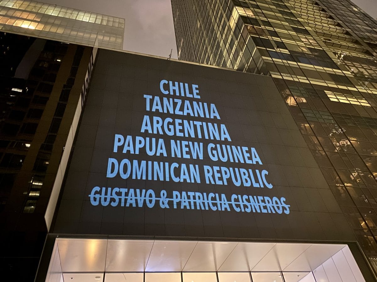 Around 4pm, a swarm of activists huddled in front of the glass doors of the museum, where speakers kicked off the action with speeches about conflicts in Colombia and the Dominican Republic. They chanted “Out, Barrick Gold” — referring to the multinational mining company where Gustavo Cisneros, husband of MoMA trustee Patricia Phelps de Cisneros, sits on the board of directors. The couple may be best known for their patronage of Latin American artists, but Bronx activists Sandy Placido and Manny Roa amplified the Cisneros’s ties to the Pueblo Viejo mine in the Dominican Republic, one of the largest gold mines in the world, which locals say has contaminated groundwater, air, and soil. (Barrick Gold has not responded to Hyperallergic’s repeated requests for comment.)