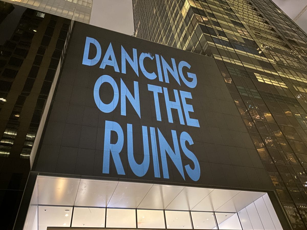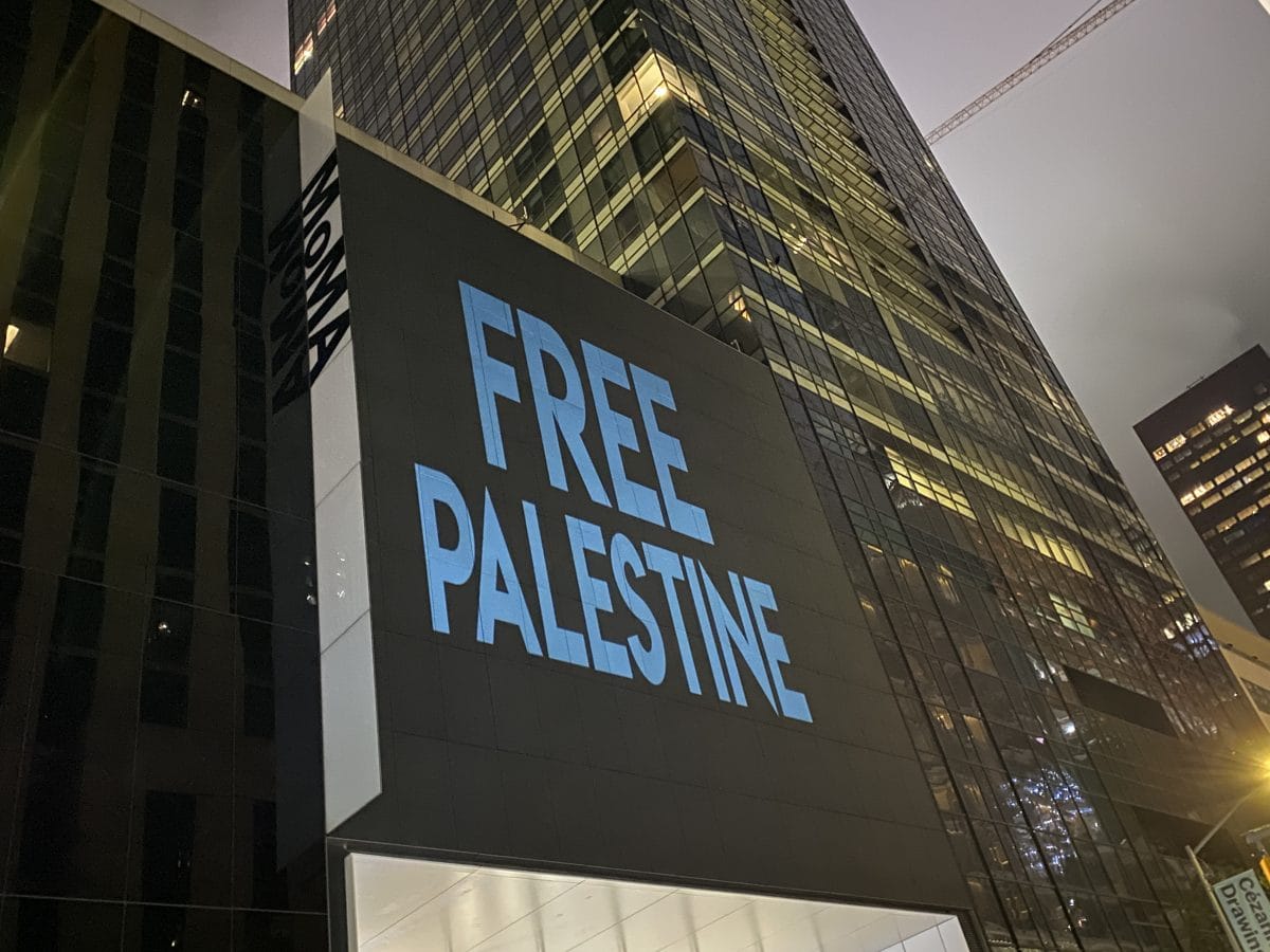 The demonstrators then returned to MoMA for an “after-party” to celebrate the conclusion of 10 weeks of action. The New York Police Department (NYPD) blocked traffic on West 53rd street while several officers guarded the museum’s entrance. Around 9pm, Strike MoMA and the Illuminator collective held a guerrilla projection onto the museum’s facade. The protesters erupted in cheers as messages such as “Strike MoMA,” “Strike Modernity,” and “Free Palestine” illuminated the building. Other projected images showed members of MoMA’s board with texts describing the allegations against them.