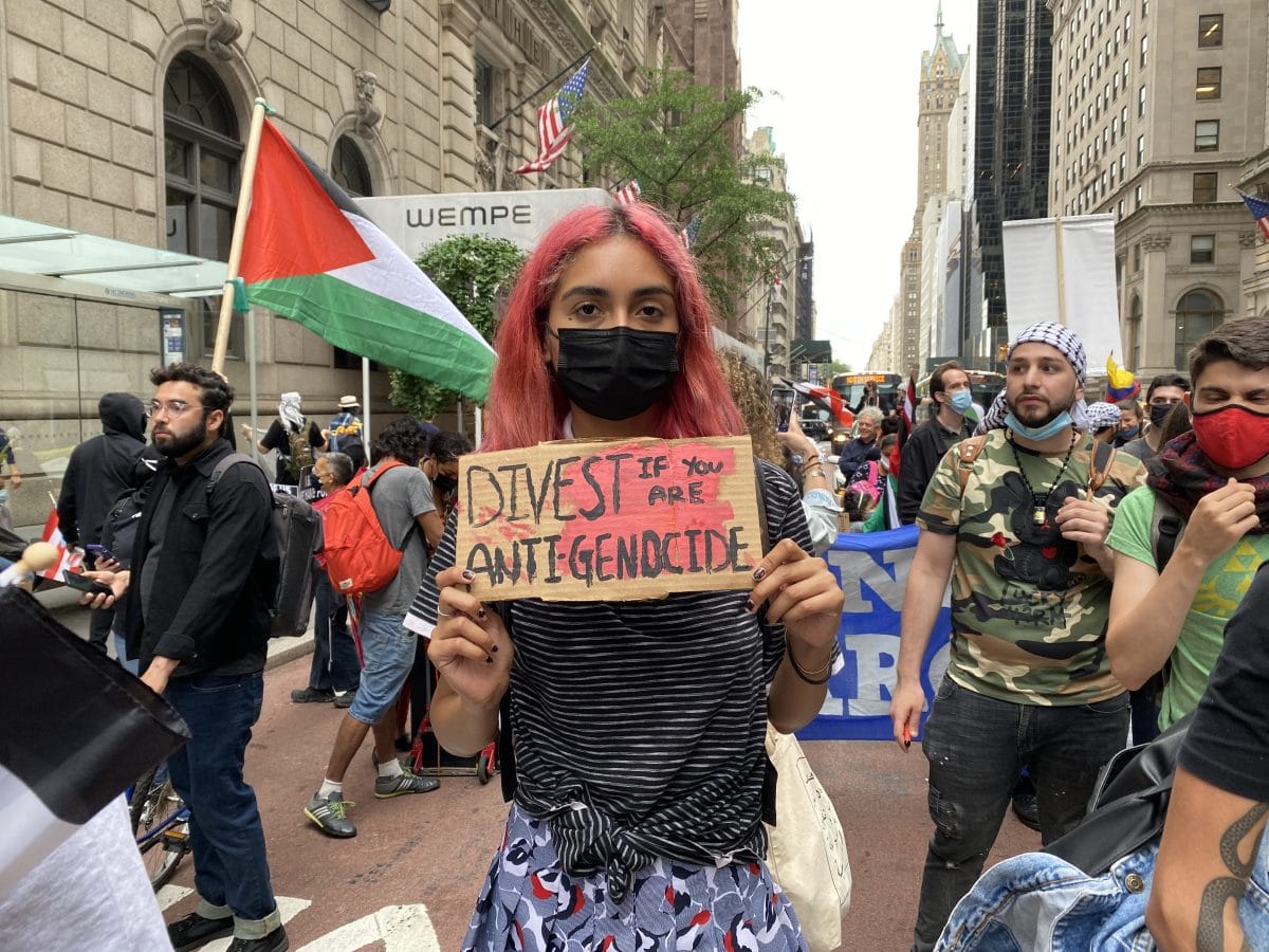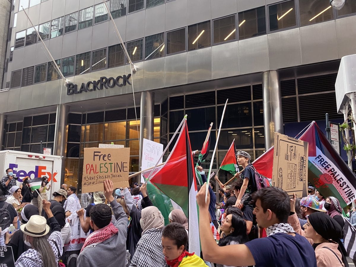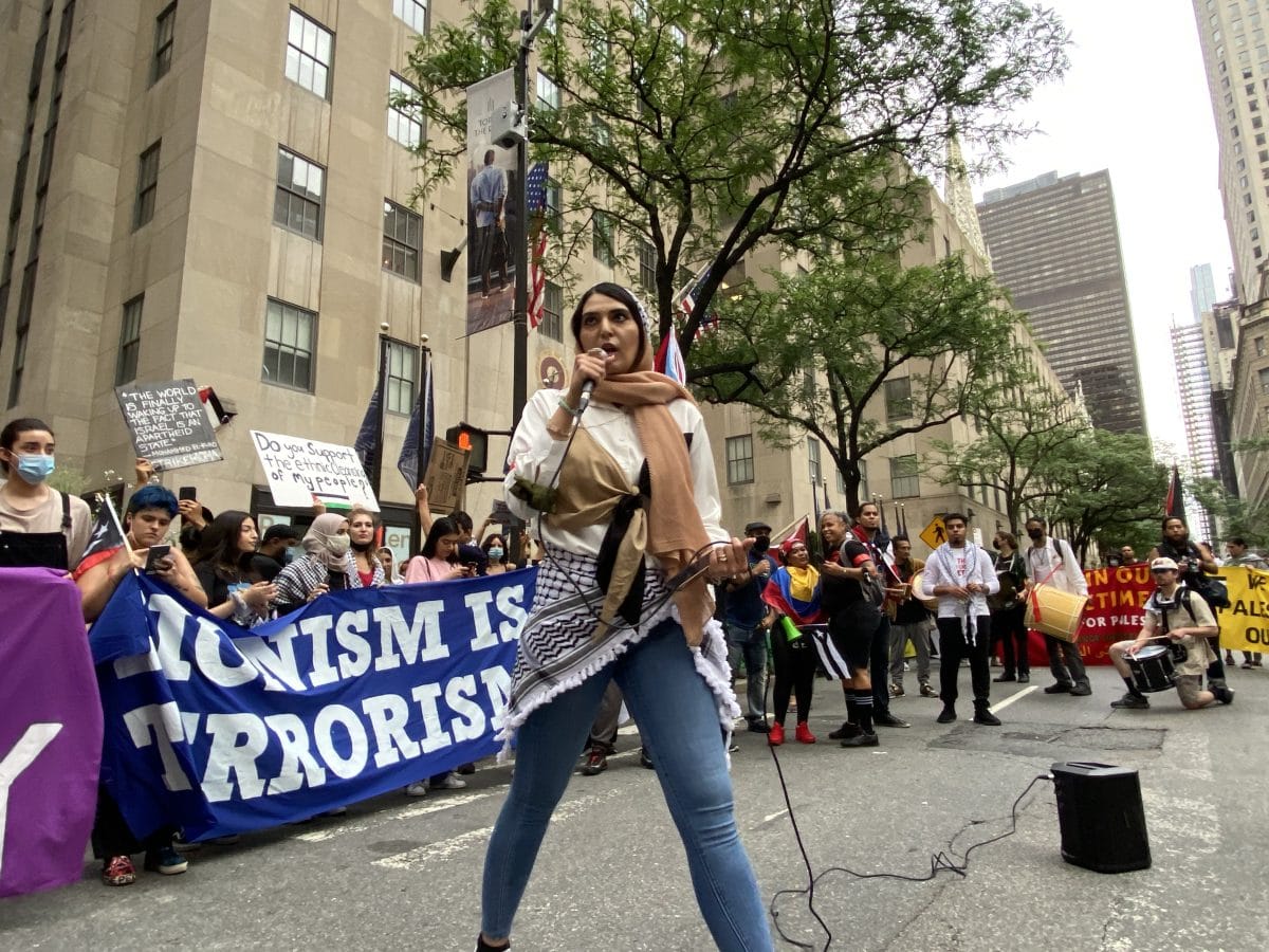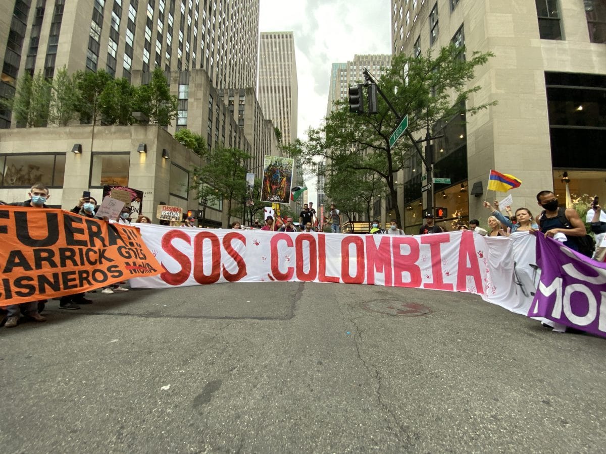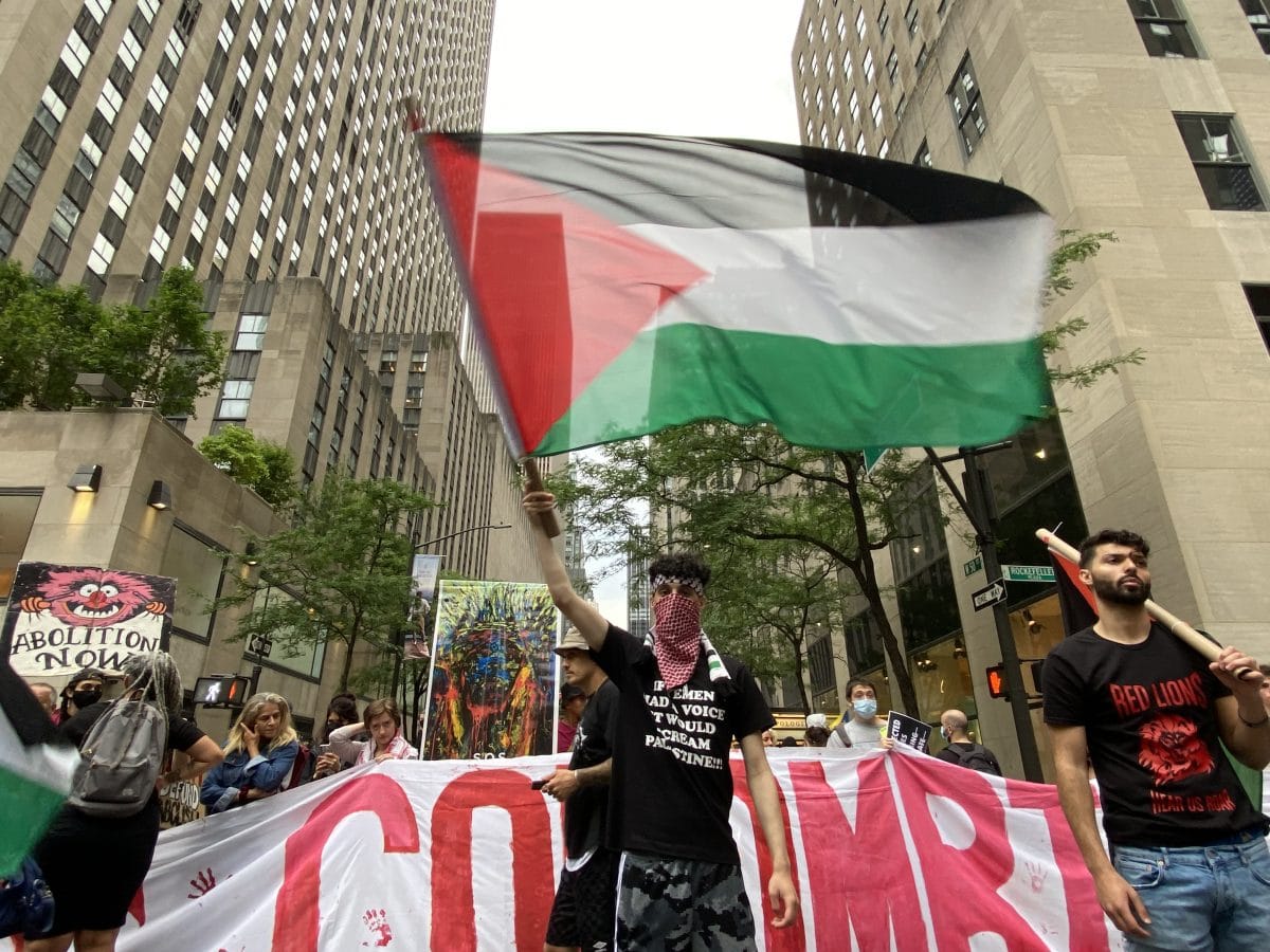 The protesters concluded the last action with a peaceful march through the streets of Midtown Manhattan at the Rockefeller Center, where they gathered in a circle to hear final speeches. “The money from the Rockefellers created MoMA,” said one of the speakers. “It’s no surprise that they wash their blood money with art. We will go to where these people feel comfortable to profit from our peoples and we will fight for Colombia and the Dominican Republic like we fight for Palestine.”
