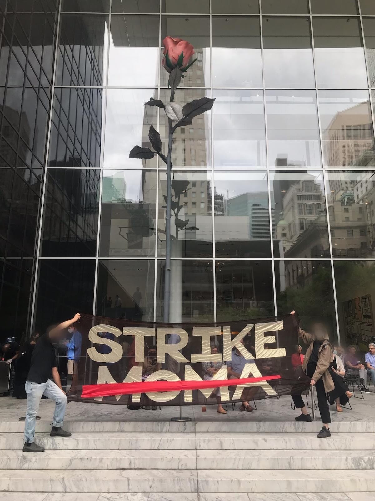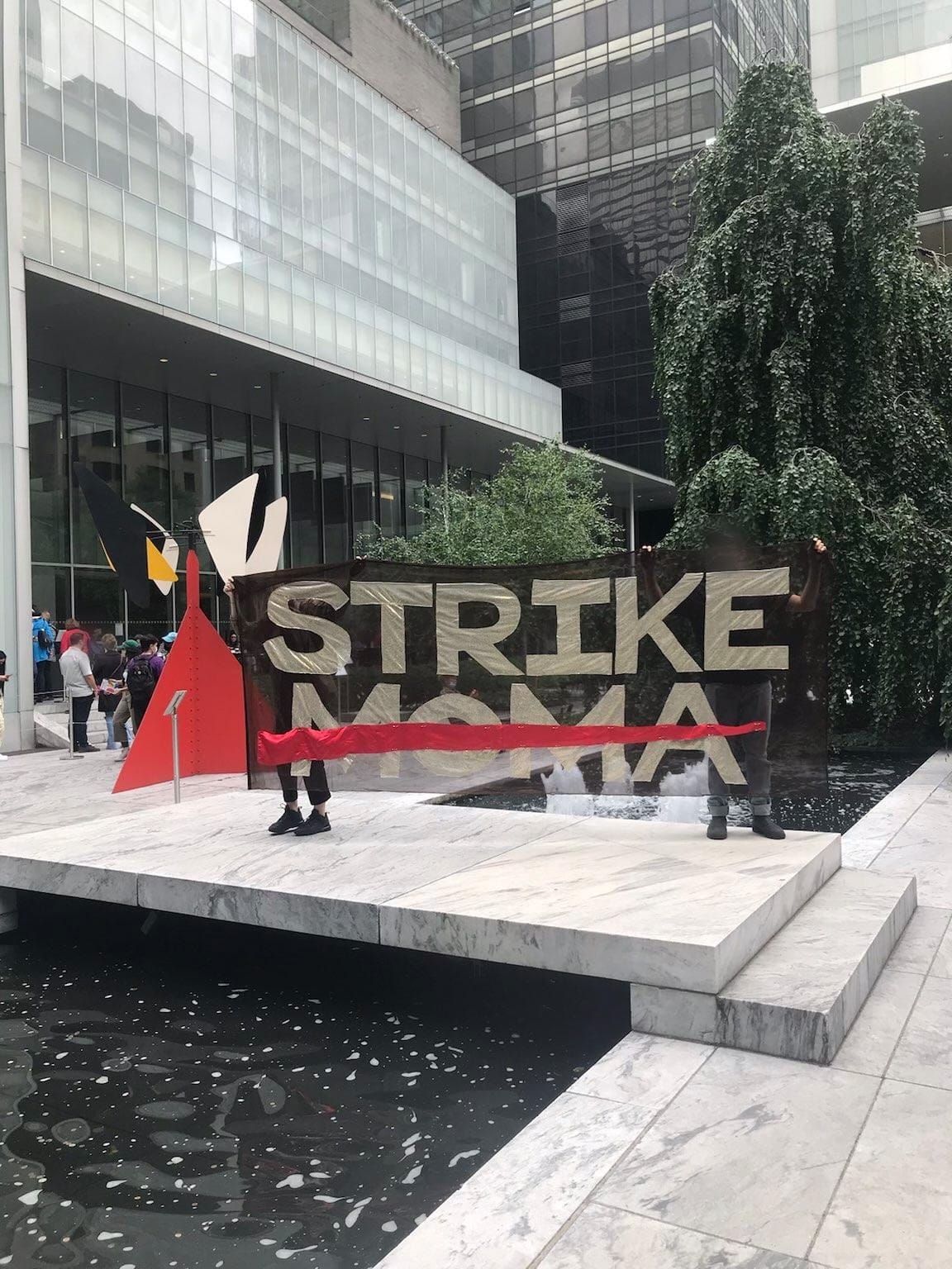 Inside the museum, the atmosphere was tense as the protesters blocked the entrance outside. MoMA staffers were on high alert, but a group of five activists managed to sneak in a large Strike MoMA banner and unfurl it at the museum’s Abby Aldrich Rockefeller Sculpture Garden. The protesters later told Hyperallergic that they were escorted out of the museum when they tried to unfold the banner inside the galleries. (MoMA has not responded to Hyperallergic's repeated requests for comment.)