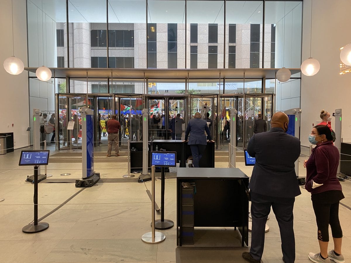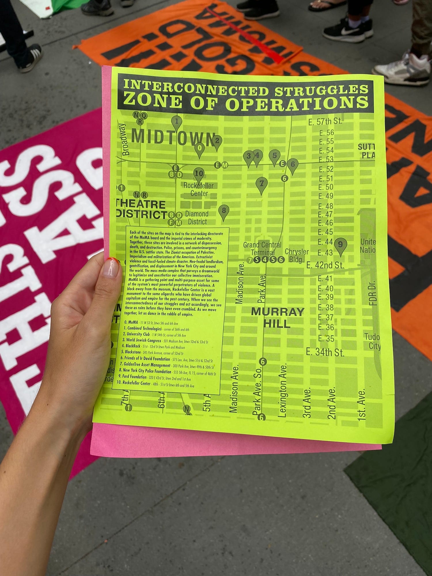 This “zone of operations” was marked on a bright green map distributed to attendees. (When Hyperallergic reporter Hakim Bishara entered the museum during the protest, he was asked by MoMA security to discard the map before being allowed inside.)