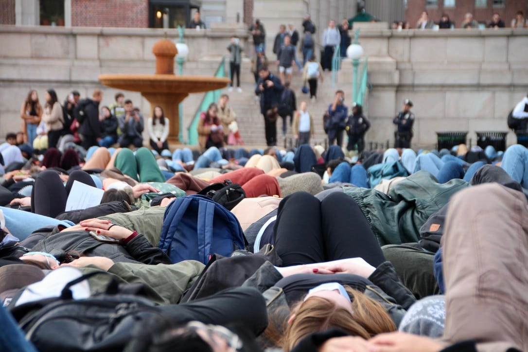 At 3:15pm, protesting students staged a “die-in” in front of the Low Memorial Library steps, laying on the ground in a symbolic representation of the people killed. Before the action, they requested that the counter-protesters back off and make space. The two-hour protest began silently and ended with chants.