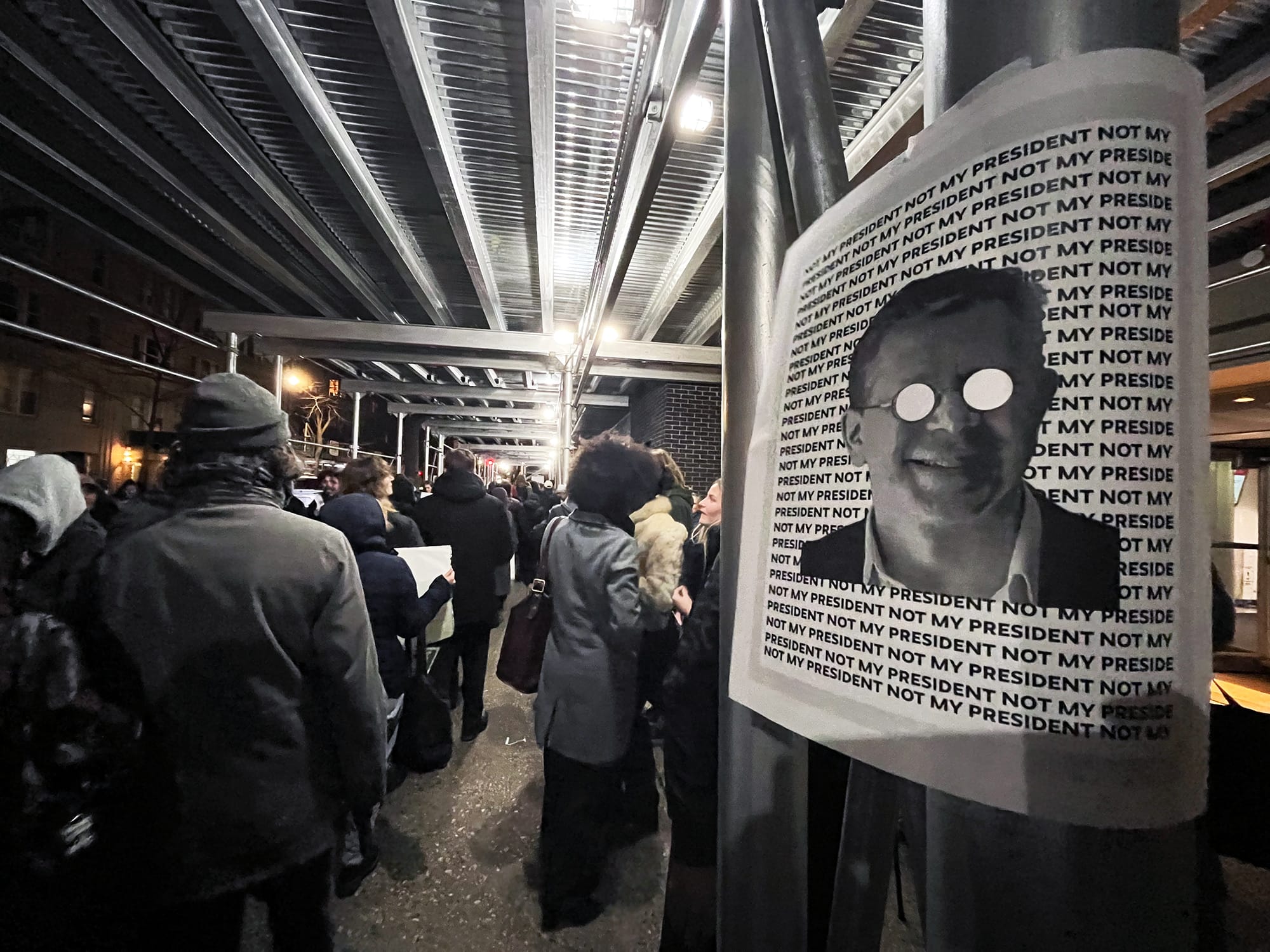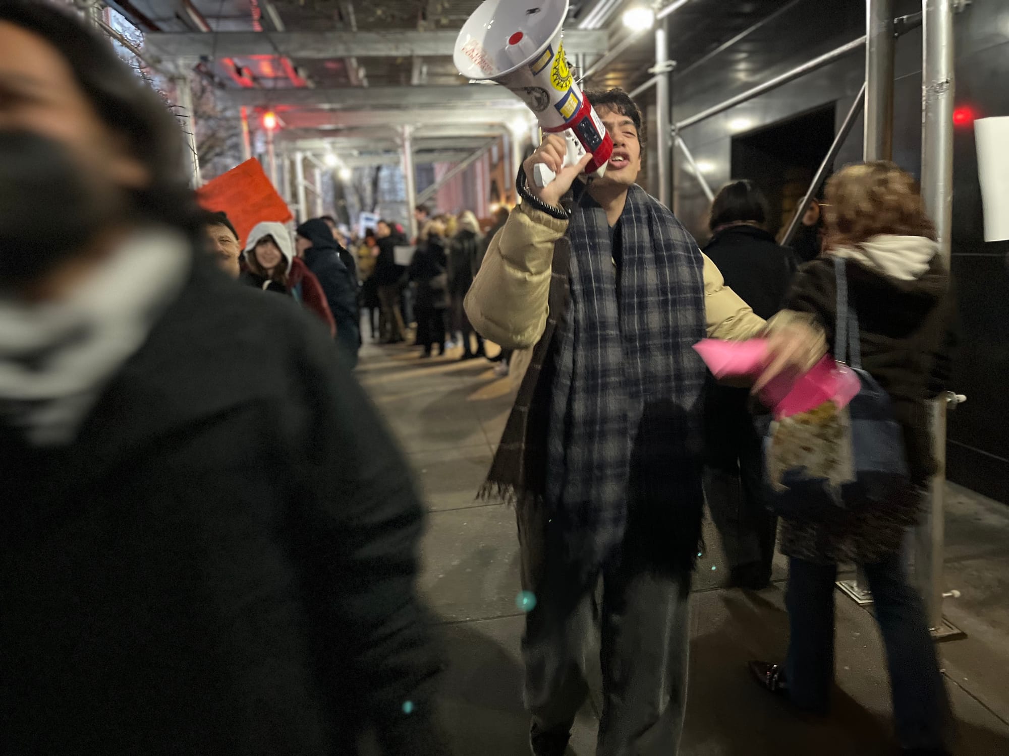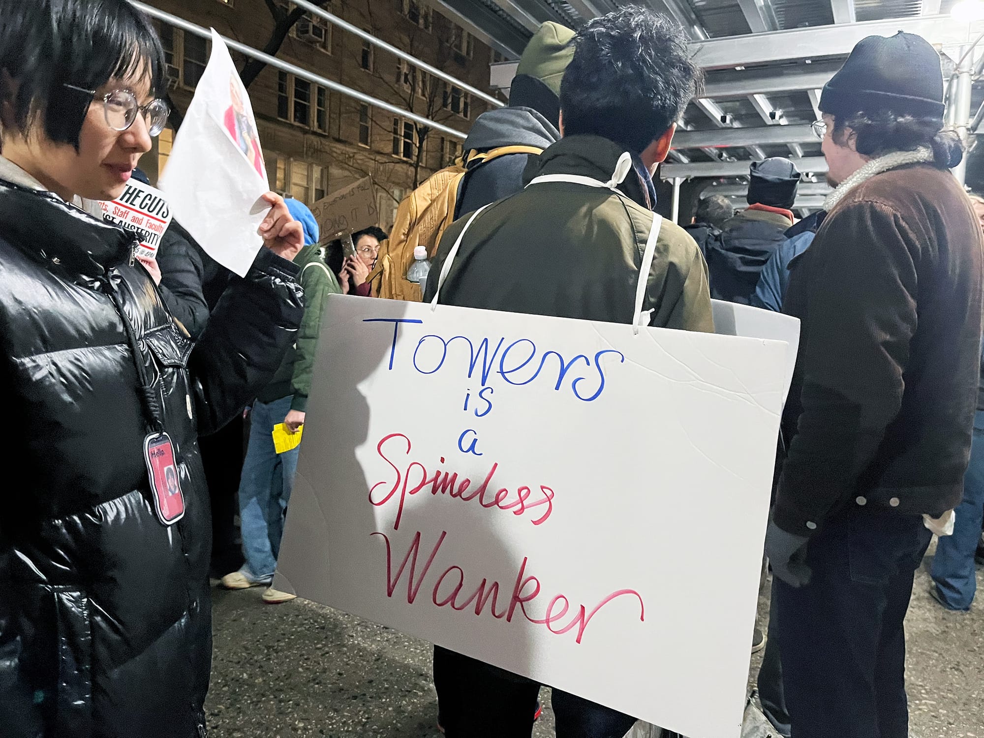 “Short on money, high on power, we don’t trust Joel Towers,” New School students and faculty chanted underneath the university building’s scaffolding.