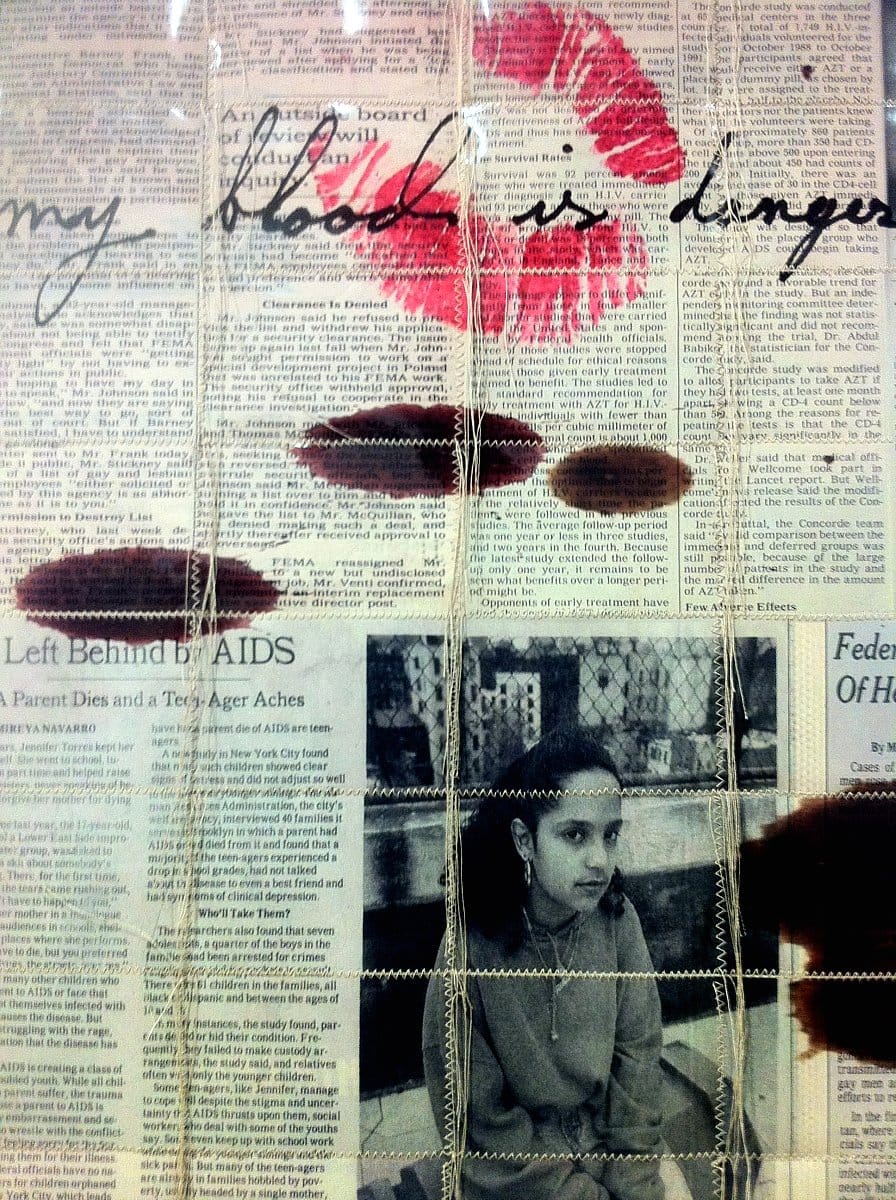 Overlooking the grounded mummies are photo quilts derived from Reynolds’ early 1990s Blood Spot series, in which the artist would extract his own blood and drip it over paper. For Survival AIDS, the spots were layered over New York Times clippings concerning HIV/AIDS and the LGBT community collected by Reynolds between 1989 and 1993. Originally presented as his Dialogue Tables and Activist Media Installations, they were scanned by Reynolds for this exhibit and stitched into Photo Weavings for Survival AIDS series. The sewn tapestries are an archive of frenzied headlines about the AIDS crisis, the obituaries of those consumed by the disease, and the growth of LGBT activist movements out of the 1980s. Some of the photo tapestries just have massive blood spots, others are formed into images, like a unicorn over articles on gay pride alongside those on gay bashing. In another is a photograph of Reynolds during a mummification performance reclined over a trail of blood.