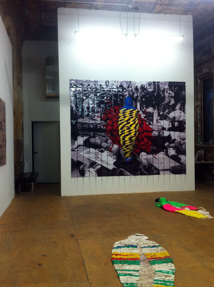 The mummy cocoons strewn across the Participant Inc. space are actually the wrappings of Reynolds’s mummification performances, during which the artist is completely coiled in colorful tape and plastic; the only gap is a space left over his nose to breathe. At the end of the gallery is “We Die in the Streets” (2011), a huge composite photograph of Reynolds during one of the mummification performances superimposed over a tumultuous black and white shot of an AIDS rally.