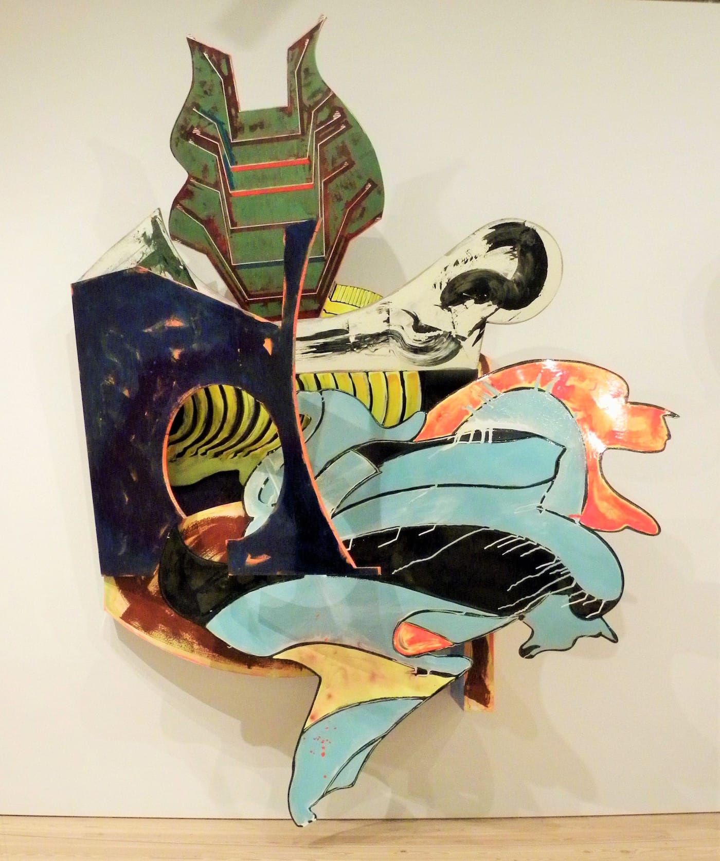 The general impression is of an artist in a hurry, never pausing to digest what he has done before racing towards his next move — a kind of neurotic production hyperactivity (perfectly symbiotic with capitalism) desperately attempting to outrun existential demons. Time and again throughout the Whitney retrospective, this viewer pondered whether a particular piece would not look better this or that way, and if this recurring question is a function of overproduction or of a certain lack of self-criticism. In “The Blanquet” “1988,” for example, part of the overambitious Moby-Dick series (266 pieces over 12 years), the flowing dark green and white shape extending from the front to the right side of the piece is “balanced” on the left by a particularly uninteresting horizontal extension. It is easy to visualize how much more dynamic, and not as predictably symmetrical, that the piece might be without it. In his pursuit of eradicating drama from art, Stella appears to have become the assembly line worker of his own style. This is what may have led painter Elizabeth Murray, whose artistic formation was undeniably influenced by his work, to make the pointed distinction that Stella is a great artist, but not necessarily a great painter.