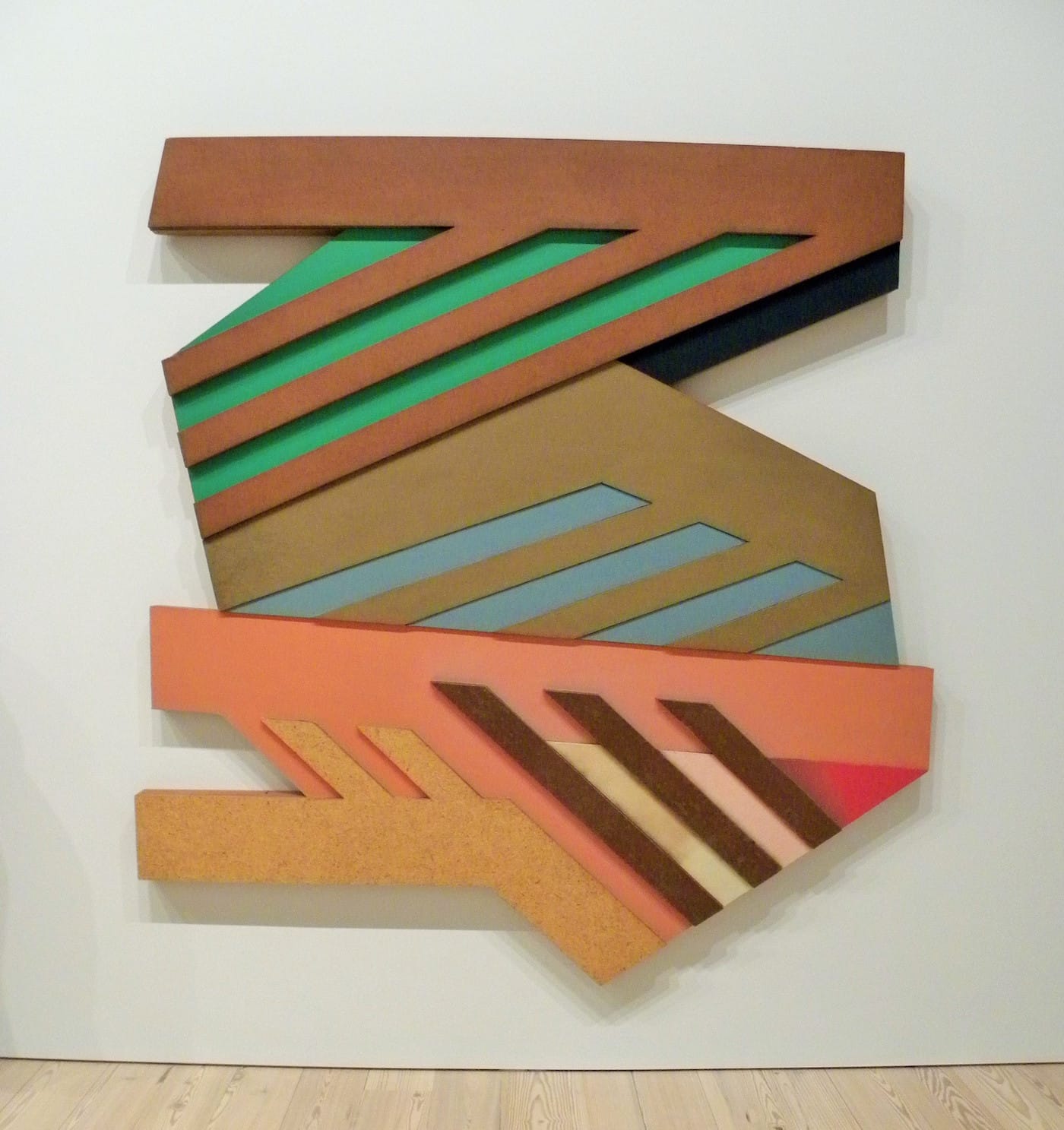 If Stella’s ambition and insatiable visual voracity were exhilarating at first (his titles reference such a wide range of fields that they endow his undertaking with a universal flavor), the paintings’ often overbearing size and physicality — somehow the smaller versions are not as convincing as the larger works (size matters!) — with each ranking as a formalist “tour de force” in its own right, also left the viewer, time and again, with the unsettling feeling of being wrestled to the ground (vestigial remains of his wrestling days in high school?). A vocal admirer of Hans Hoffman, Stella seems to have reversed the terms of that painter’s famous theory of spatial push and pull and applied it to his physical relationship with his viewers: first pulling them in, only to better push them out, alternating attraction and repulsion in a peculiar game of puppetry, with the artist as puppet master and the viewer as puppet.