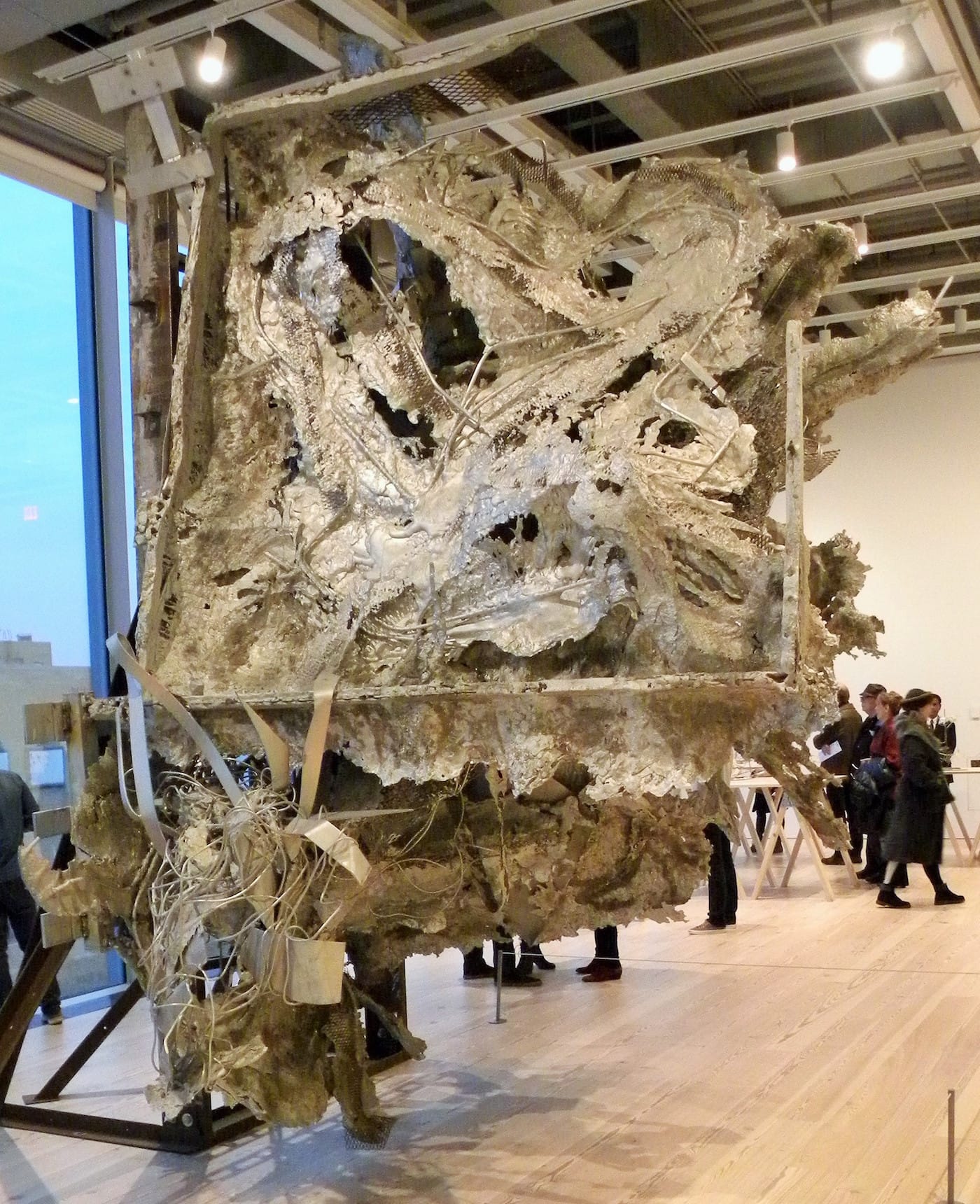 All of this onrushing energy seems to be culminating in the spectacular version of “The Raft of the Medusa” (1990), a contemporary take on Gericault’s masterpiece as a fragment of a plane crash, complete with molten aluminum and splintered wiring. “Medusa” is part of a large body of sculptures featuring other famous catastrophes, including the nuclear meltdown of Three Mile Island. The air disaster has replaced the sea tragedy. The epic slowness of the Medusa episode, survivors drifting for days on an aimless raft, has been replaced by the instant, matter-of-fact presence of the wreck: an almost too perfect illustration of philosopher Paul Virilio’s intuition of the accident as the ultimate aim of speed.
