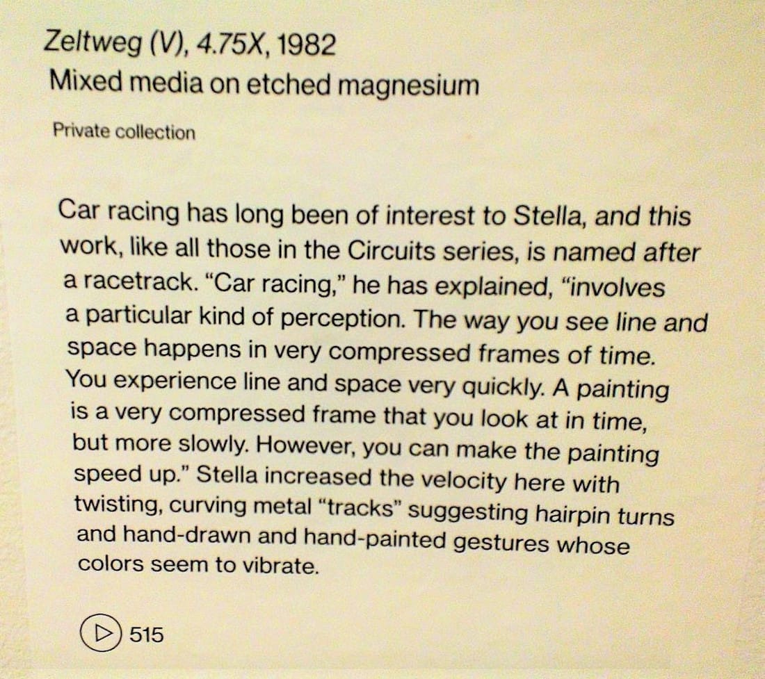 Speed came to play an increasingly important role in the artist’s biography as well, with his well-publicized fascination for fast cars. A wall caption next to “Zeltweg (V)” (1982), of the Circuit series, brings up the artist’s personal experience: “Car racing,” he explains, “involves a particular kind of perception. The way you see line and space happens in a very compressed frame of time. You experience line and space very quickly. A painting is a very compressed frame that you look at in time, but more slowly. However, you can make the painting speed up.” But speeding up the painting also speeds up its viewer’s experience and reduces it to something akin to glimpsing a billboard incidentally by the side of the road, pushing it into the category of works that, like advertising, visually asserting themselves but have little to say past their initial impact.