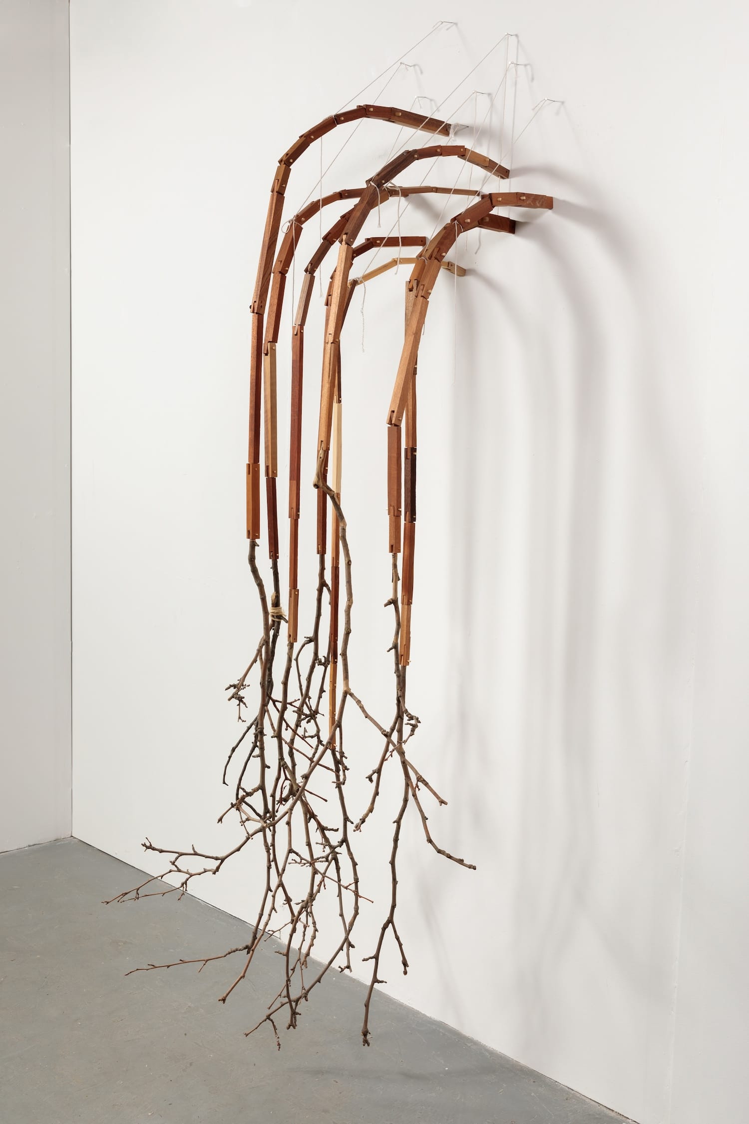 Created using wood, branches, and dried plants collected at Wave Hill's 28-acre estate, Stephanie Beck’s site-specific project “Bough” (2024) consists of a series of abstract sculptural “drawings,” accompanied by an installation of local migratory bird songs.