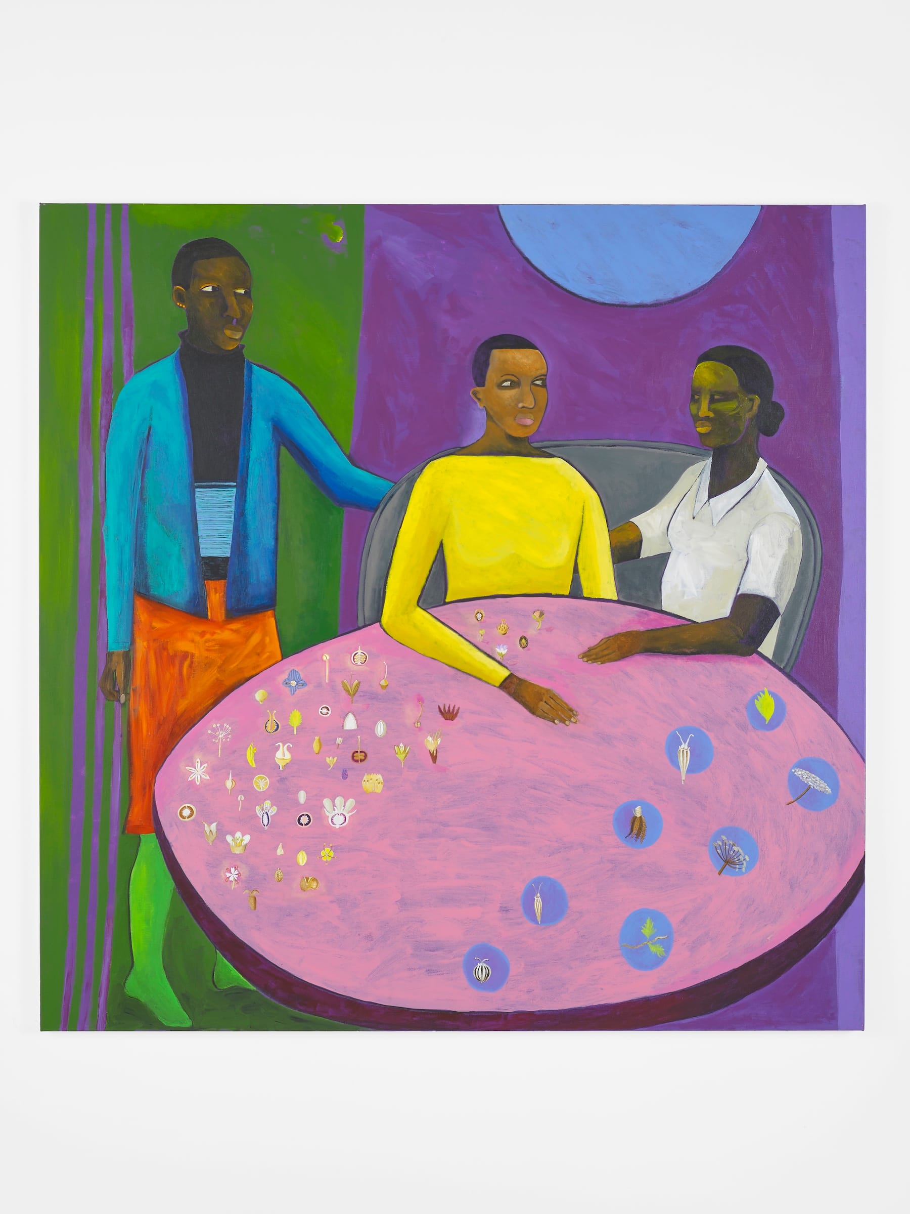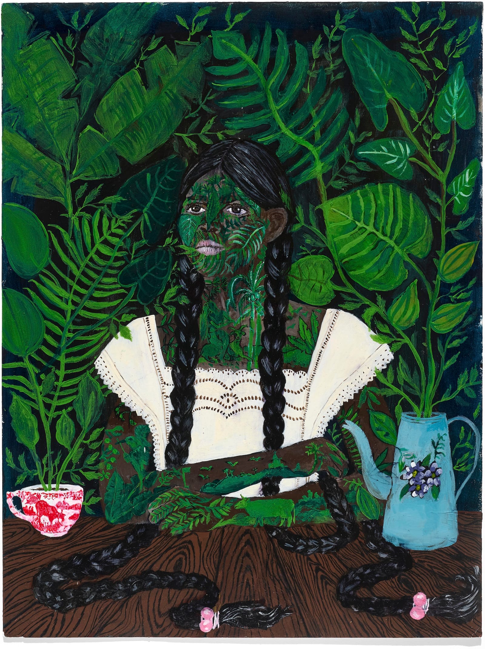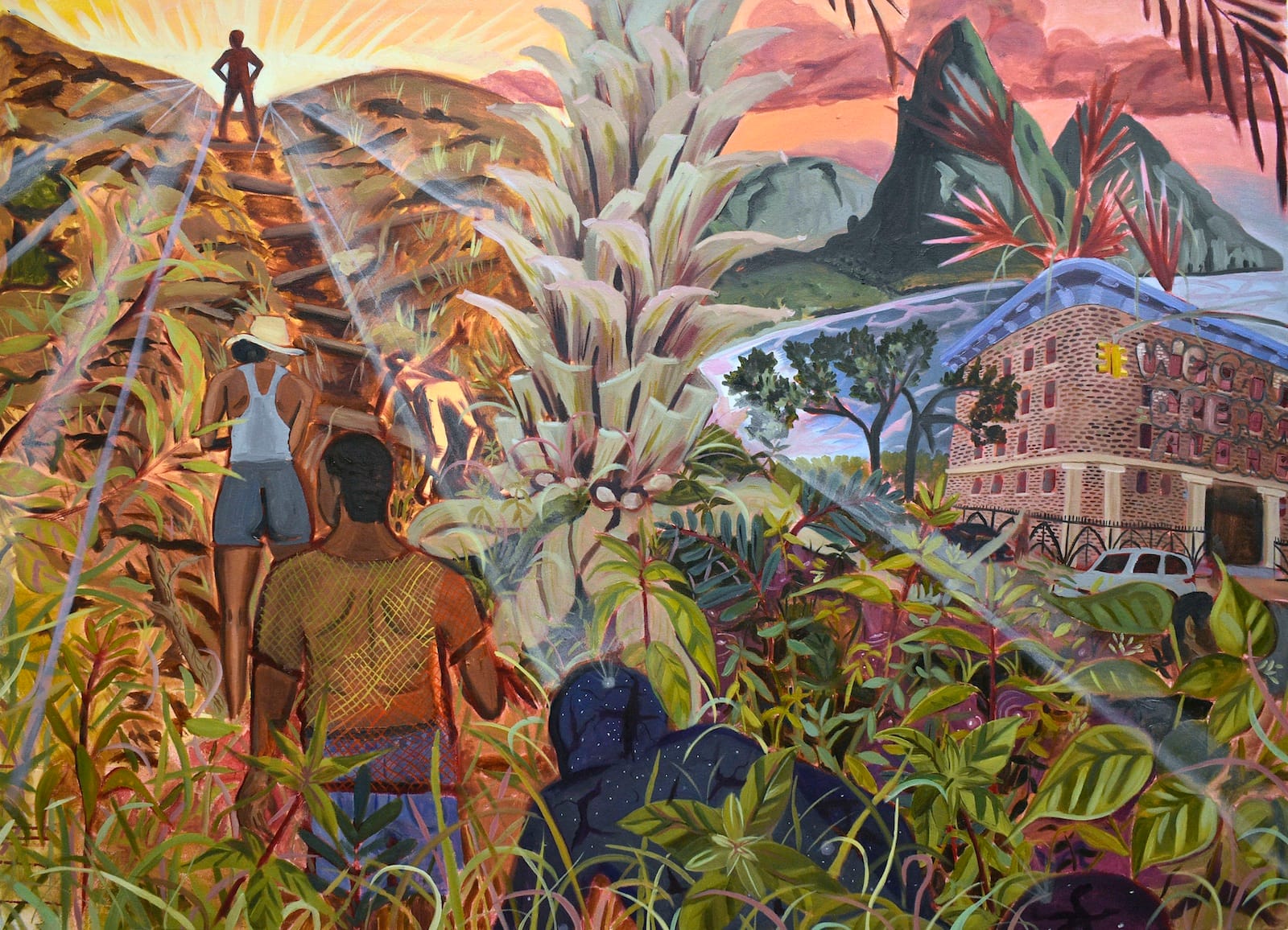 After an unexpected health episode last fall, first-generation Haitian-American artist Madjeen Isaac embarked on a series of works tackling her struggles and frustrations intertwined with solidarity and support from her community. Infusing Caribbean flora and fauna into the brick facades and wrought iron gates of New York City, the artist depicts Black communing and joy outside the confines of reality.