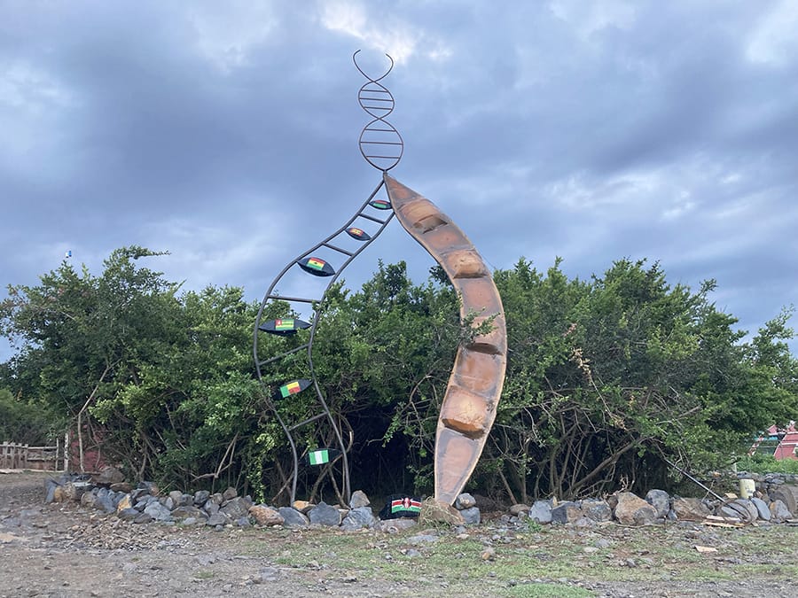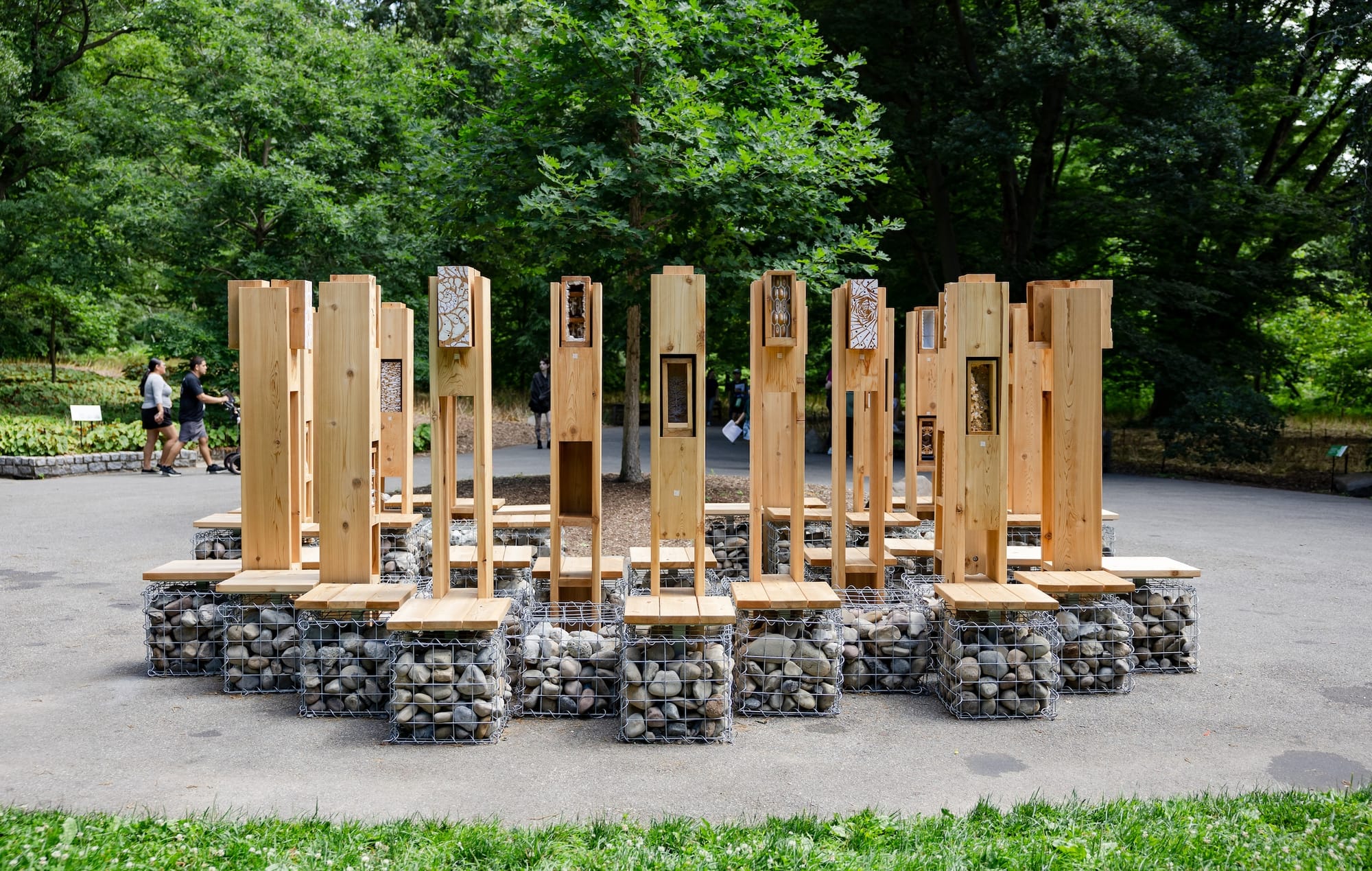 A monument consisting of an interlocking ladder with sculpted acacia seeds honors Kenya’s 42 ethnic communities. The site-specific installation, which debuts Wave Hill’s recently restored Glyndor Terrace Garden, is paired with programming including a planting of African daisies in honor of deceased ancestors.