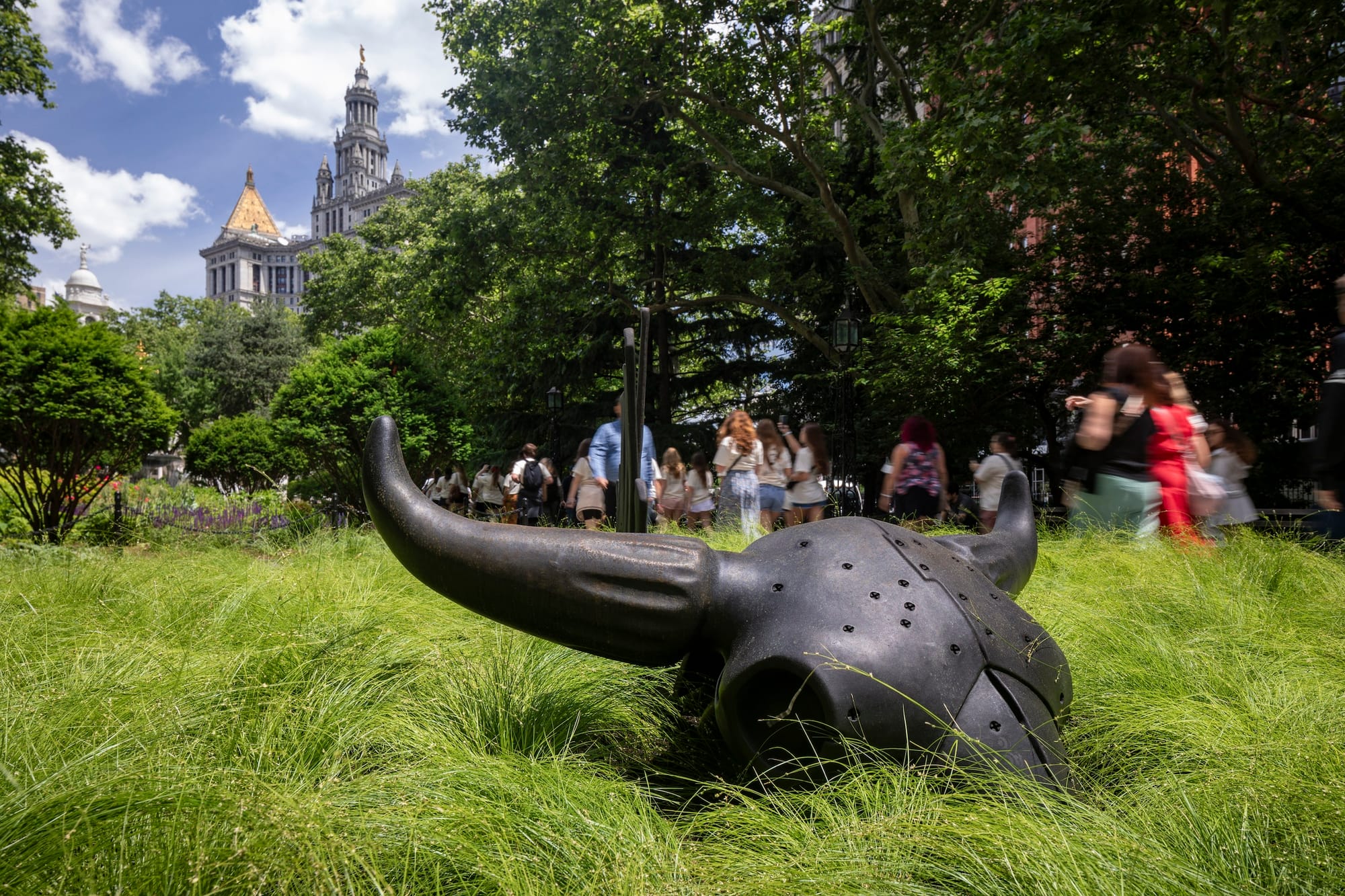 Next time you find yourself waiting at a bus stop or wandering through a park, Public Art Fund’s outdoor art installations might offer you a chance to transform your relationship to the city. Adrienne Elise Tarver’s paintings of Black women in repose will provide moments of stillness amid your commute, while Huma Bhabha’s patinated bronze sculptures along the Brooklyn Bridge Park waterfront feel both strange and familiar. Meanwhile, Cannupa Hanska Luger pays homage to bison populations with a poignant steel skeleton in City Hall Park, and Edra Soto adorns the southeast entrance to Central Park with a participatory installation rooted in rejas, or wrought-iron screen doors common in Puerto Rican architecture.