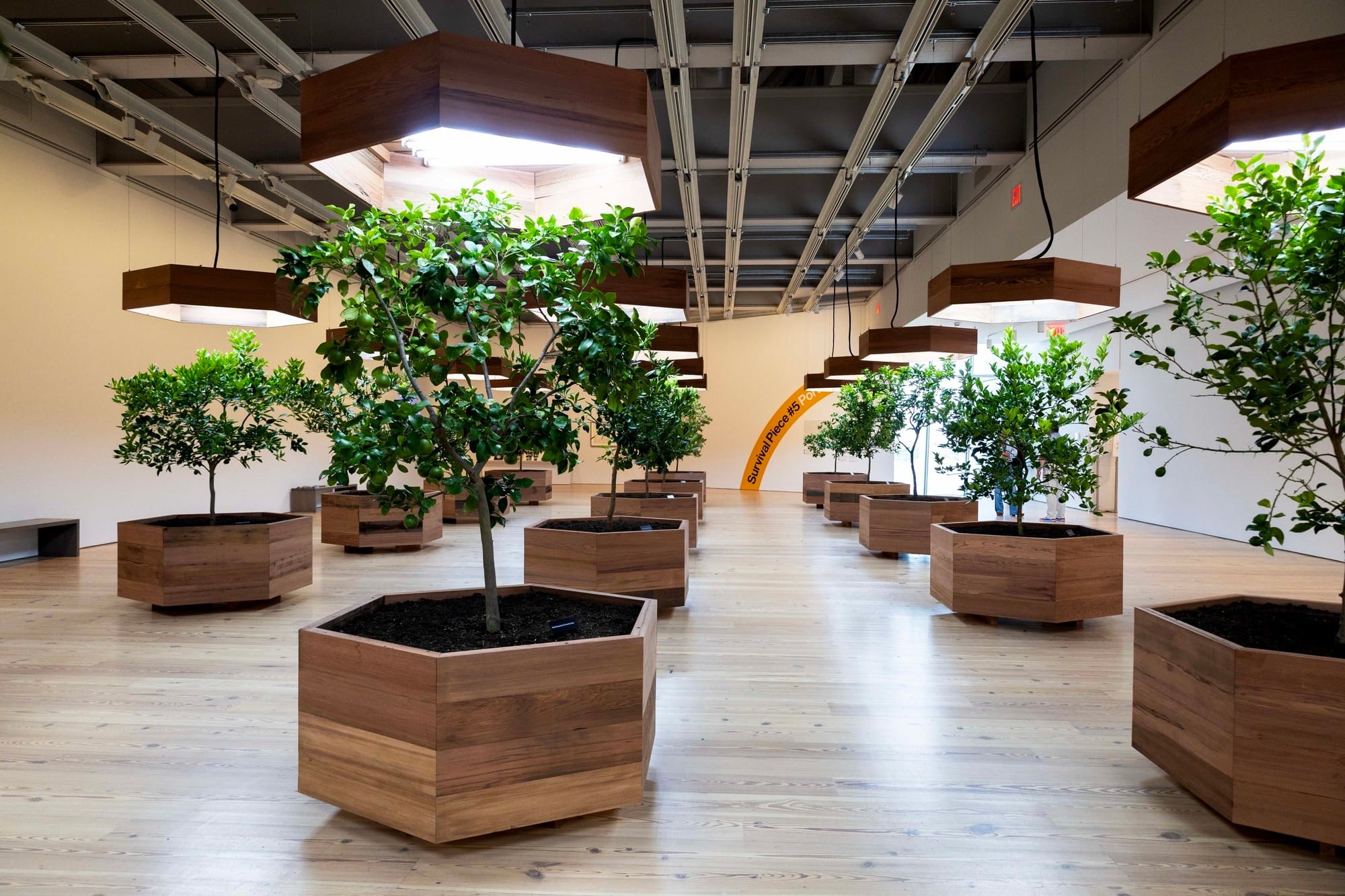 The Whitney reaches into the past for answers to our future in this eighth-floor presentation of collaborators Newton and Helen Mayer Harrison’s indoor citrus grove. Designed by the environmental artists in 1972 as one of seven connected projects built to create a sustainable food source in the face of ecological obsolescence, Survival Piece #5: Portable Orchard consists of 18 self-sustaining citrus trees with individual lighting units.