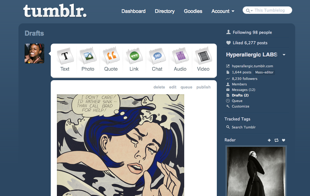 You don’t even need to sign up for Tumblr to view LABS — you can read and comment on our tumblelog itself without having your own Tumblr account. Still, most people read Tumblr posts on their dashboards, the Tumblr homepage. The dashboard serves as a chronological aggregate of all the tumblelogs your account follows, like an RSS feed reader just for tumblelogs, or a Twitter with images and video added in.
