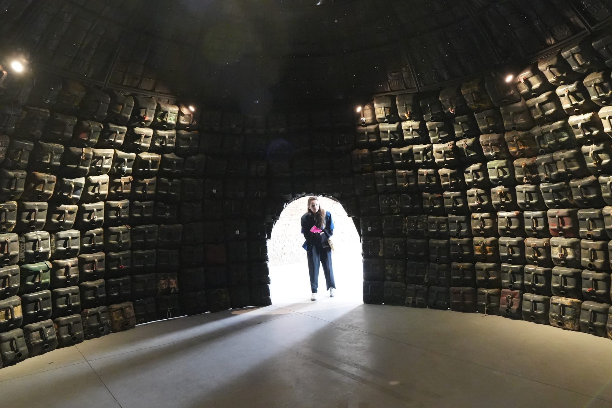 Towering at the center of the Benin Pavilion is Romuald Hazoumè’s “Àṣẹ,” a dome of jerrycans, or gasoline canisters, into which the viewer is invited to step. The canisters face downward, as if about to pour out their contents, and the faint scent of incense imbues the dome with a sacred quality. Àṣẹ, also Anglicized as ashe, comes from Yoruba philosophy, meaning the power that produces change in the world. Hazoumè is known for working with recycled materials, repackaged as art that gets returned to the West.
