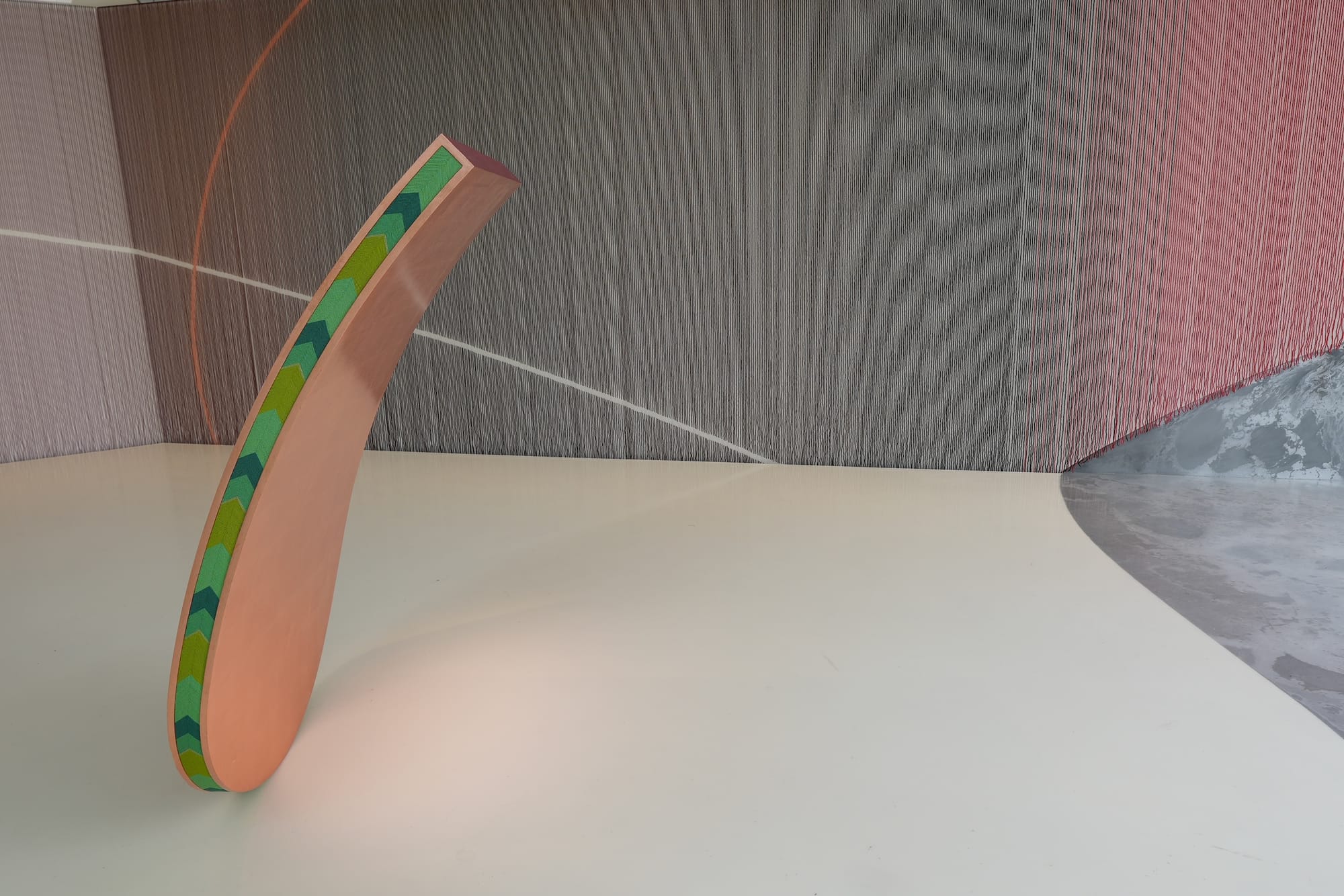 Artist Kapwani Kiwanga focuses her contribution to the Venetian biennial on conterie (seed beads) that originated on the Venetian island of Murano and found their way around the world as decoration and currency. The beads drape across some of the pavilion’s walls and windows, giving the space a theatrical feel, but the sculptural objects are the real draw. Made with Zimbabwean and Canadian artisans, “Transfer III (Metal, wood, beads)” (2024) is one of these stunning objects, combining beads with, in this case, wood, copper, and Pernambuco pigment. The beautiful lift of the graceful object shows us Kiwanga’s formalist chops. It also reinforces that while the stories and history may be foundational for her work, her forms writhe and twist seemingly free of the restrictions that history can sometimes impose. My only critique is that the work veers so far into what I would term luxury retail display aesthetics that I was expecting to find a gift shop in a quiet corner of the installation — and the funny thing is I would’ve gone to town buying everything in sight. — HV