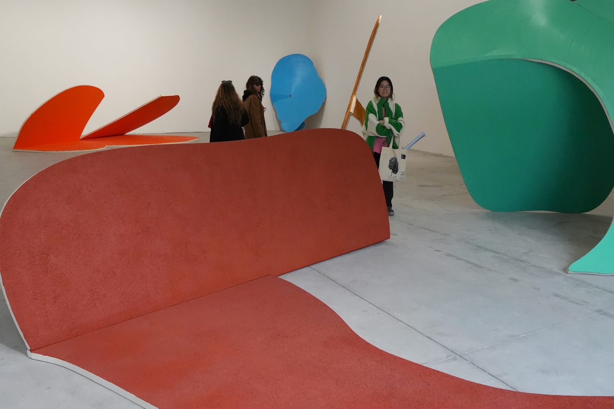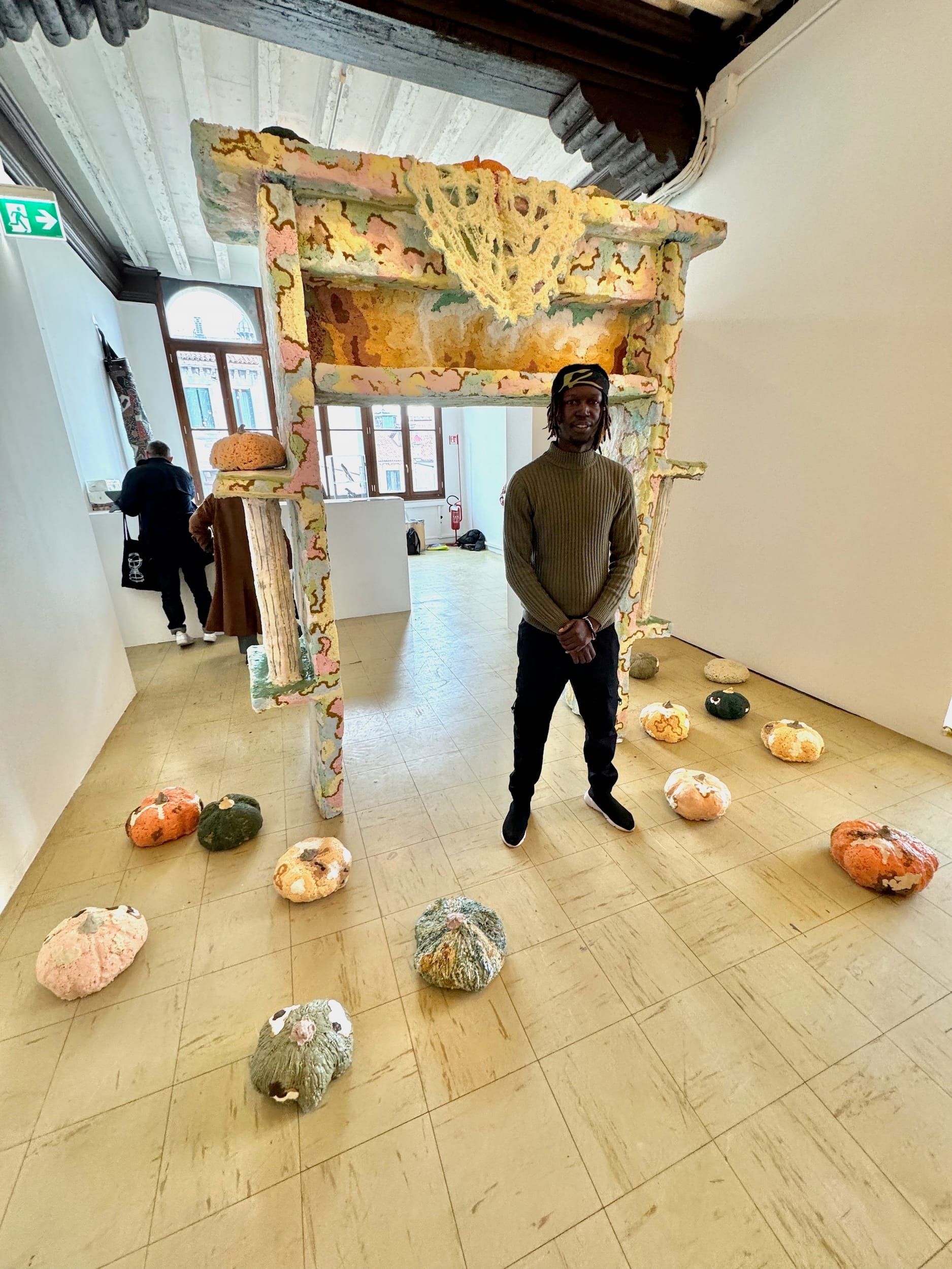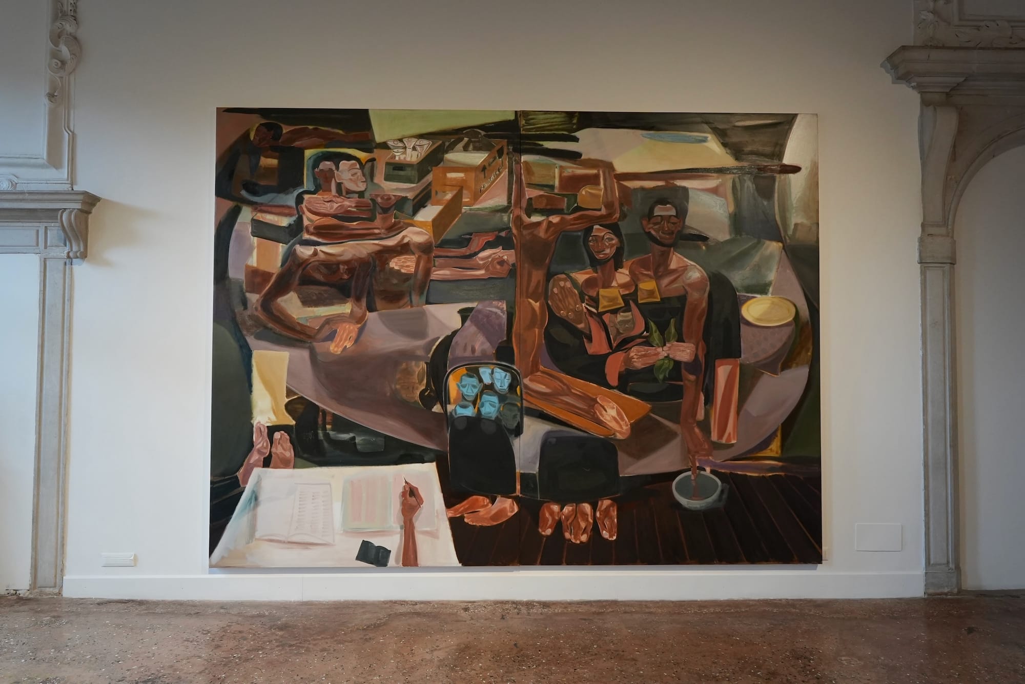 You might have trouble finding this pavilion, which is quite a climb up unlit stairs (there’s also an elevator), but the trek is more than worth it as Zimbabwe continues to demonstrate why it is a powerhouse of art. The pavilion is centered around the concept of “kududunuka,” which is the process of unraveling the ideas of time; geography, space, identity, humanity, migration, and nationhood. Troy Makaza’s large wall works and colorful sculptural installation, “mwana wamambo muranda kumwe (A prince can be a slave anywhere)” (2023–24) — which is placed prominently at the entrance and forces you to negotiate how to walk past it into the exhibition — are some of the standouts in a rich display that reimagines the world through abstraction and appears to quote freely from the world around us. Makaza, like many of the artists on view, is working to develop a universal artistic language without losing the accents and specificity of Zimbabwe’s geography and lived realities, and I think it’s very much working. — HV