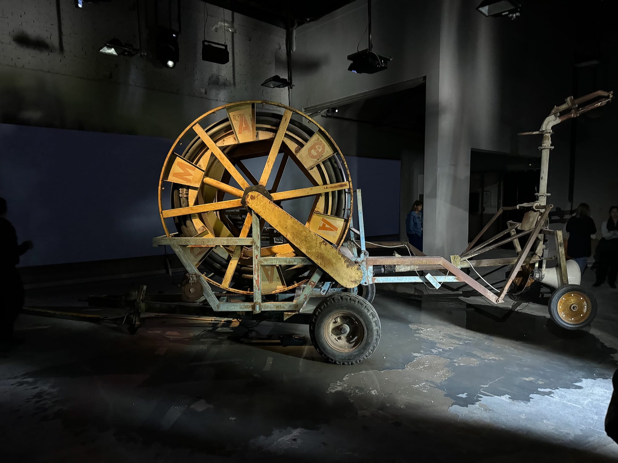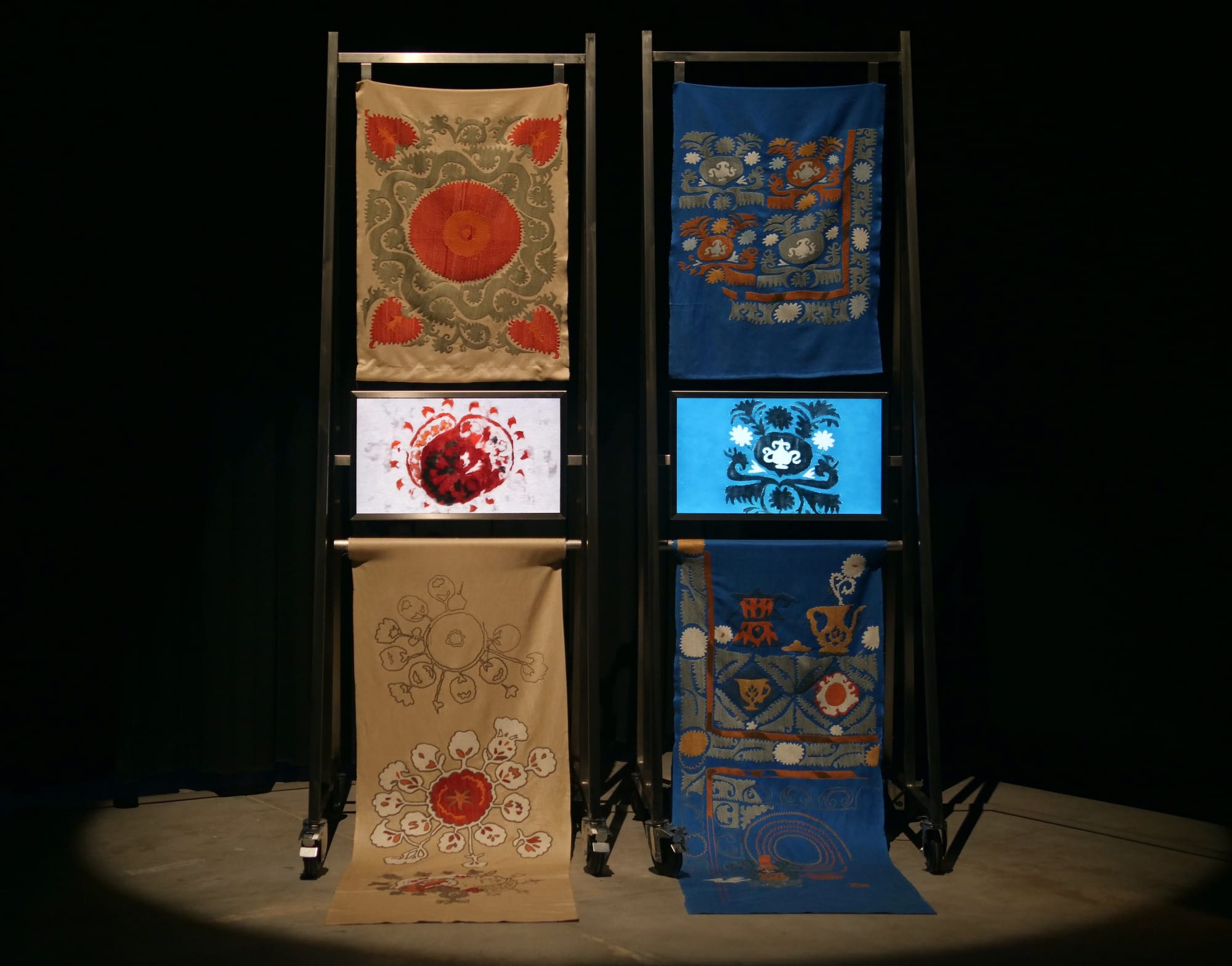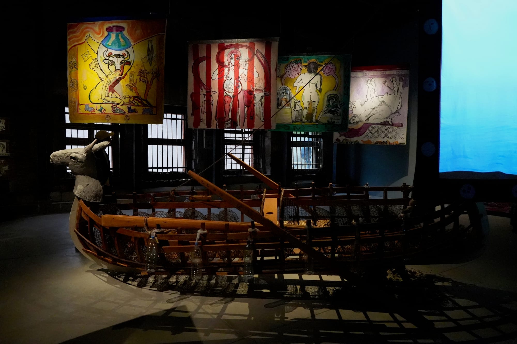 We enter artist Aziza Kadyri’s Don’t miss the cue! from the backstage of a theater, referencing the House of Culture, which the curatorial statement describes as “spaces from the past that were once vibrant community hubs in the early twentieth century” through much of Eurasia. Blue strips and rolls of fabric and assorted garments hang from production scaffolding. Visitors progress through a series of speculative installations before emerging at the frontstage, pushing through blue curtains to arrive at chairs and cameras directly facing them. It’s a jarring experience as viewers transition almost immediately from observer to observed, an effect designed to mirror the experience of migration. One camera feed shows the director’s view of the frontstage, shot from above, and another feed uses AI to place traditional suzani textile patterns on top of visitors’ faces.