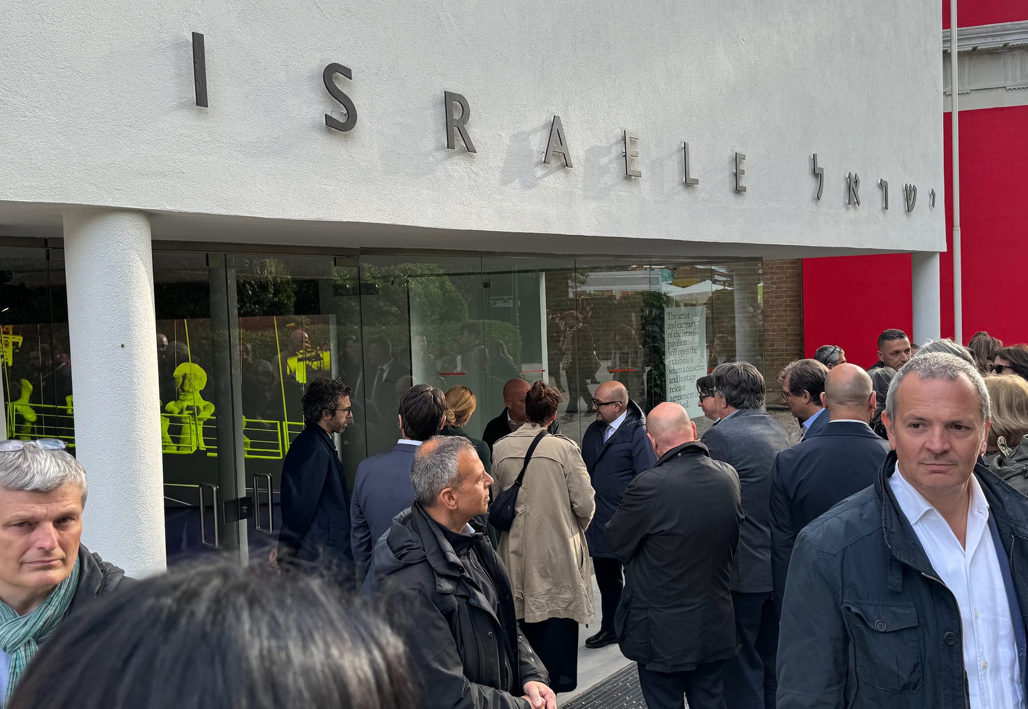 Apparently this pavilion is “closed” until a hostage deal and Gaza ceasefire are reached, but that didn’t stop the artist from giving curatorial and other tours of the exhibition to numerous people, which seems easy enough to do considering the video work is clearly visible from outside the large front windows. When I walked by during the press preview, Patir was giving a tour to right-wing Italian culture minister Gennaro Sangiuliano. — HV