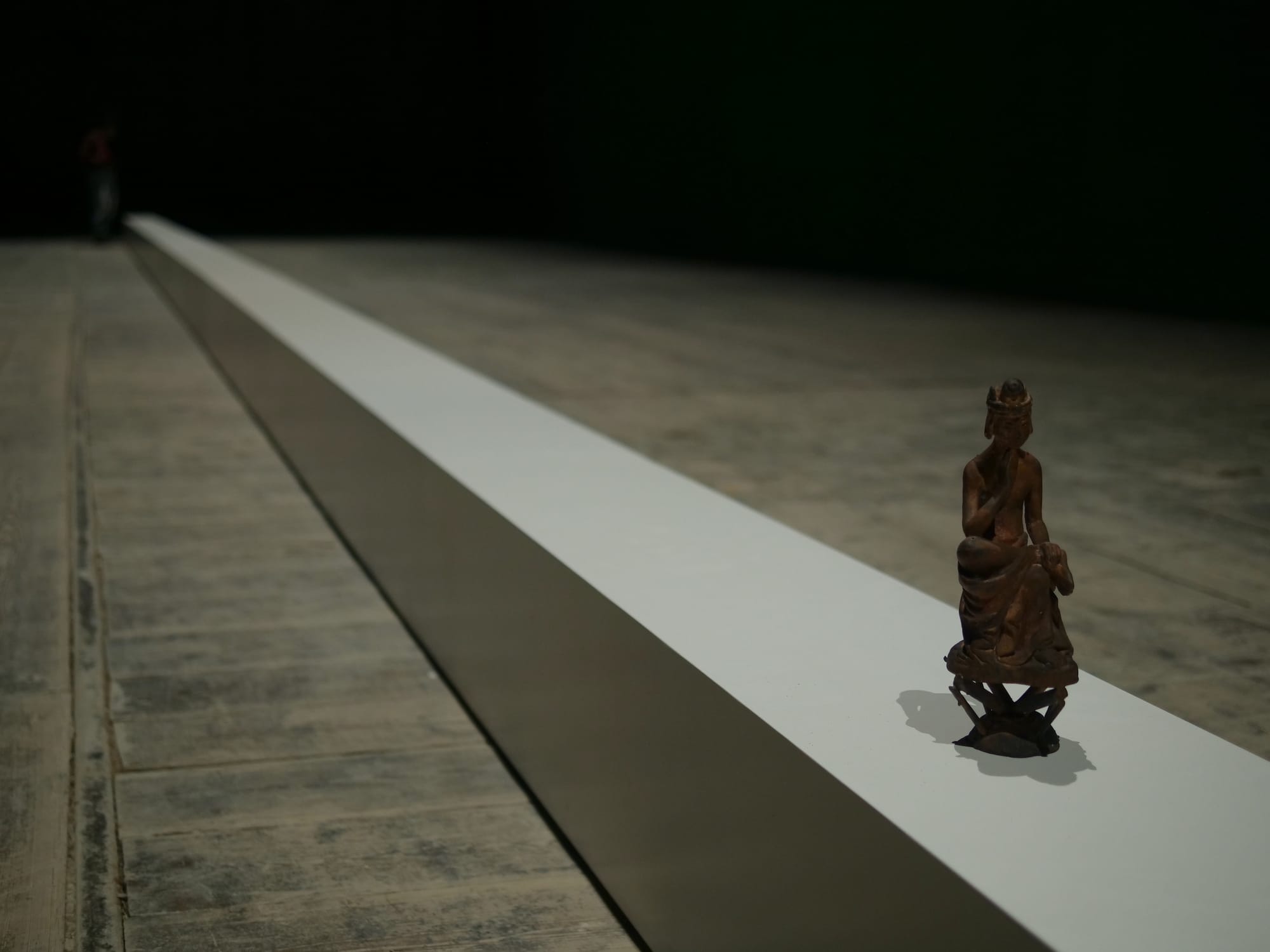 The second installation is much quieter but just as visually arresting. Titled “Pensive Bodhisattva on A Flat,” it’s also a play on words. The work is just that — a bodhisattva statue on a long, flat column of wood laid on the ground. At the same time, a steady drone hums through the room in A flat. As visitors walk along the column, they can see on the other end that the wood column is in fact an organ pipe. As curator Luca Cerizza wrote, “this project suggests how hearing — or, better, listening — is a form of attention to others.” But I think it’s more than that; this show strikes me as just as much about the architectural expression of spiritual experience. — AXM