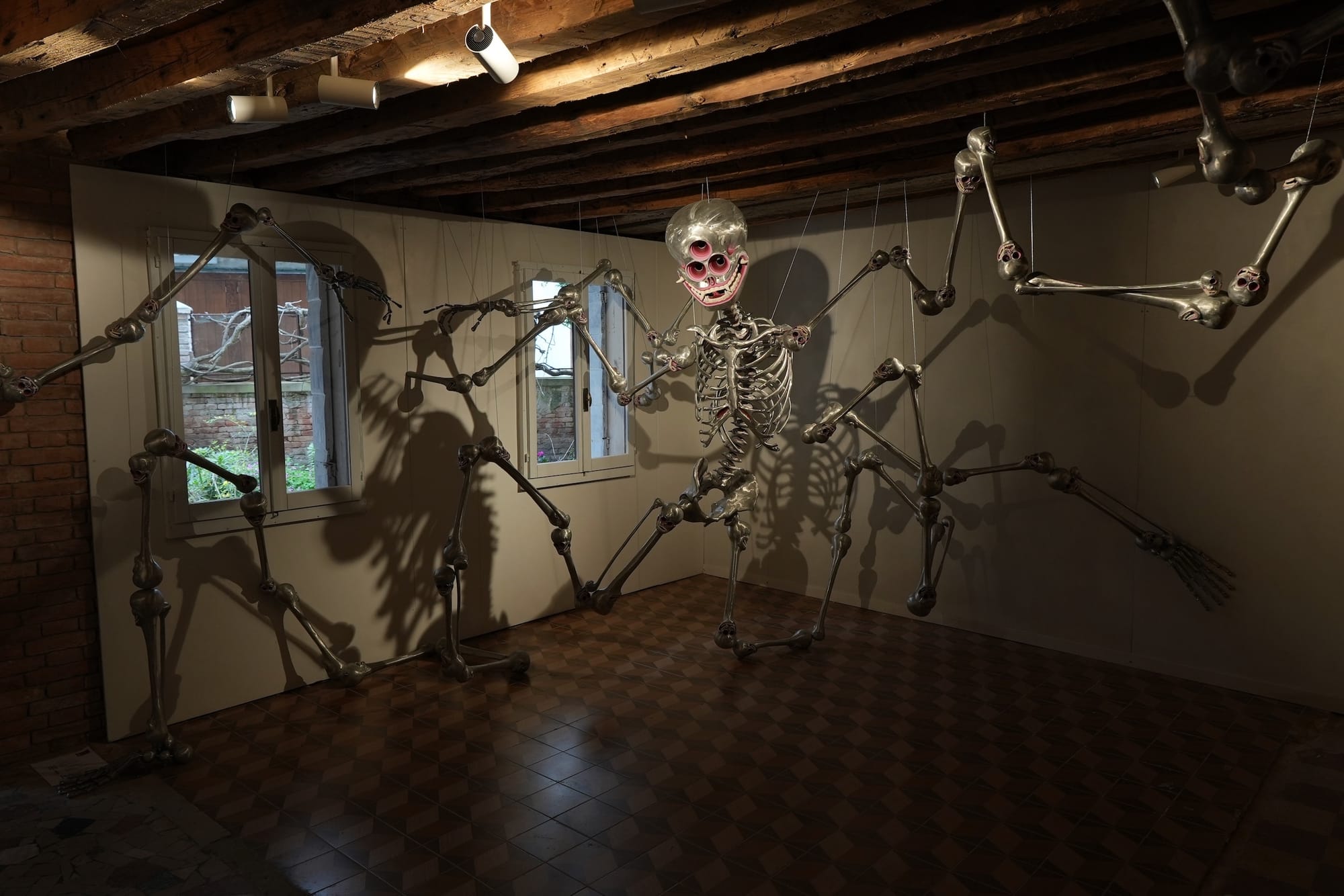 The central figure in Ochirbold Ayurzana’s installation just outside the Arsenale is frightening, almost garish: an aluminum skeleton figure, with a three-eyed head and joints made of skulls. The interiors of the eye sockets and mouths are bright pink, and its many limbs and wire hanging make it look like a spider reaching out for a gentle embrace. Another skeletal figure seems to cling horizontally to the ceiling, looking down at visitors who walk beneath. The works are inspired by the Vajrayana Buddhist deity Durtoddagva, also known as Citipati, often depicted in traditional art as a pair of dancing skeletons to represent the twin energies of death and awareness.