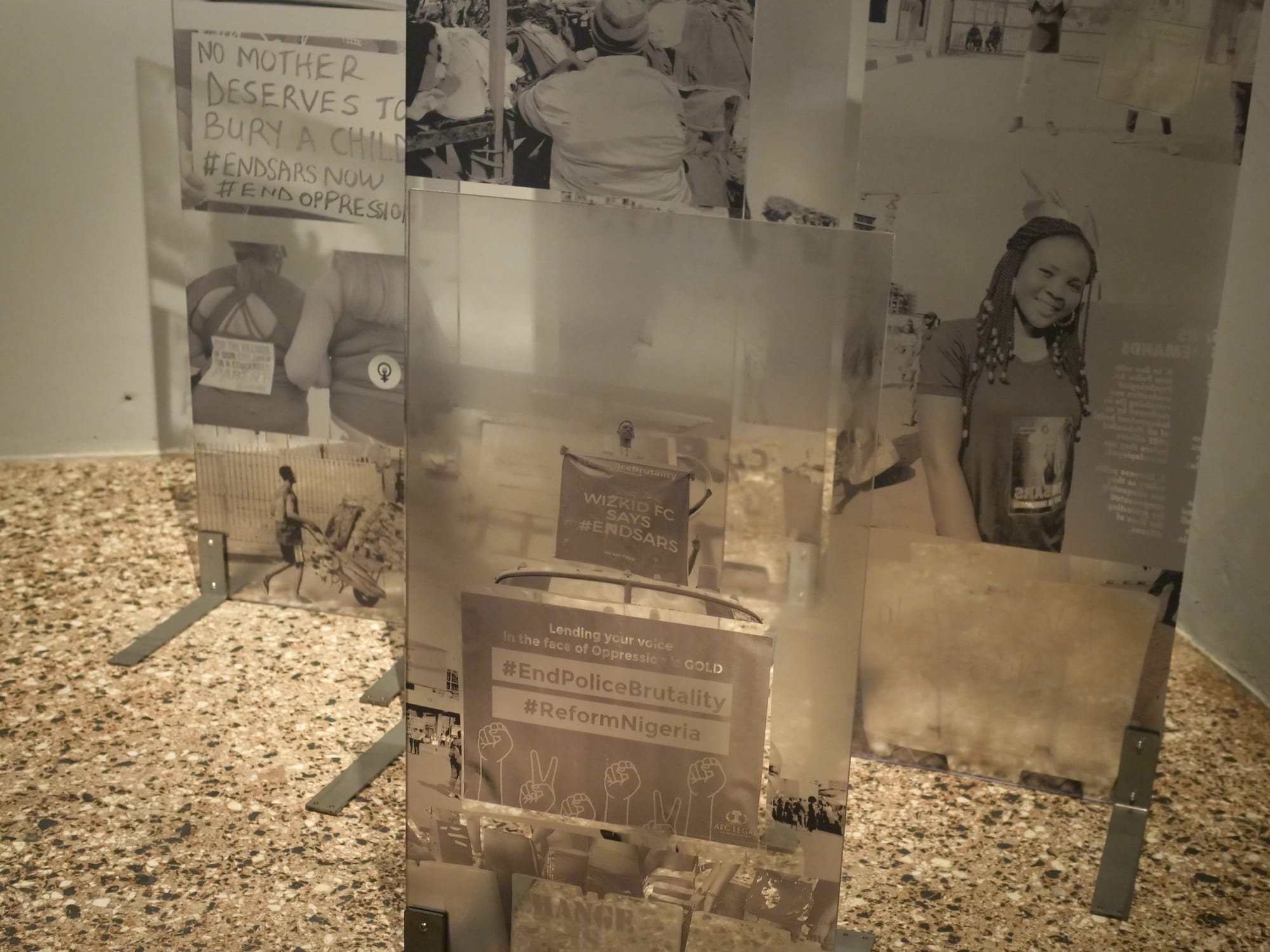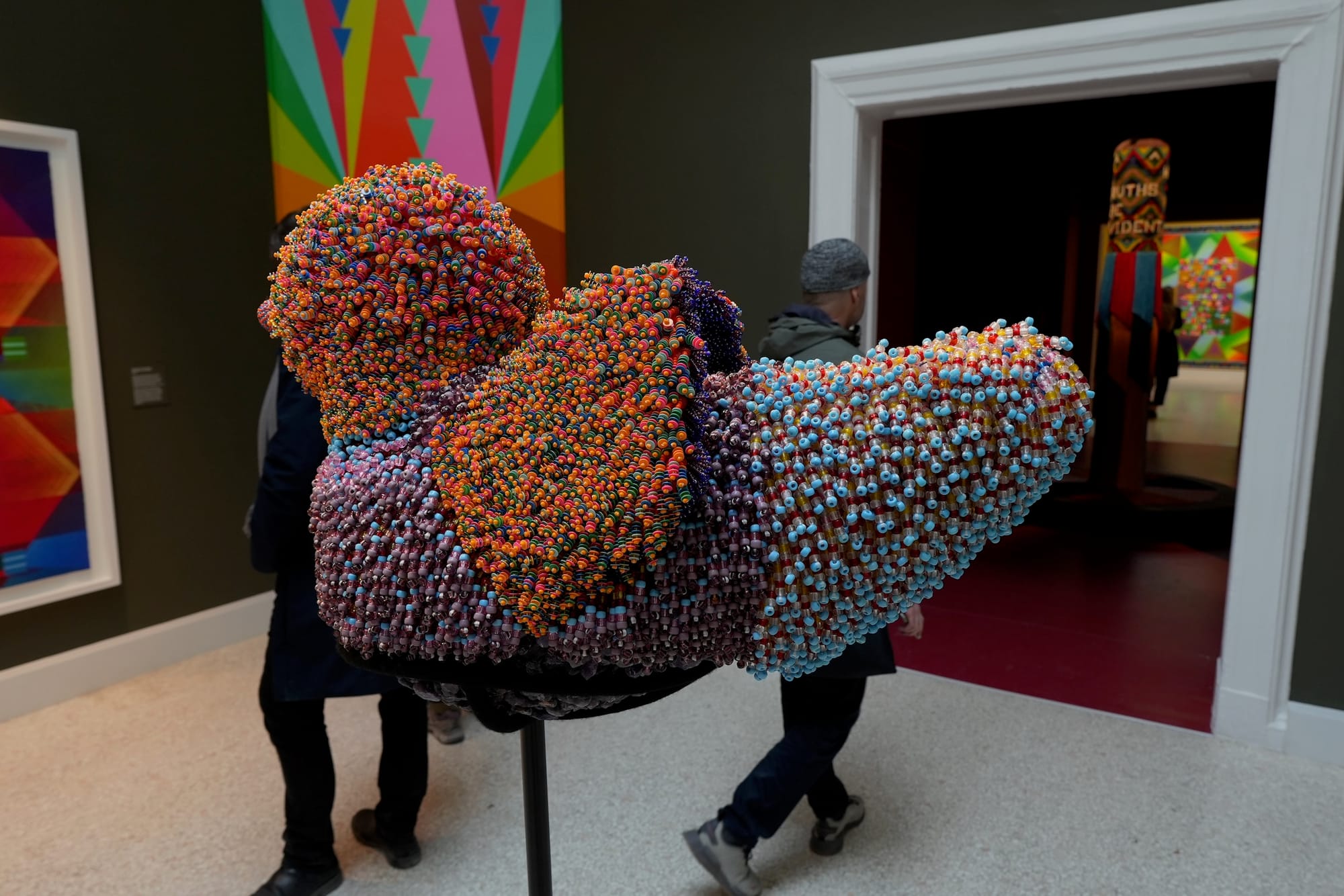 Contemporary works include artist Yinka Shonibare’s “Monument to the Restitution of the Mind and Soul,” incorporating 150 clay objects taken during the Benin Expedition of 1897, as British forces captured the capital of the Benin Kingdom and stole thousands of spiritual and cultural objects, many of which are housed in the British Museum. Ndidi Dike’s “Blackhood: A Living Archive” consists of wooden batons and paper tags, each displaying the name of a Black person in Nigeria, Brazil, or the United States who died from police brutality. Dike makes a connection between the Black Lives Matter movement and #EndSARS, a Nigerian effort to dismantle the Special Anti-Robbery Squad (SARS), accused of significant human rights abuses in the country.