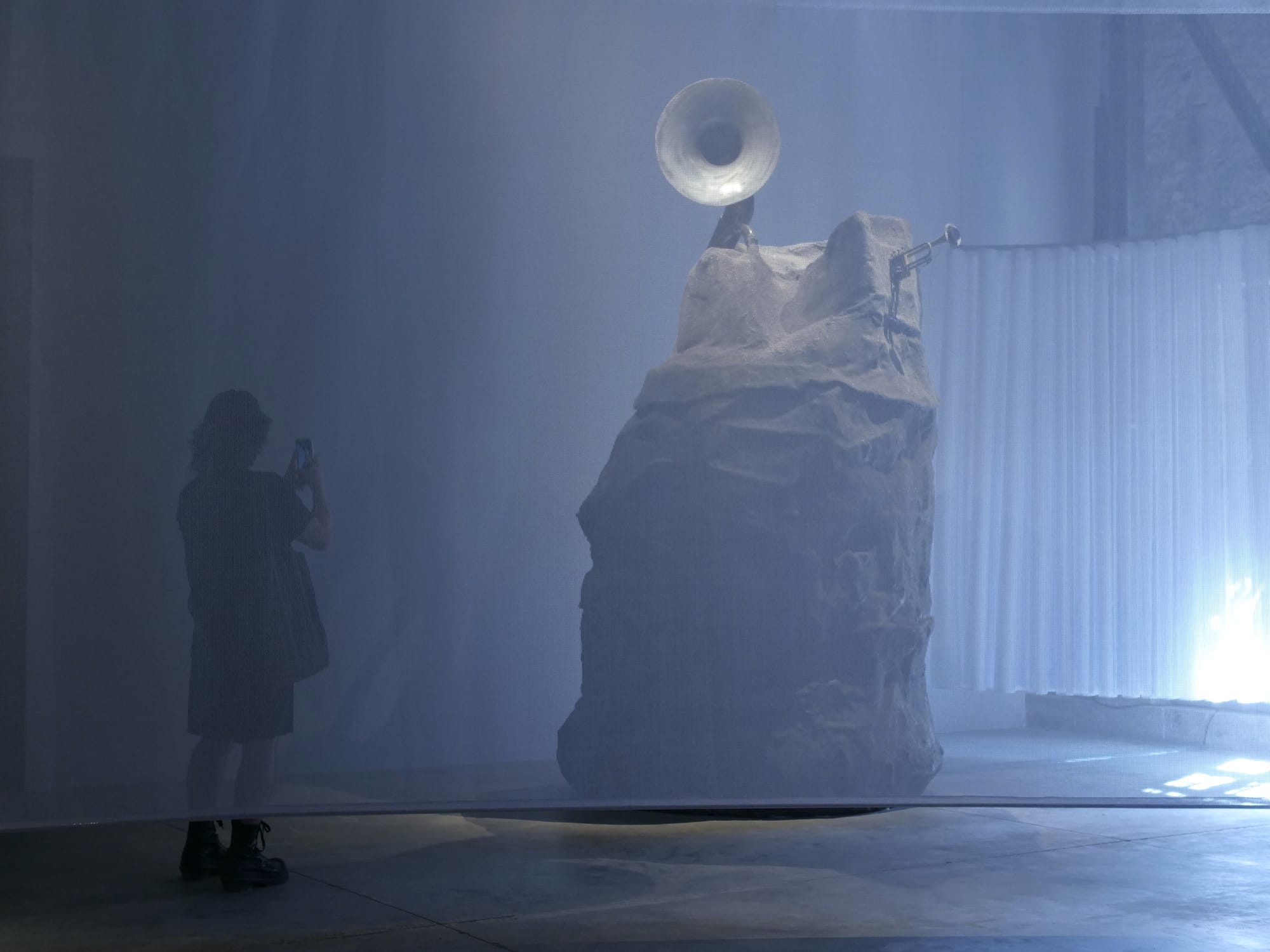 In the heart of the Arsenale, artist Mark Salvatus has constructed a multimedia encounter with Mount Banahaw, a volcano system in Luzon, Philippines, considered holy and spiritual by locals and a popular site for pilgrimage. Throughout the installation are a series of boulders with tubas and other horned instruments placed atop. A smaller series of boulders serve as benches for viewing a video in the center of the installation, which shows musicians crossing the mountain, some trilling their lips and others dancing with glowing goggles that might be worn at a rave.