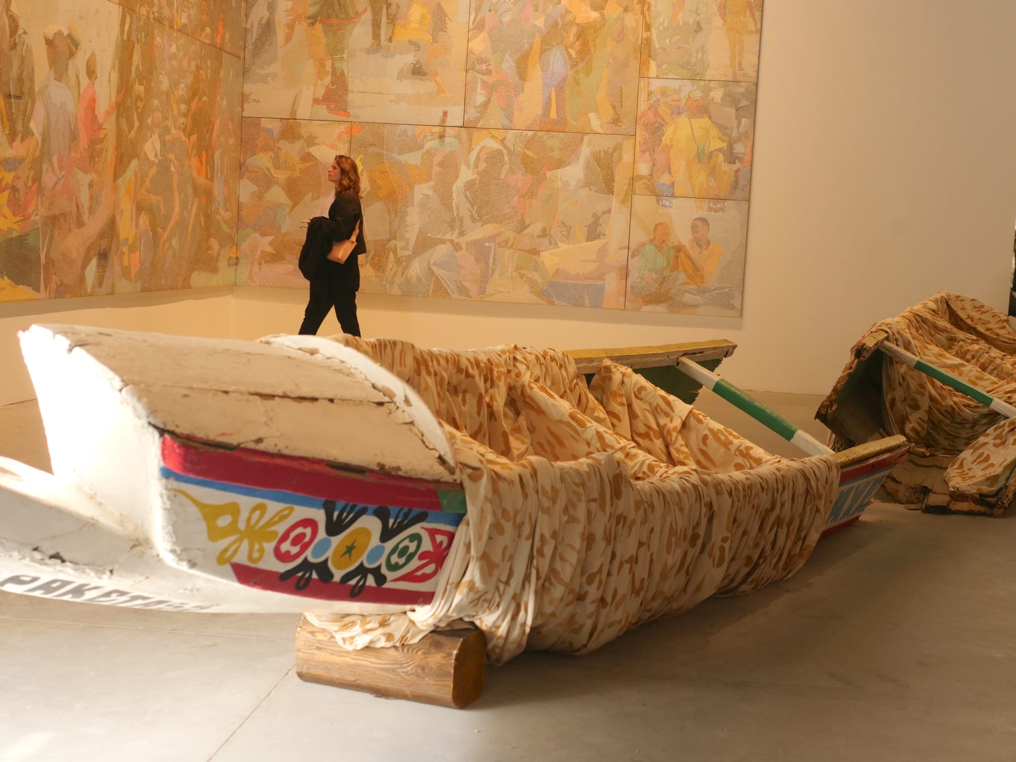 The bilingual title Bokk – Bounds references the Wolof word bokk, which can mean “what is shared.” Alongside a beautiful series of paintings that appear pointillist from afar, artist Alioune Diagne and curator Massamba Mbaye installed a traditional Senegalese canoe broken in half, alluding to migration but also, I think, the ruptures therein. Just last year, the Senegalese navy began announcing efforts to stop boats of migrants from leaving its shores for places like Italy, all amid rising migration rates to the country in general.