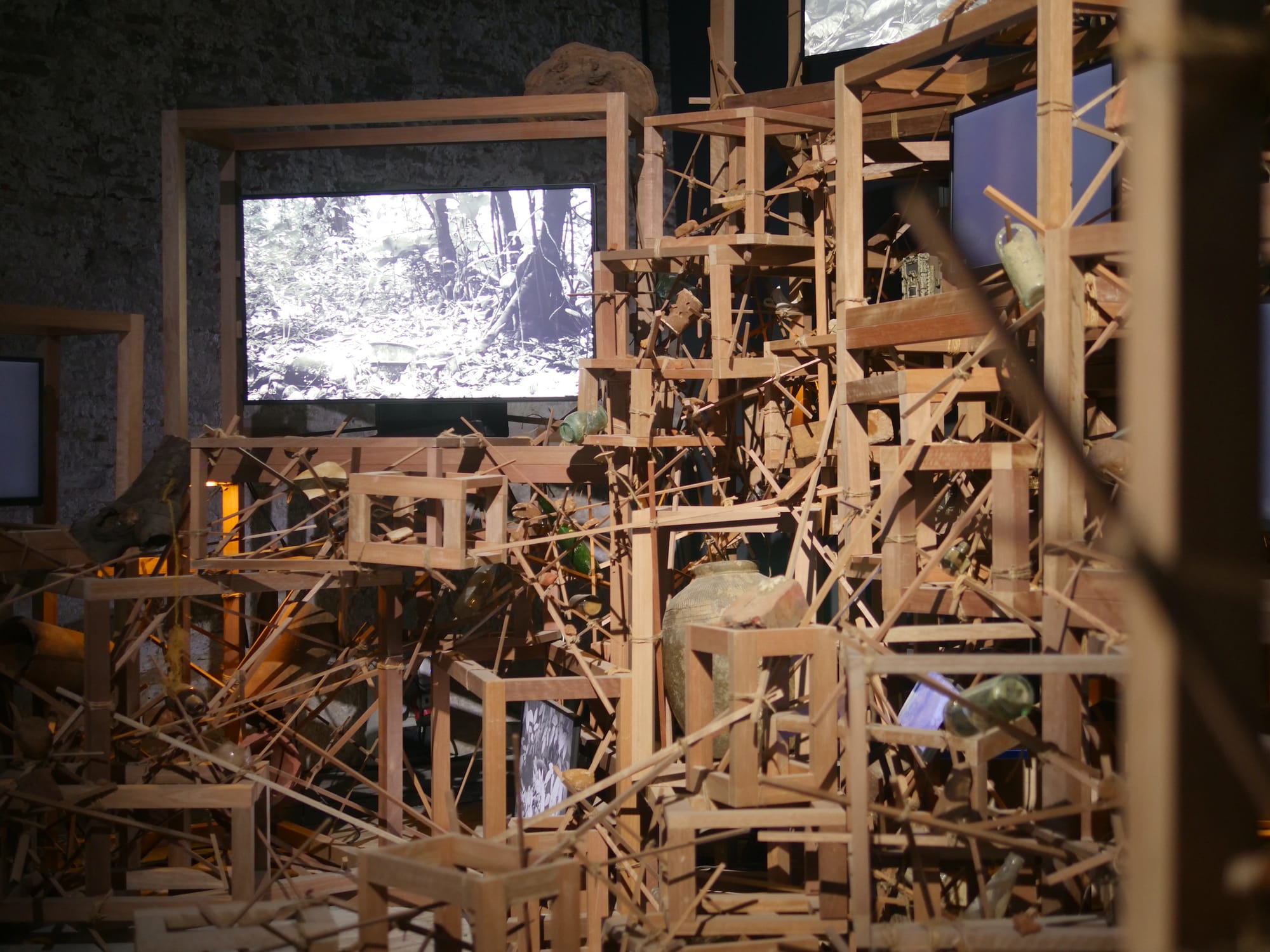 “Trash Stratum,” the centerpiece installation, is a series of objects from the country’s Queens Own Hill, building from earlier work in critical zoology. The objects are interspersed with wooden sticks and boxes, and they include everything from alcohol bottle fragments used by the Japanese Imperial Army to a flowerpot and fallen birds nests. Videos nestled among the objects depict six years of the artist’s surveys of the hill. At the show's entrance is “A Guide to a Secondary Forest of Singapore,” an archival pigment print illustrated to show some of Zhao’s investigations. If nature is the entry point for his explorations, the built environment is its dominating framework, reflecting decades of urban development and expansion. — AXM