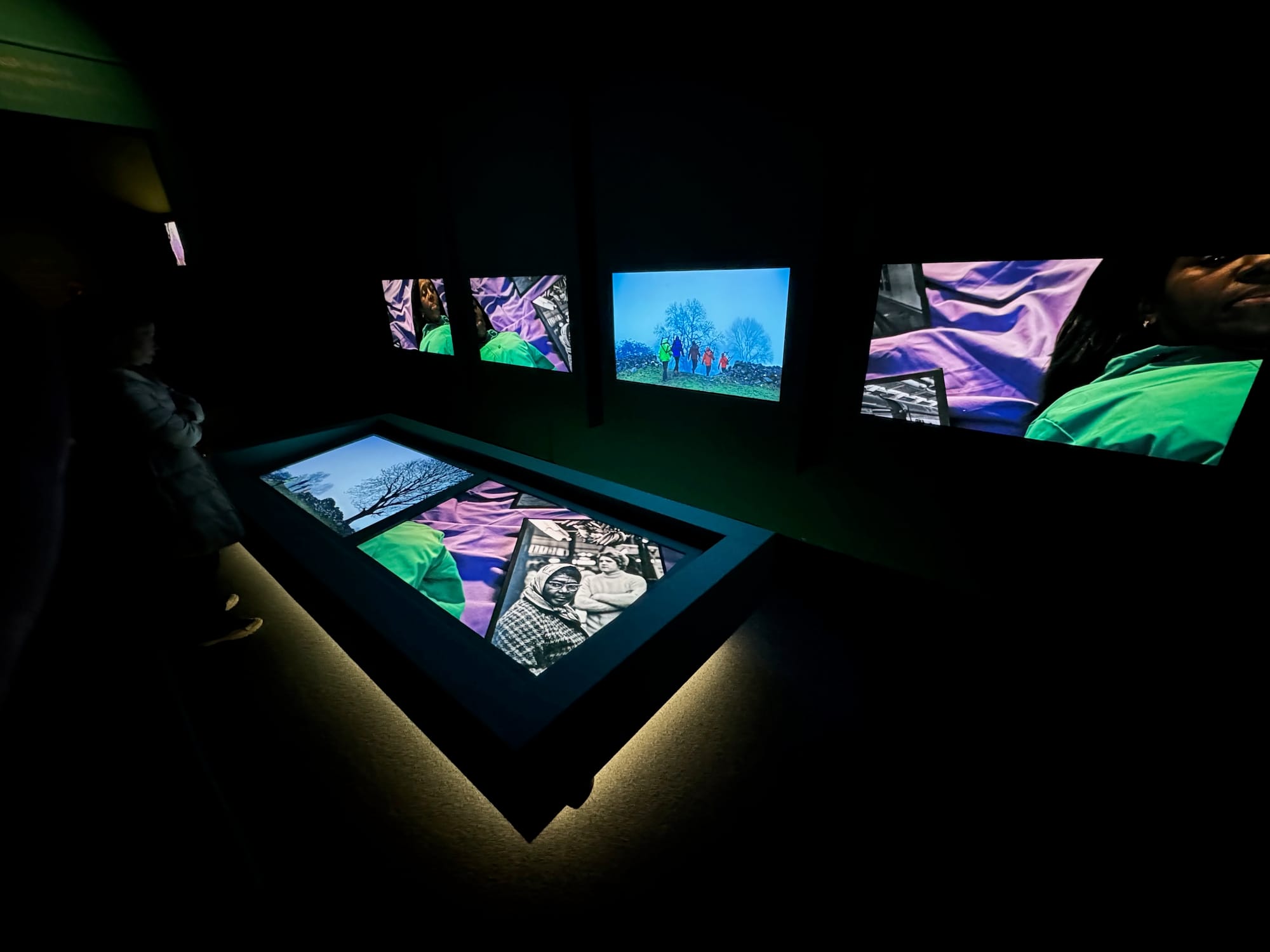 The artist also cites academic Steven Feld’s term “acoustemology” in this installation, which indicates a sonic way of being and existing in the world, and he uses sound throughout in a manner that feels more complex than his previous work. Akomfrah threads a needle to connect stories from places as disparate as Kenya, Scotland, and Bangladesh, to address how the demographics and culture of the UK are a product of natural and unnatural forces that continue to warp and influence the world daily. Above one of the installation’s many doorways, a quote from Édouard Glissant reads, “We know ourselves as part and as crowd, in an unknown that does not terrify. We cry our cry of poetry. Our boats are open, and we sail them for everyone.” This statement captures the wish that appears to be at the core of this conceptual treasure house. — HV