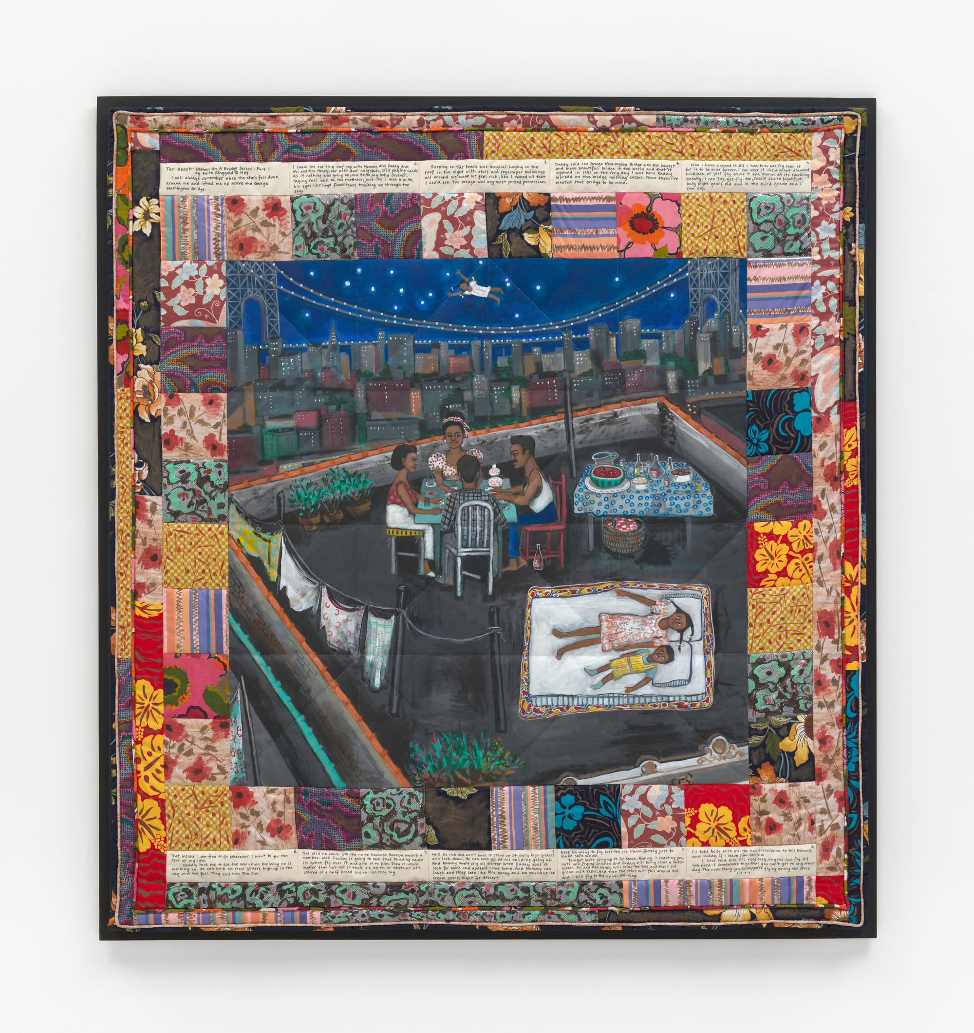 In Faith Ringgold’s “Woman on a Bridge #1 of 5: Tar Beach” (1988), a family gathers on a Harlem roof, the George Washington Bridge spanning the horizon line and Ringgold herself aloft in the starlit sky. The Guggenheim will pair Ringgold’s iconic quilt with related works, including pieces by those who inspired her, like Picasso, and those she in turn inspired, like Sanford Biggers.