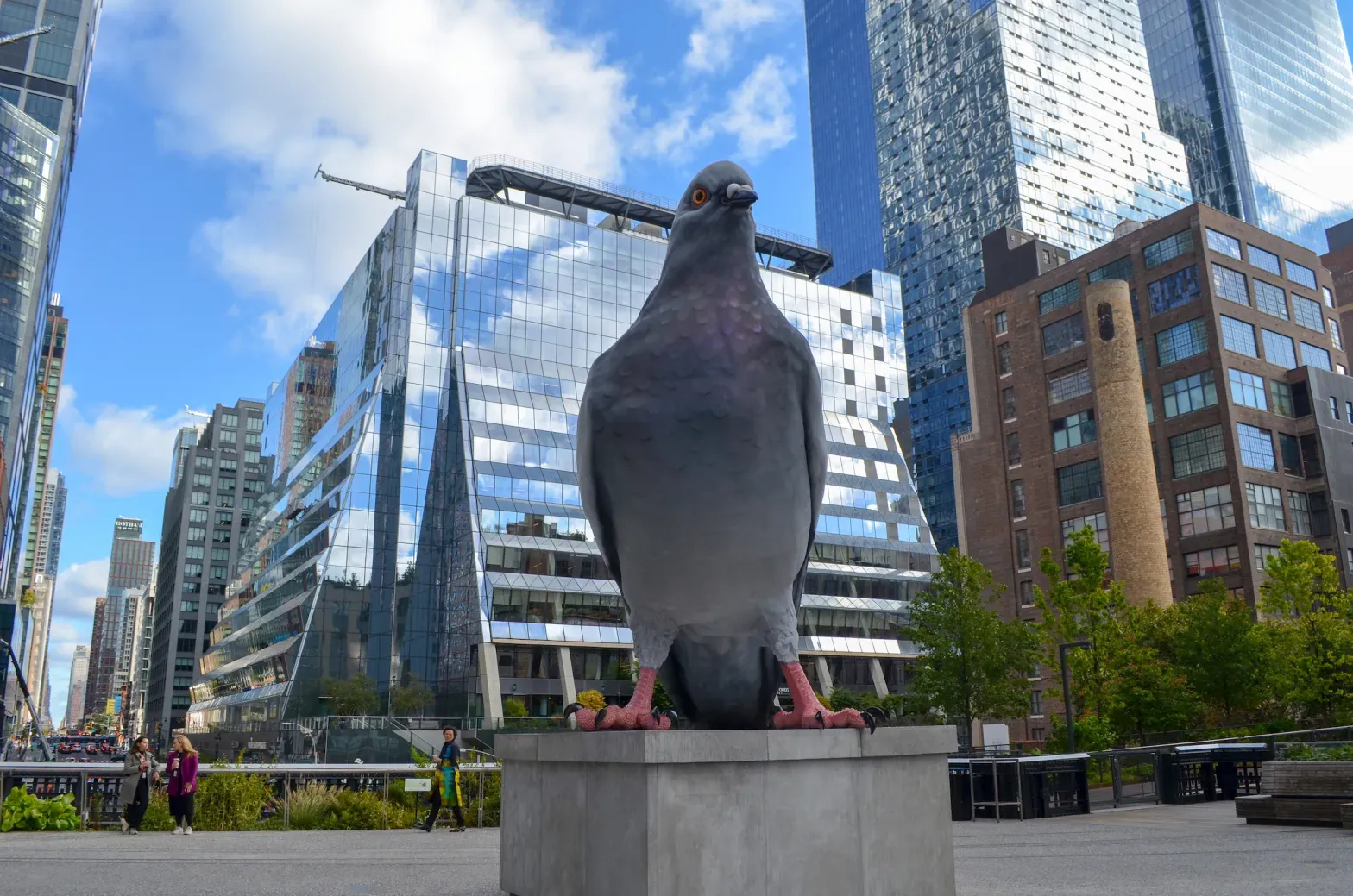 Colombian artist Iván Argote reimagines New York City's most polarizing bird on a massive scale for Chelsea's elevated public park. Perched above 10th Avenue on a concrete plinth, this 2,000-pound, nearly 16-foot-tall hand-painted sculpture is both a humorous commemoration of the pigeon and a thought-provoking installation that raises questions about the transformation of urban landscapes and the historical narratives embedded in monuments.